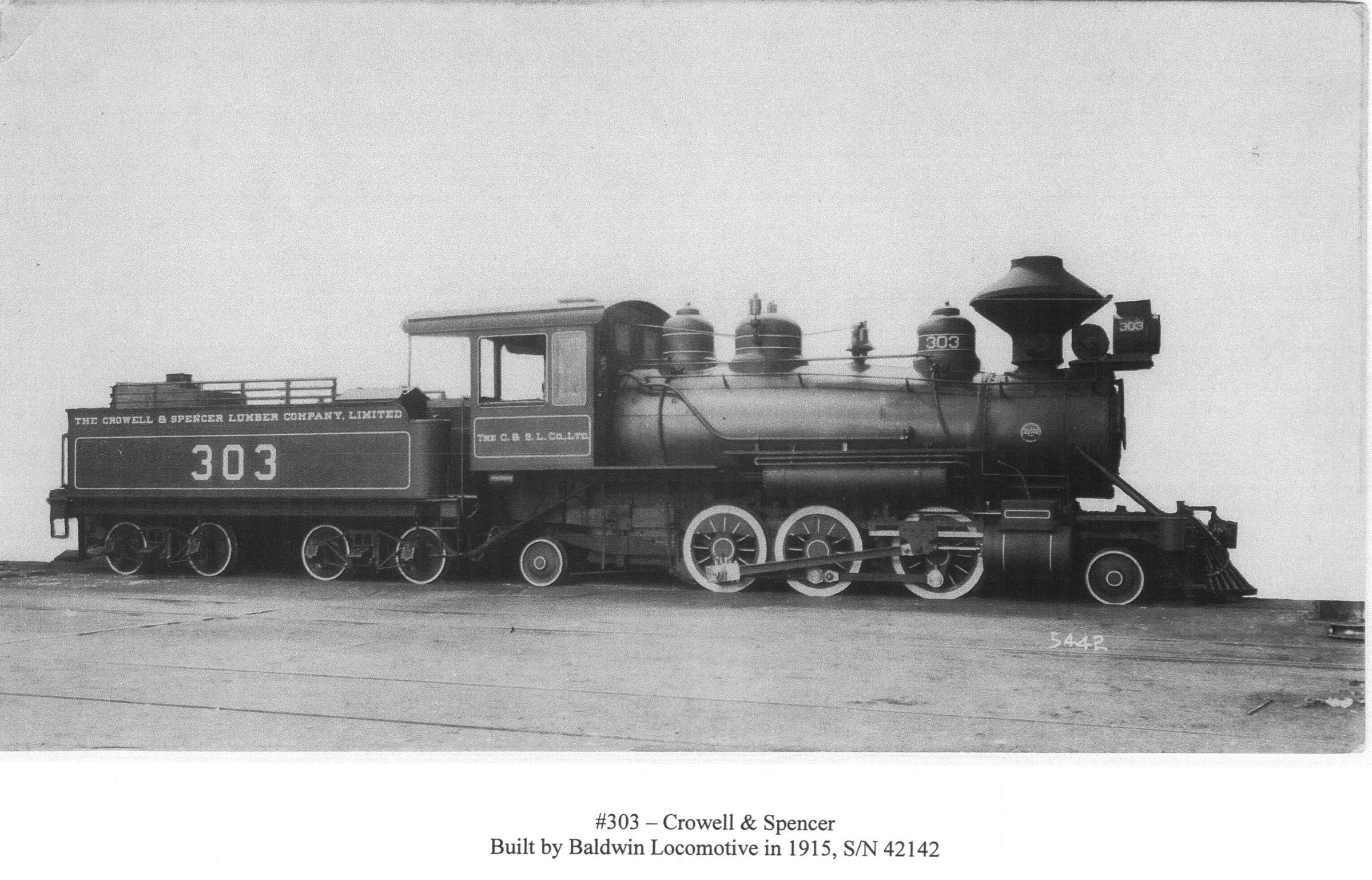 2-6-2 #303 engine; by Baldwin Locomotive; the fourth locomotive bought by Crowell & Spencer Lumber Co.; the first rod engine of Crowell & Spencer Lumber Co.Photograph Details