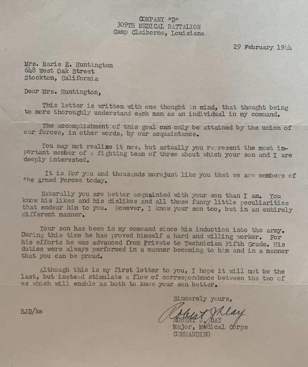 Exchanged letters between Major Robert J. Day, commanding officer of the Medical Corps at Camp Claiborne, LA and Mrs. Marie E. Huntington of Stockton, California. Major Day sent a letter on 29 February, 1944 to Mrs. Huntington in order to get more information on her son who was serving at Camp Claiborne at the time; and Mrs. Huntington replied with a letter on 13 March, 1944.Context
