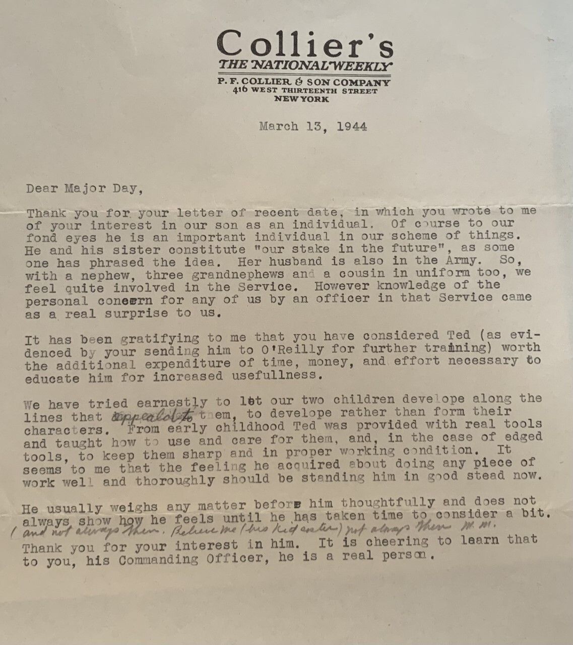 Major Day, who was the commanding officer of the 309th Medical Corps sent a letter to Mrs. Huntington in order to gain a better understanding of her son.Date(s) of Creation
