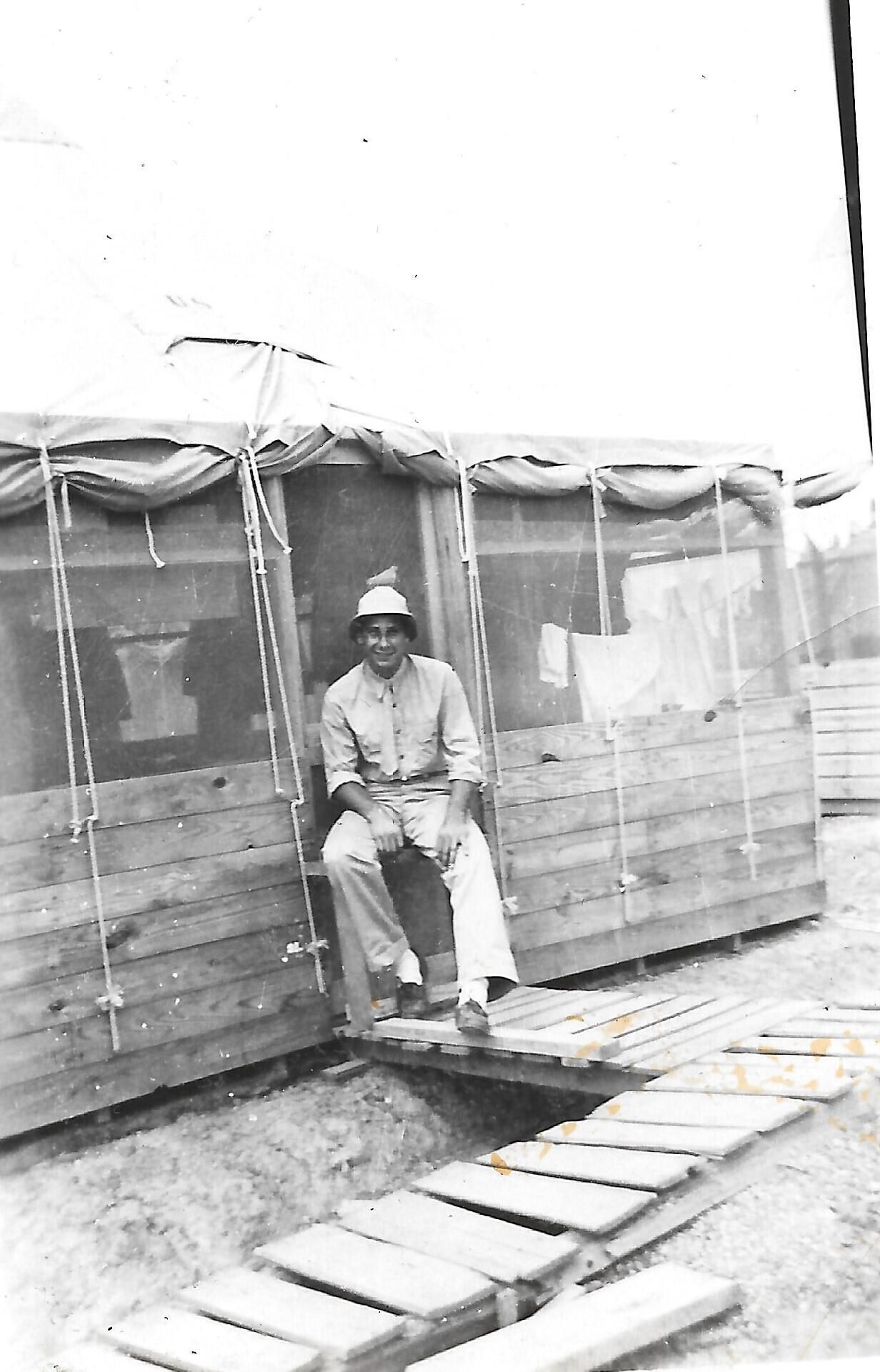 Shows a soldier, not in full regalia, sitting outside of a command or artillery tentPhotograph Details