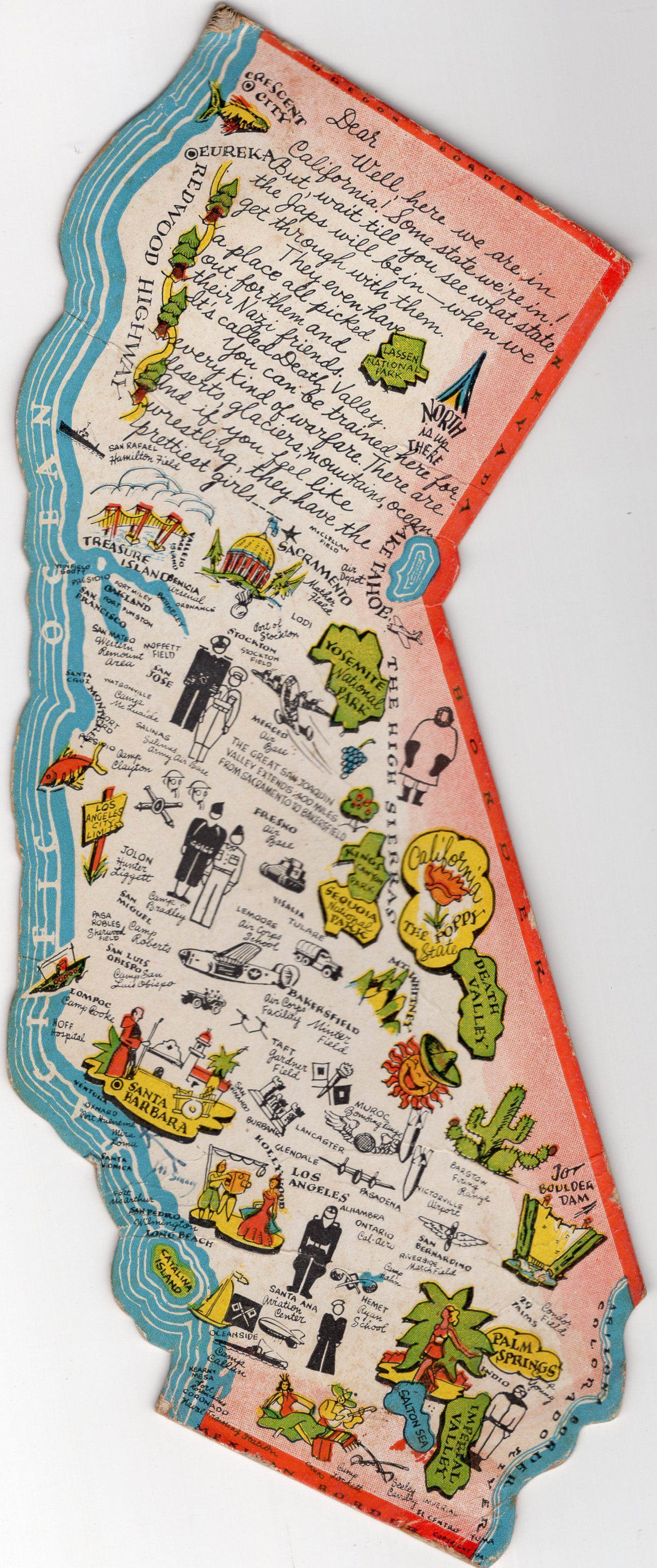WWII-era postcard in the shape of California. The postcard contains a note on the front as well as drawings of locations in California as well as cities and military bases.Context