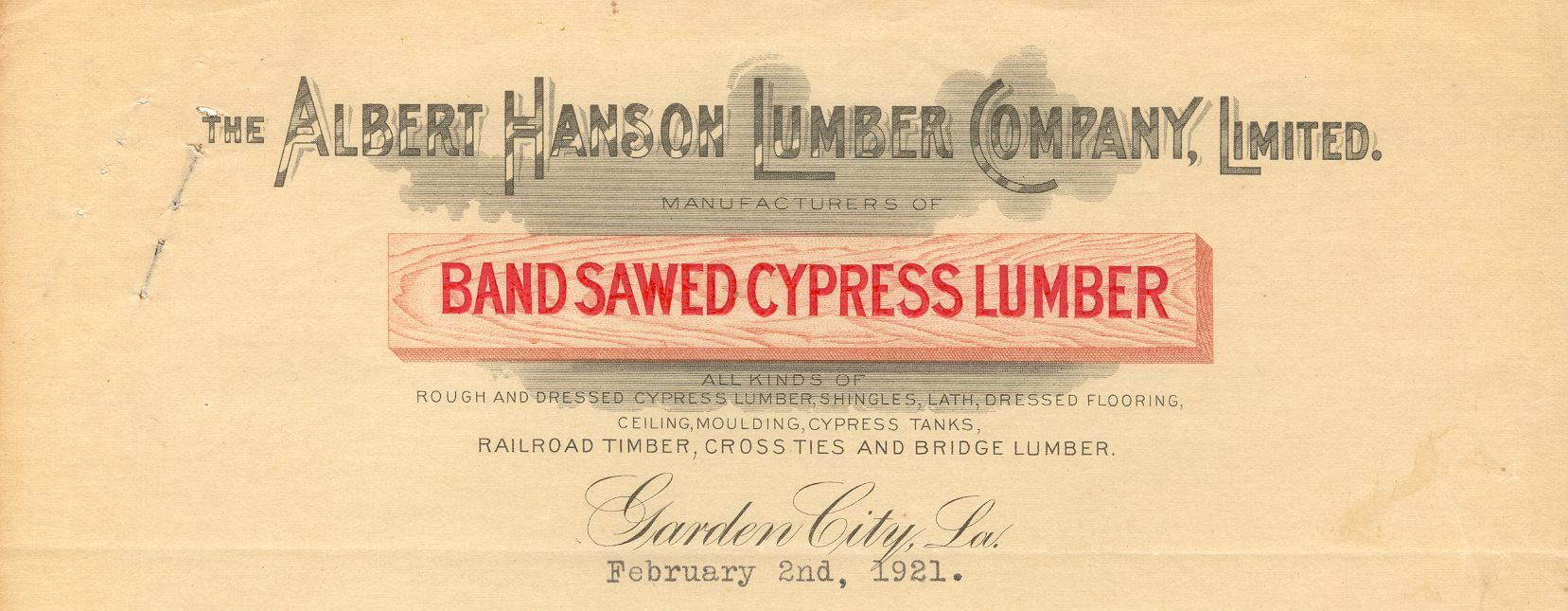 The Albert Hanson Lumber Company Limited began operations in Louisiana during the roaring twenties. The company specialized in cypress lumber production. However, the company was forced to close down due to local resources drying up.Collection