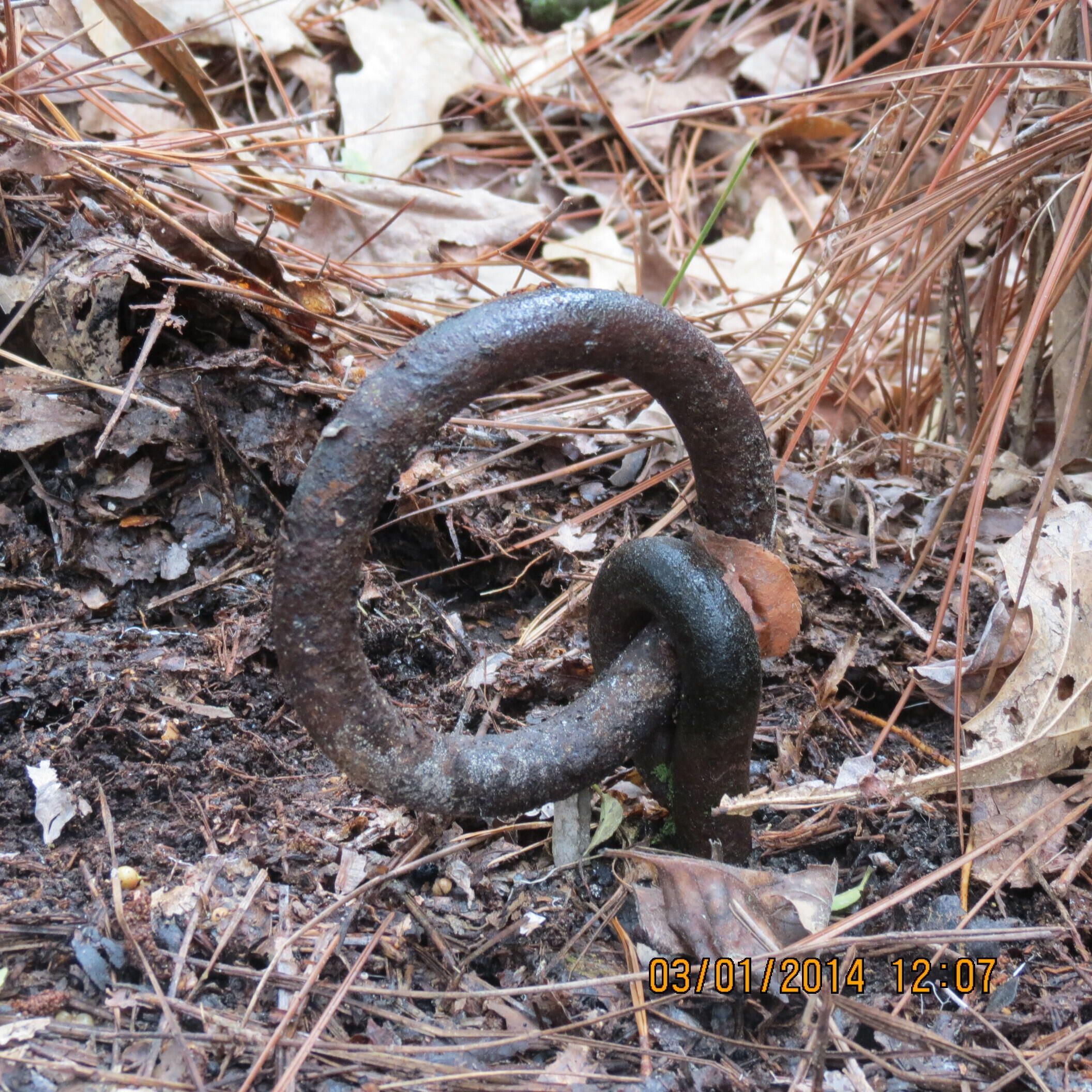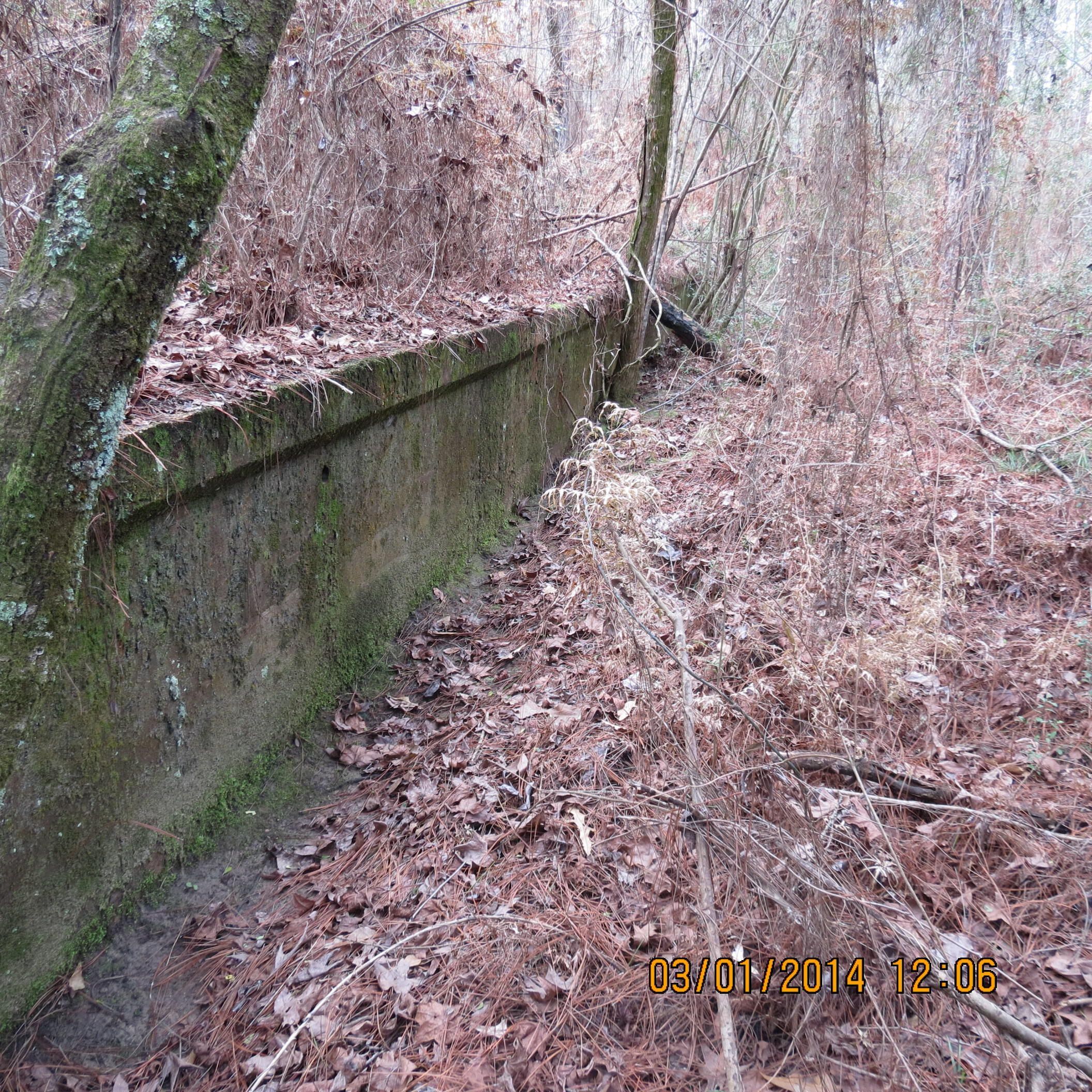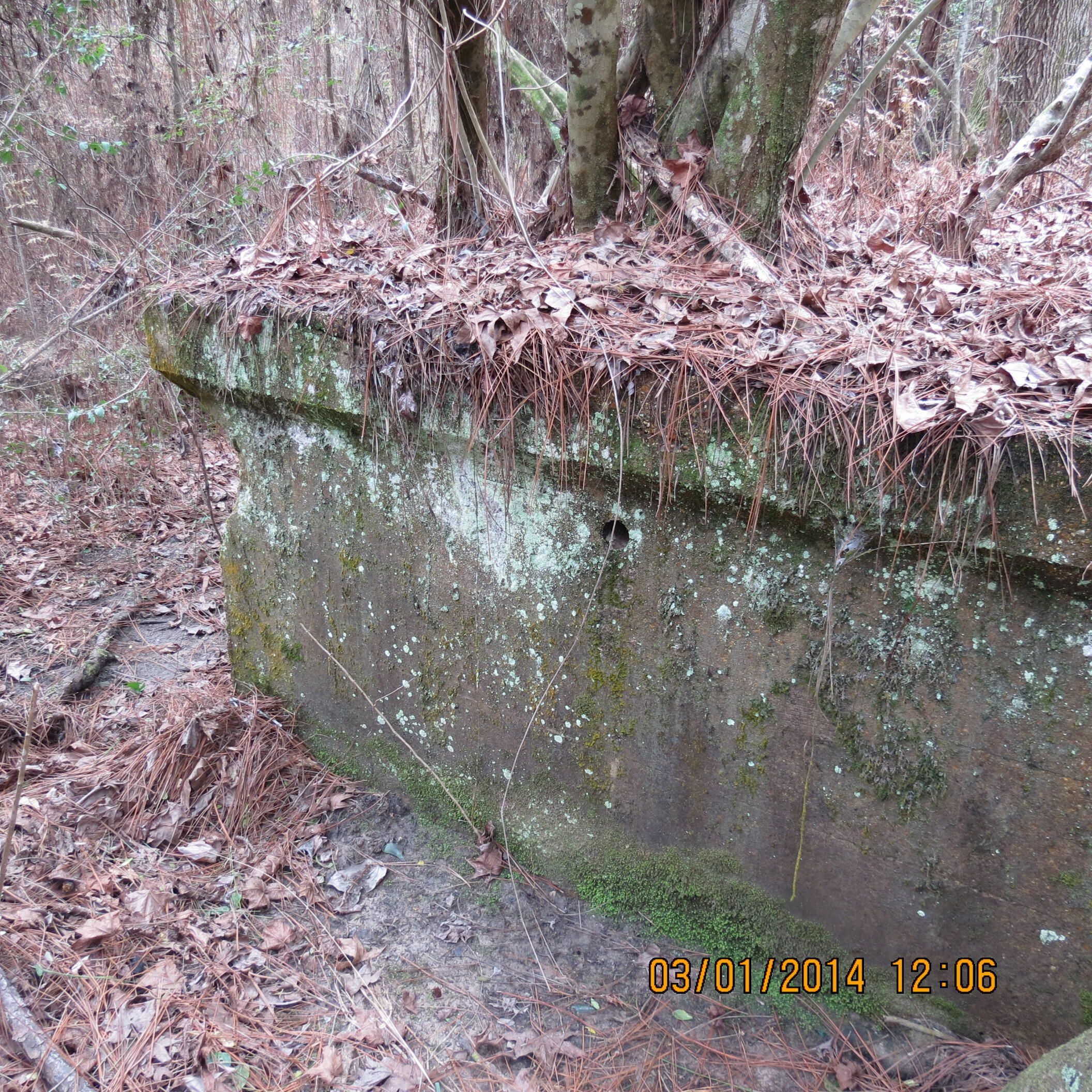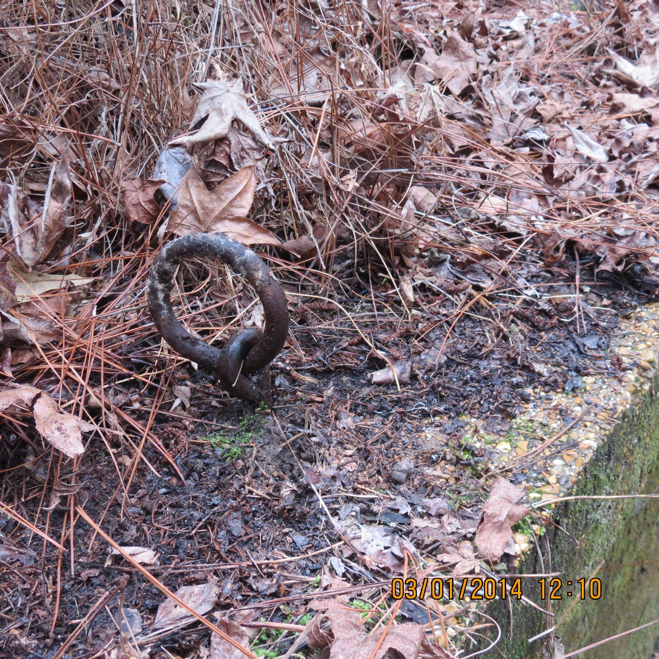 the remains of the base for a tent theater in the Black troop area at Camp Claiborne; the rings in the foundation were used as the place to tie (anchors) the ropes for the tentPhotograph Details