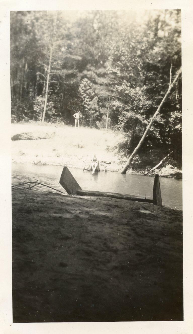 Spring Creek passing through the outside of Camp Claiborne, with two men taking a break from the heat in the cool waterPhotograph Details