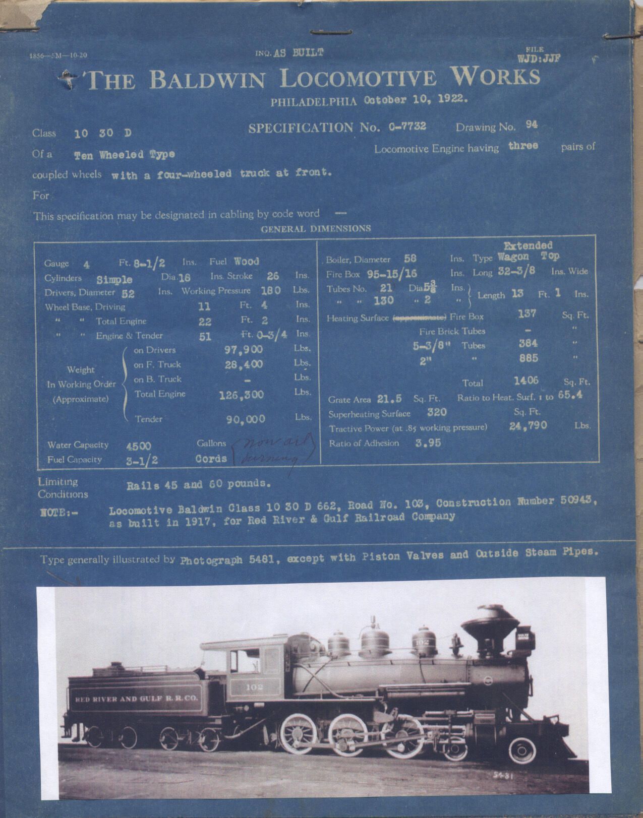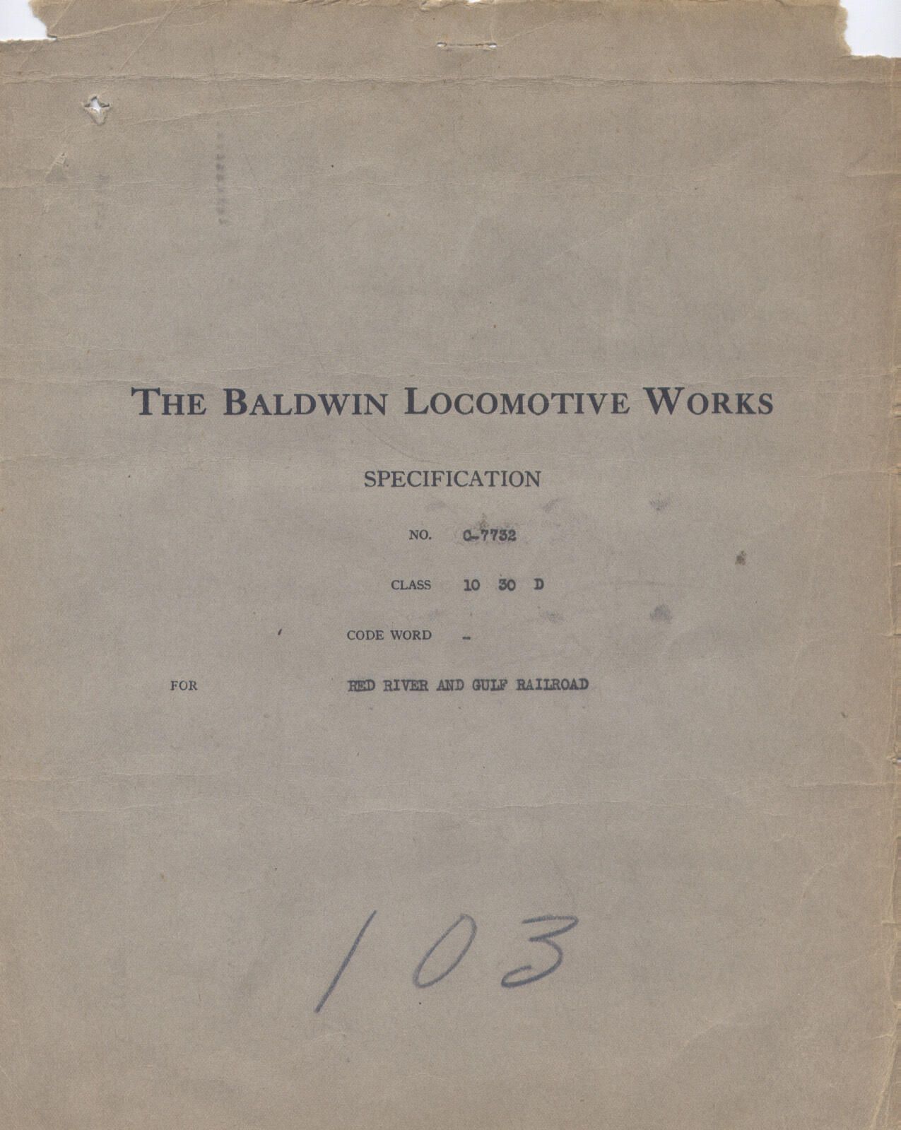 the specifications of the Baldwin Locomotive, # 103 No. O-7732, class 10 30 D; bought by the Red River & Gulf Railroad Co. in December 1918; used from Long Leaf to KurthwoodContext