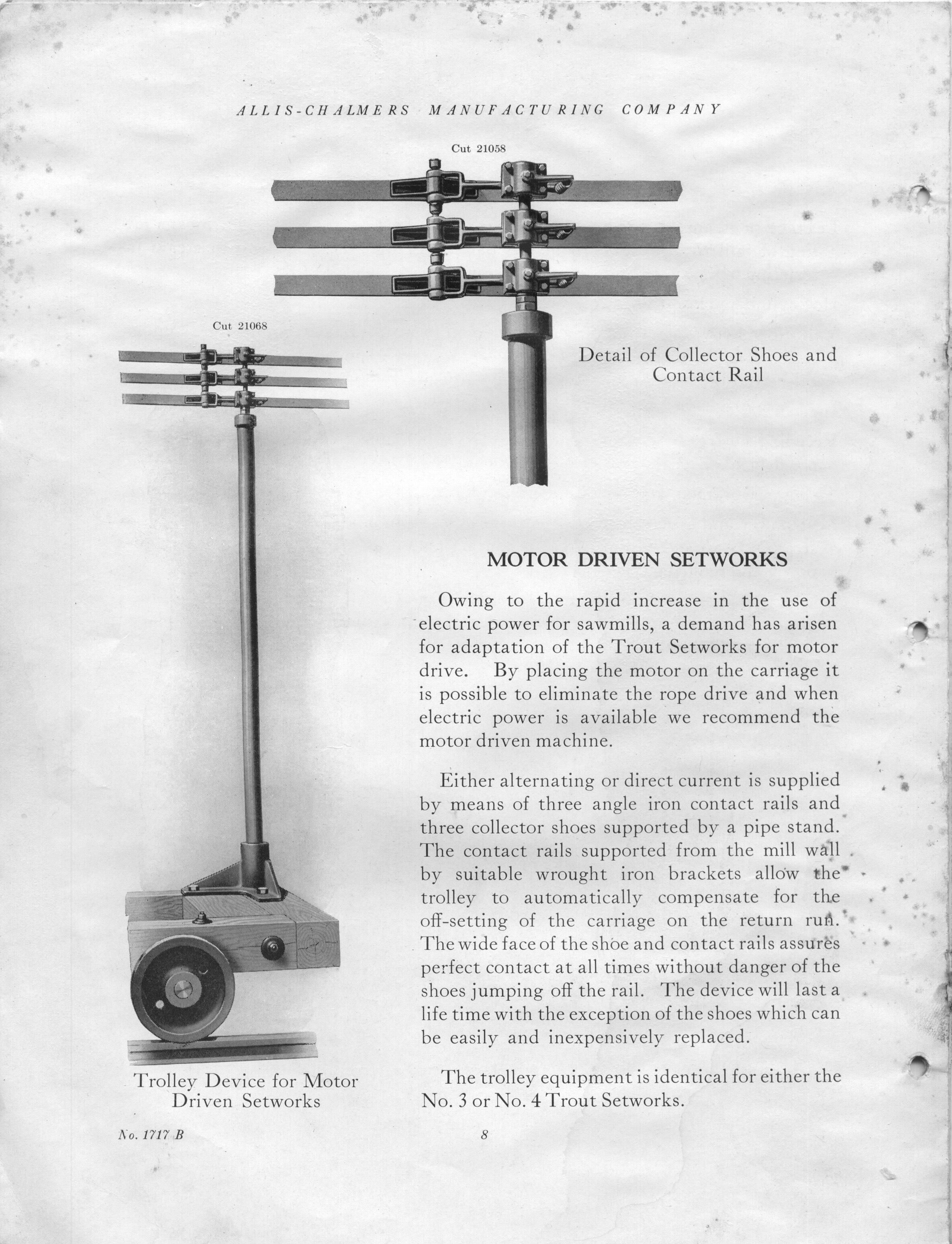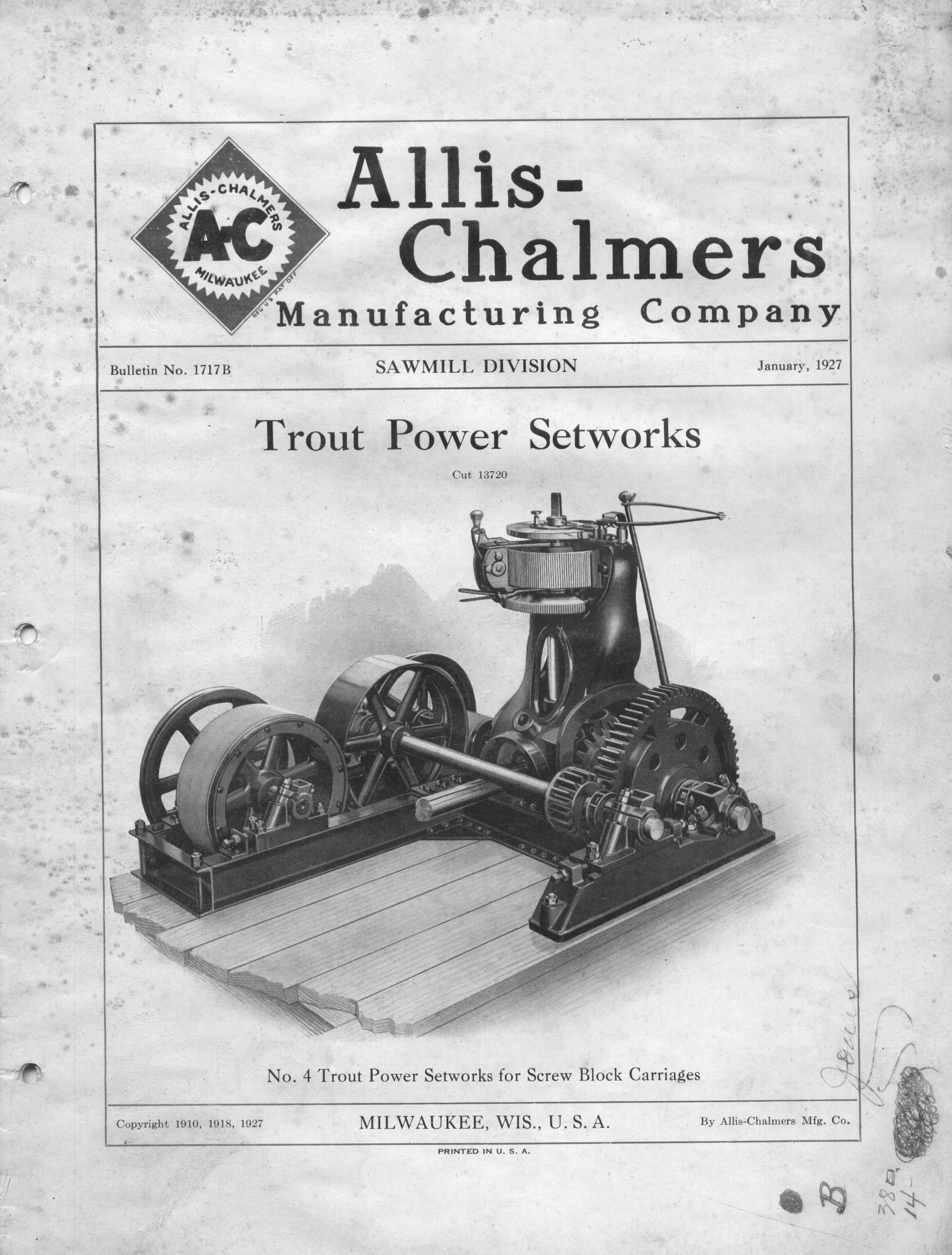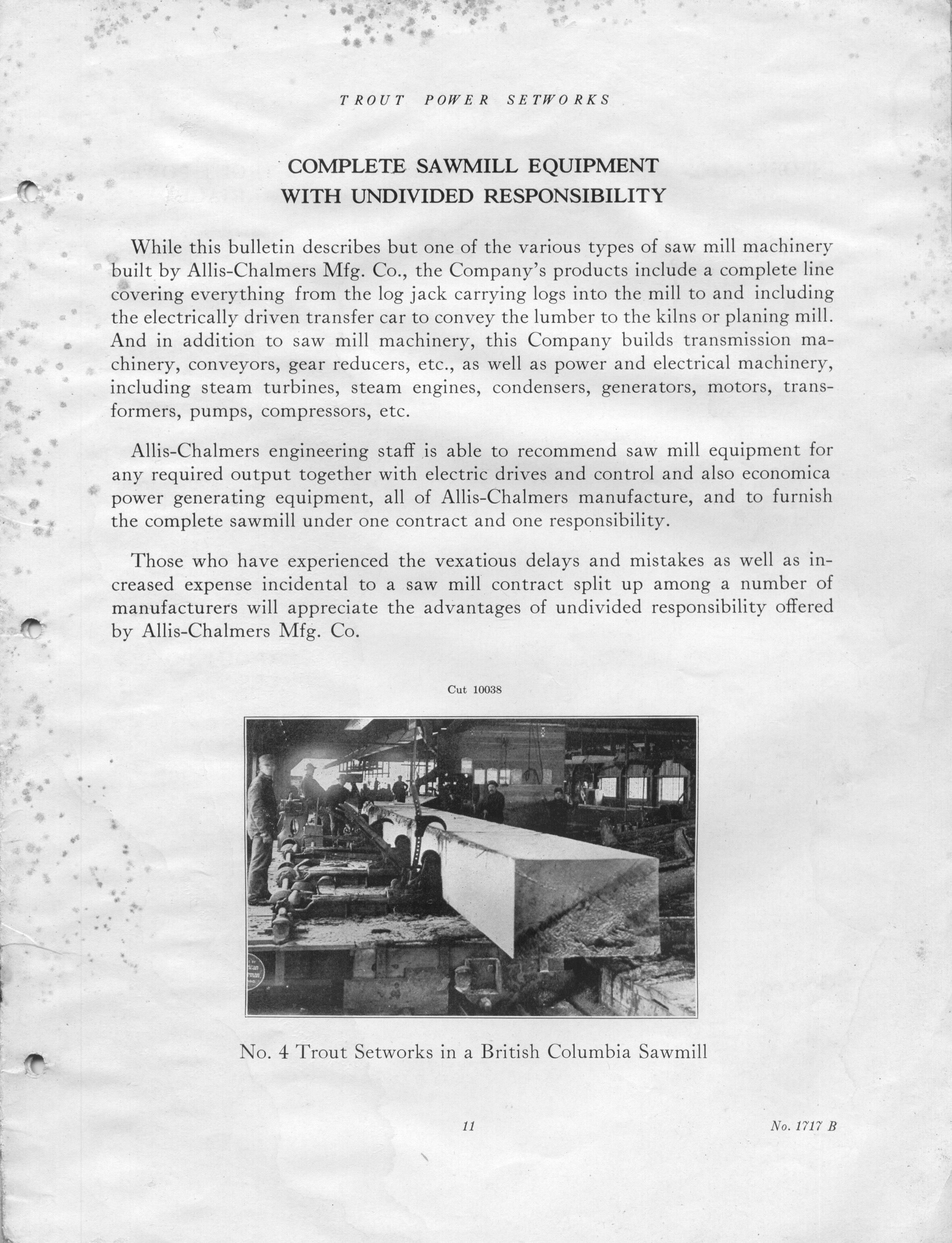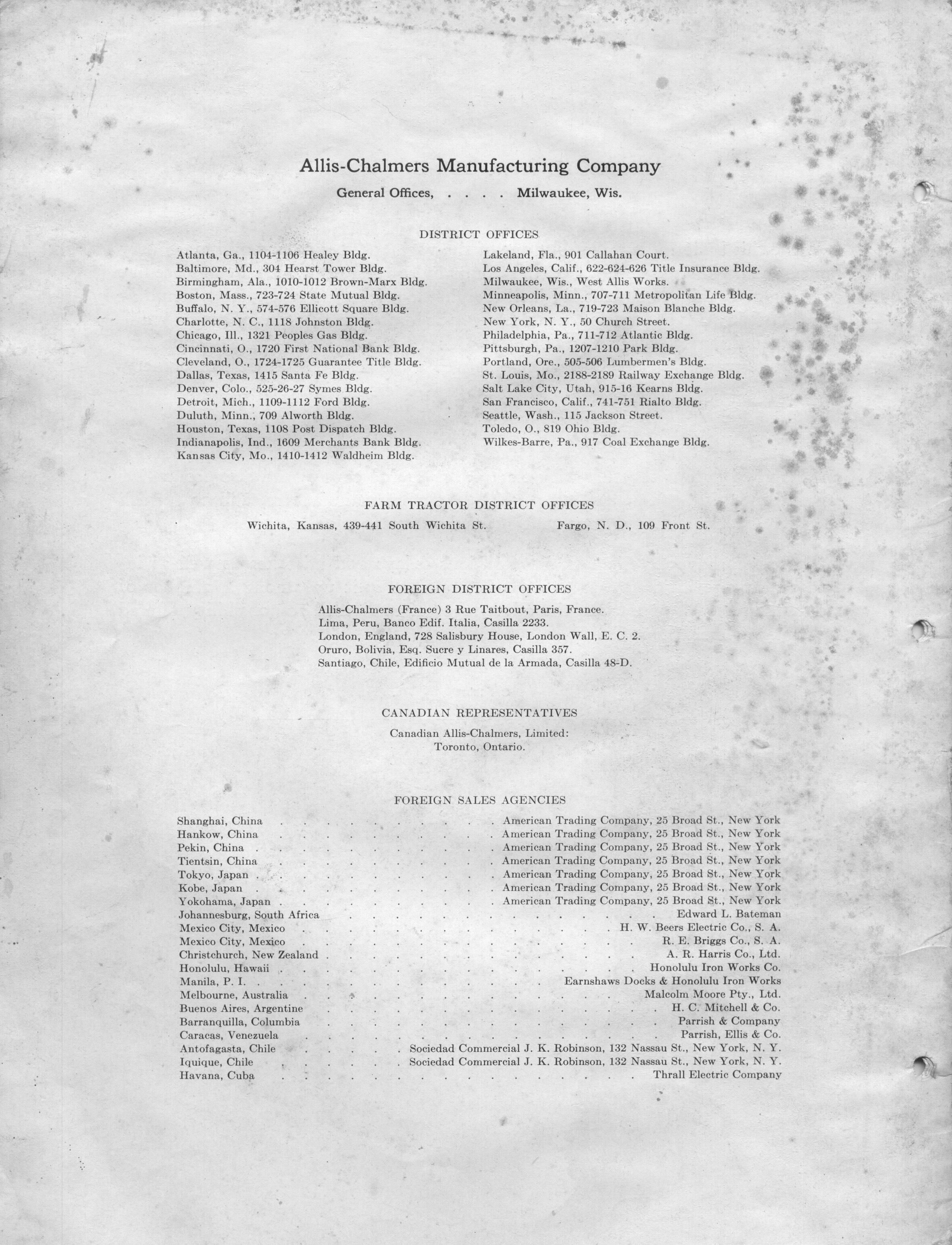 has equipment of air brakes, air compressors, blowing engines, cement machinery, chilled rolls, coal mining machinery, condensers, Corliss engines, crushing machinery, dredges, engines, electrical apparatus (alternating current, direct current, and switchboards for generators and motors), flour mill machinery, gas engines, hoisting engines, hydraulic machinery, mining machinery, perforated metals, power transmission machinery, pumping machinery, rolling mill engines, sugar machinery, sawmill machinery, steam shovels, timber preserving machinery, turbines-steam, and turbines-water