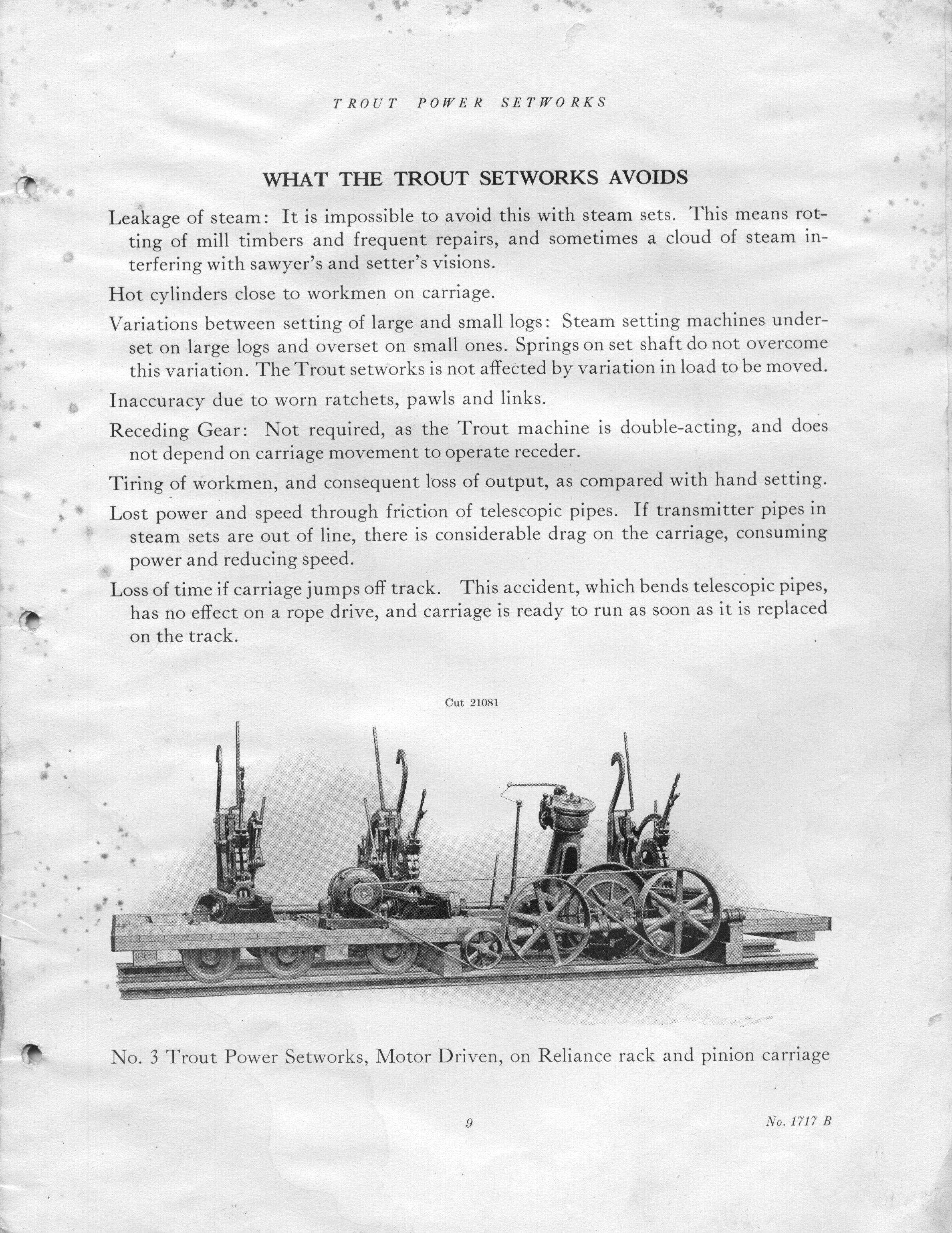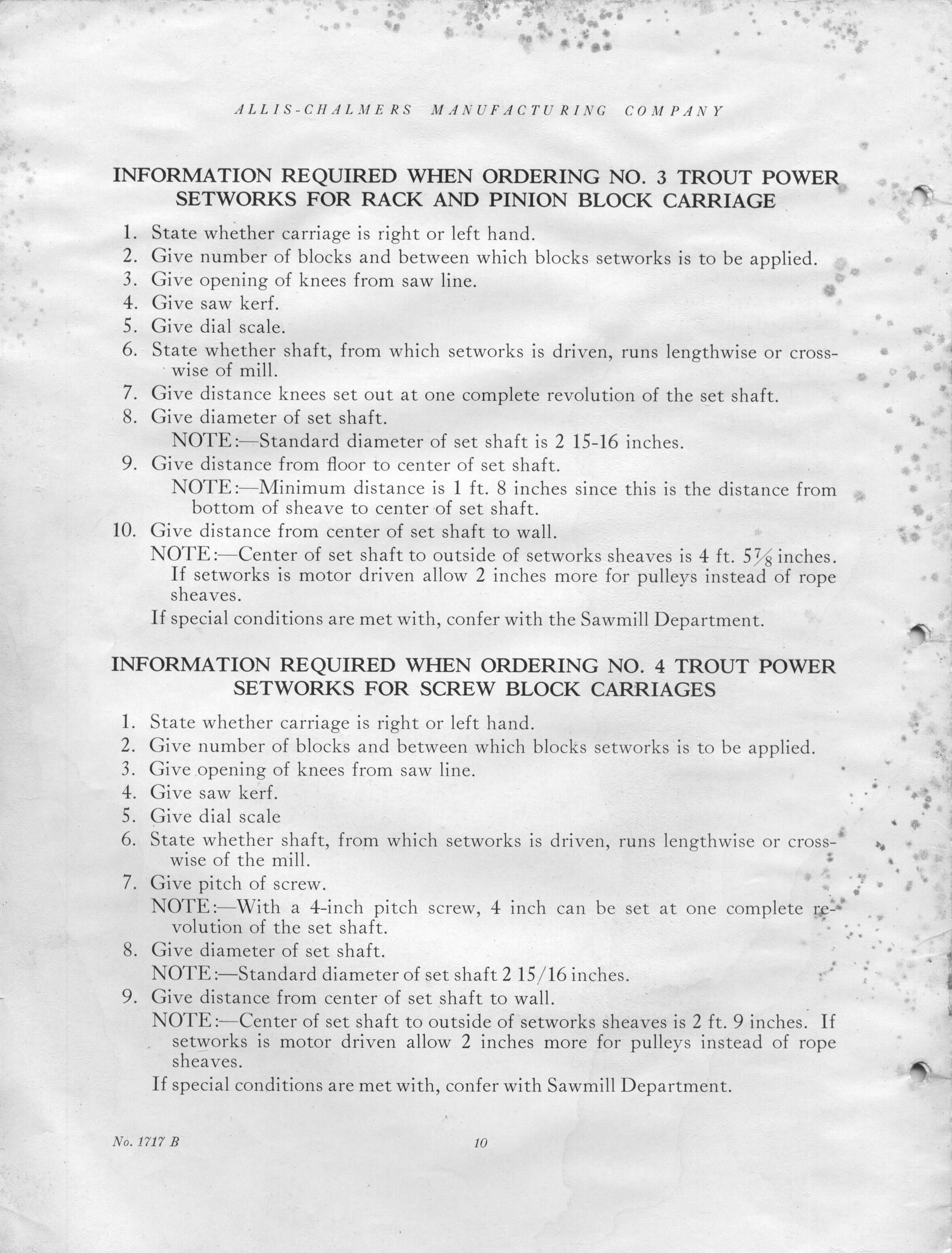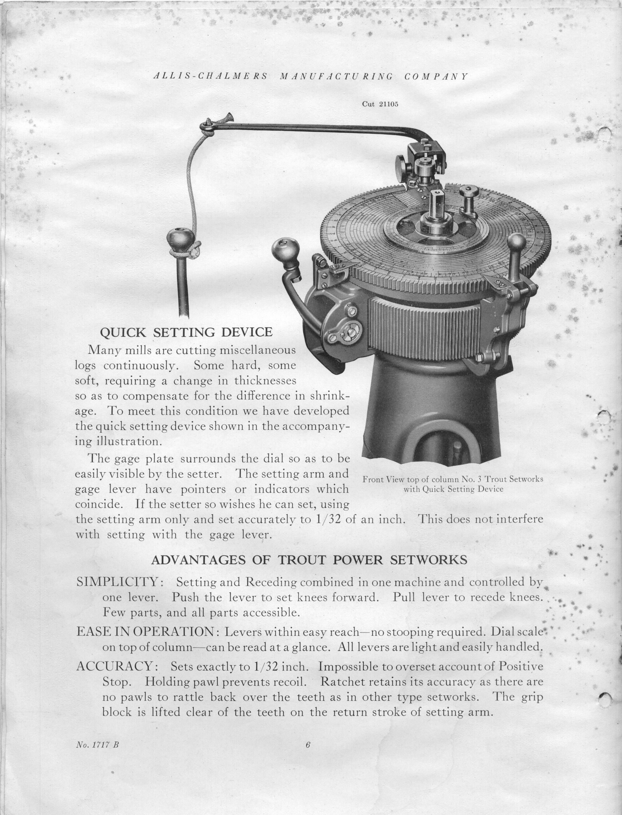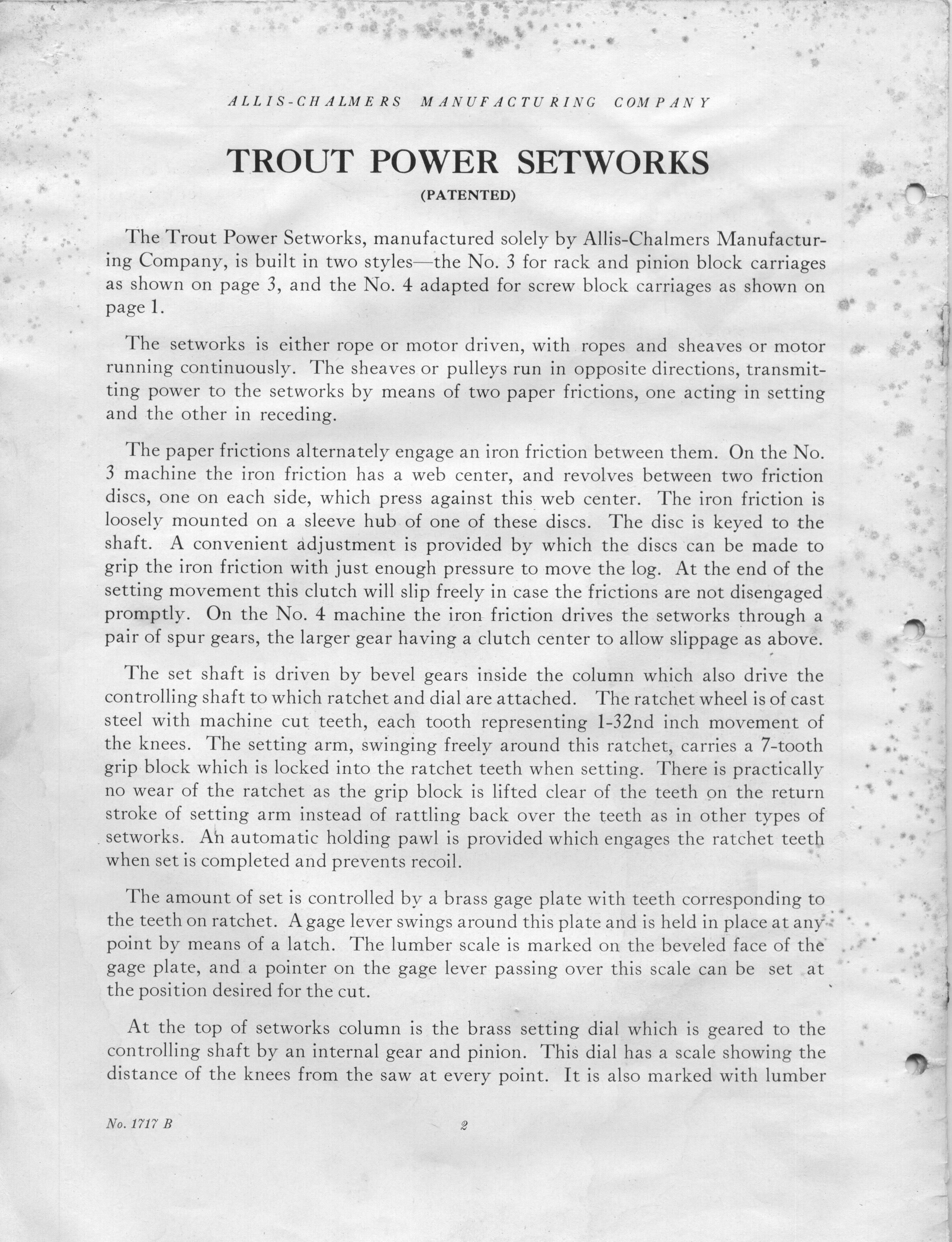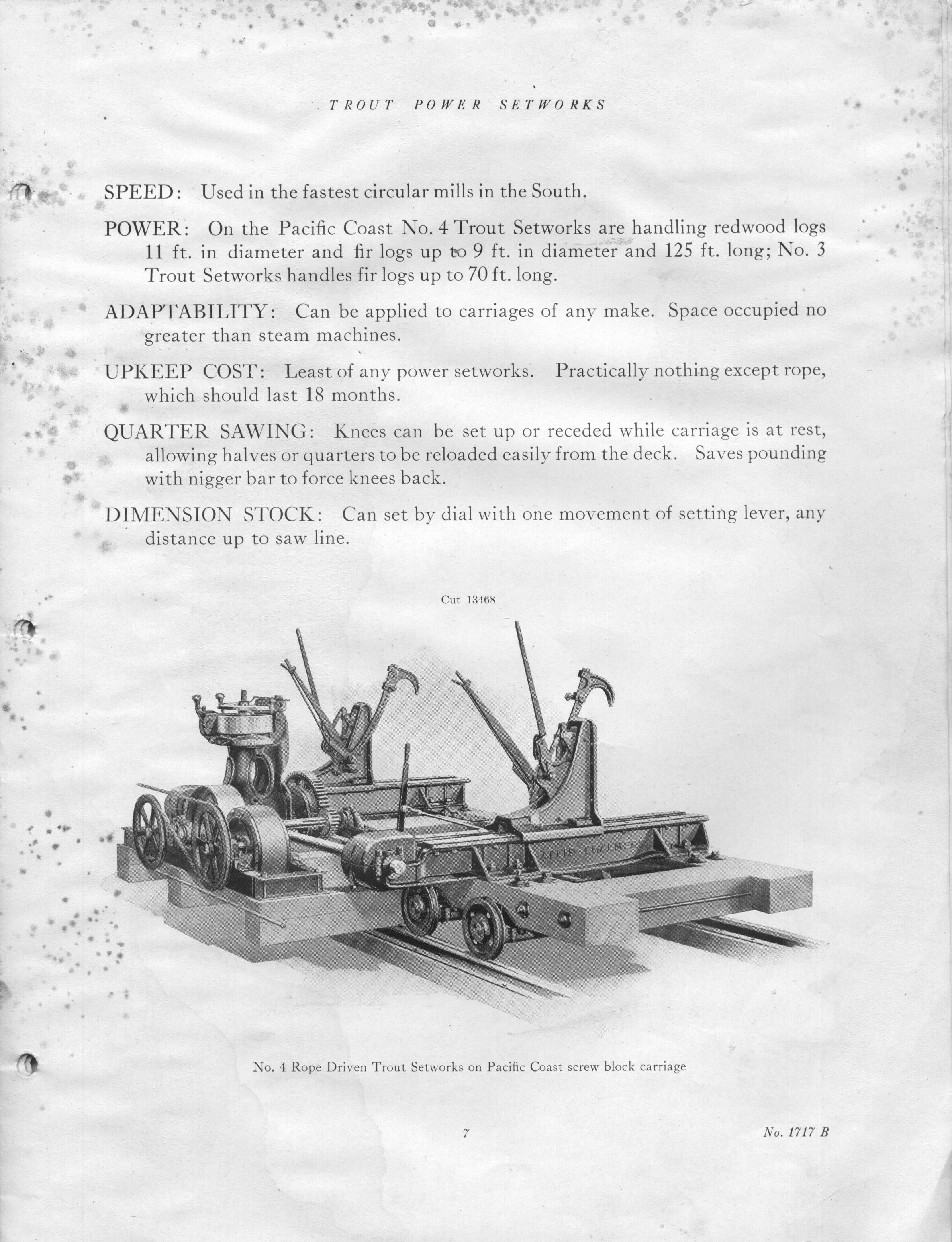 has equipment of air brakes, air compressors, blowing engines, cement machinery, chilled rolls, coal mining machinery, condensers, Corliss engines, crushing machinery, dredges, engines, electrical apparatus (alternating current, direct current, and switchboards for generators and motors), flour mill machinery, gas engines, hoisting engines, hydraulic machinery, mining machinery, perforated metals, power transmission machinery, pumping machinery, rolling mill engines, sugar machinery, sawmill machinery, steam shovels, timber preserving machinery, turbines-steam, and turbines-water