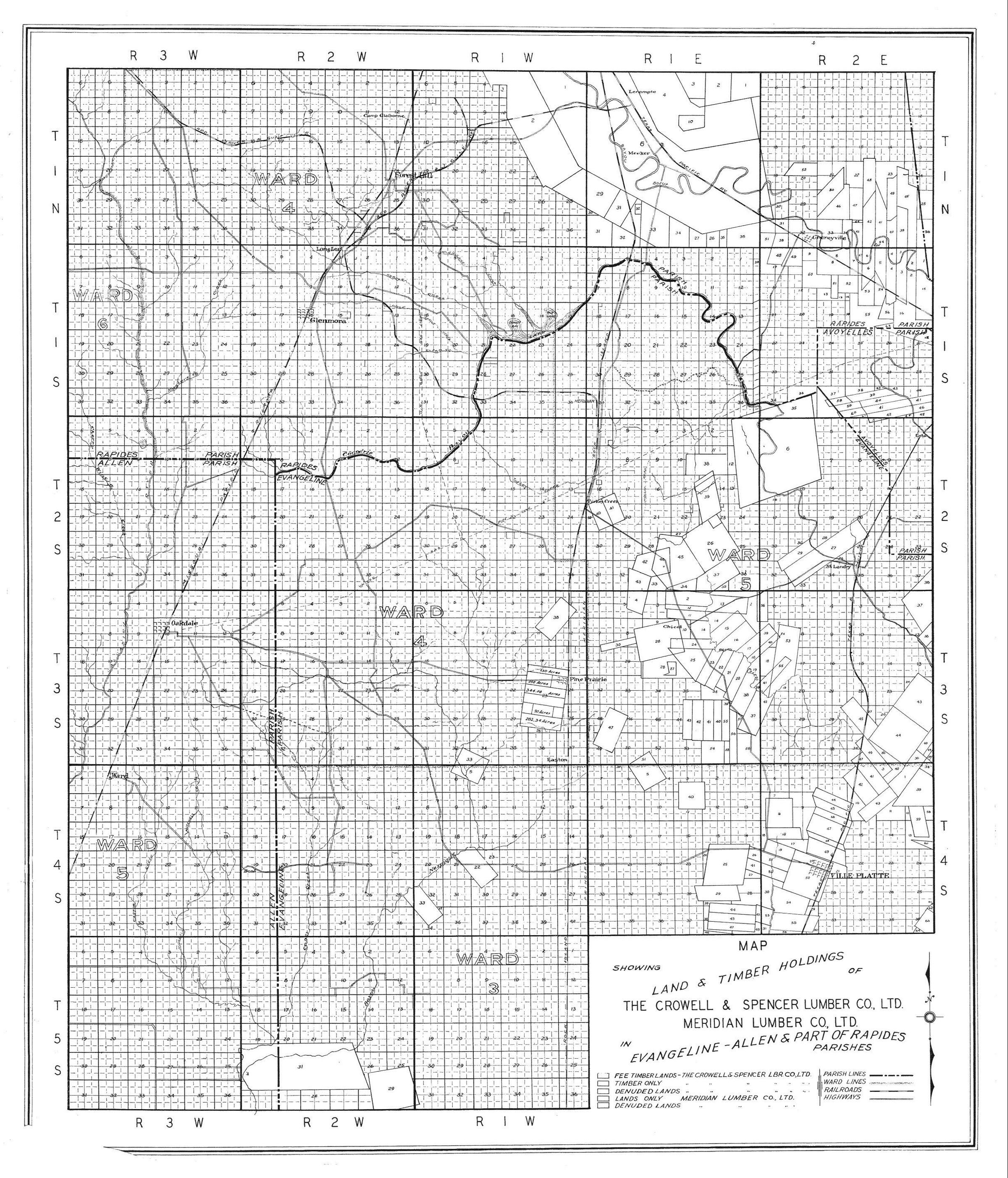 a map of the land and timber for the Crowell & Spencer Lumber Co. and the Meridian Lumber Co.; in the Evangeline and Allen Parishes and part of Rapides ParishContext