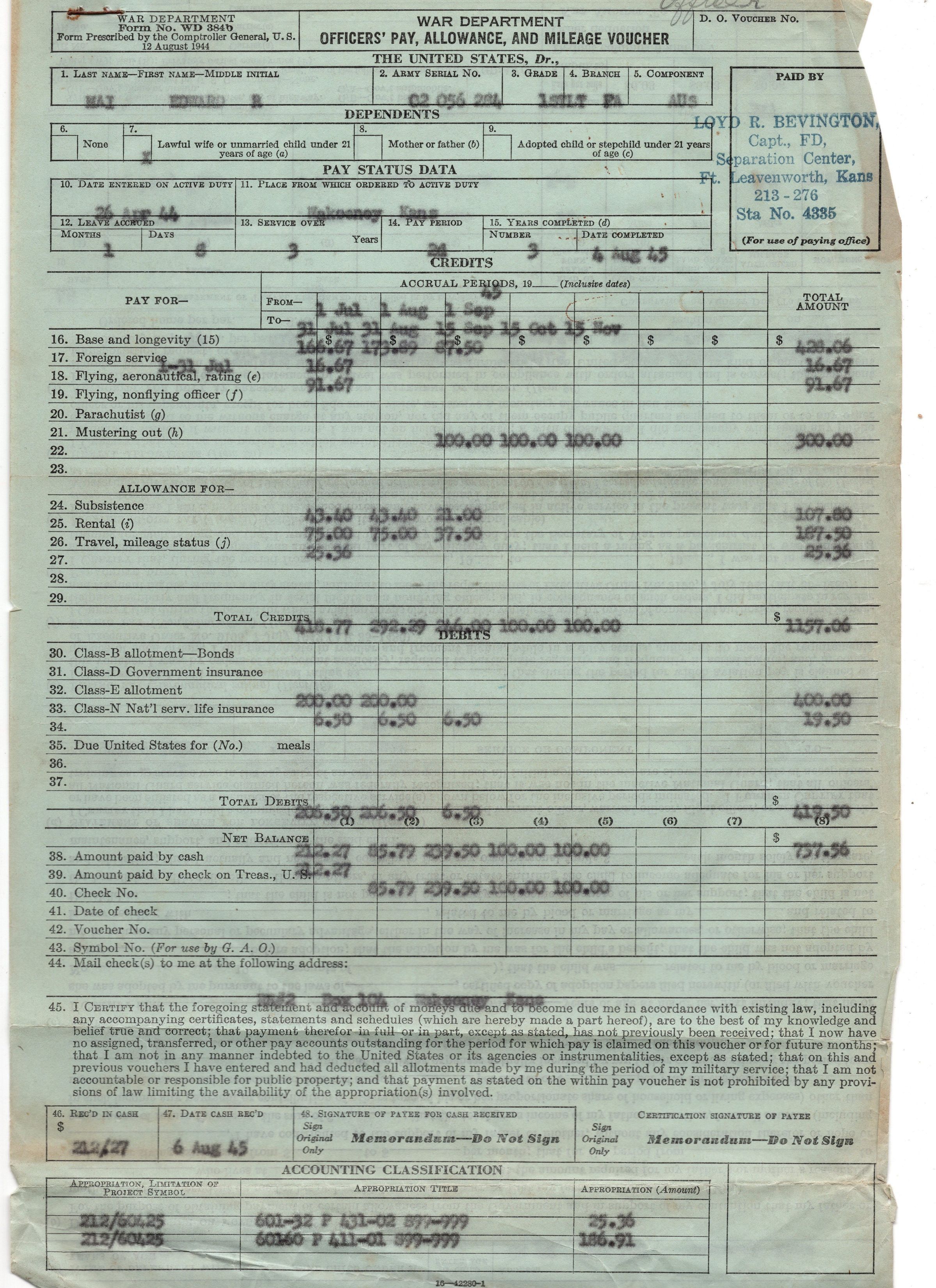 WWII-era pay form for Edward R Mai, this form was produced by the War Department and dictated "Officers' Pay, Allowance, And Mileage Voucher"