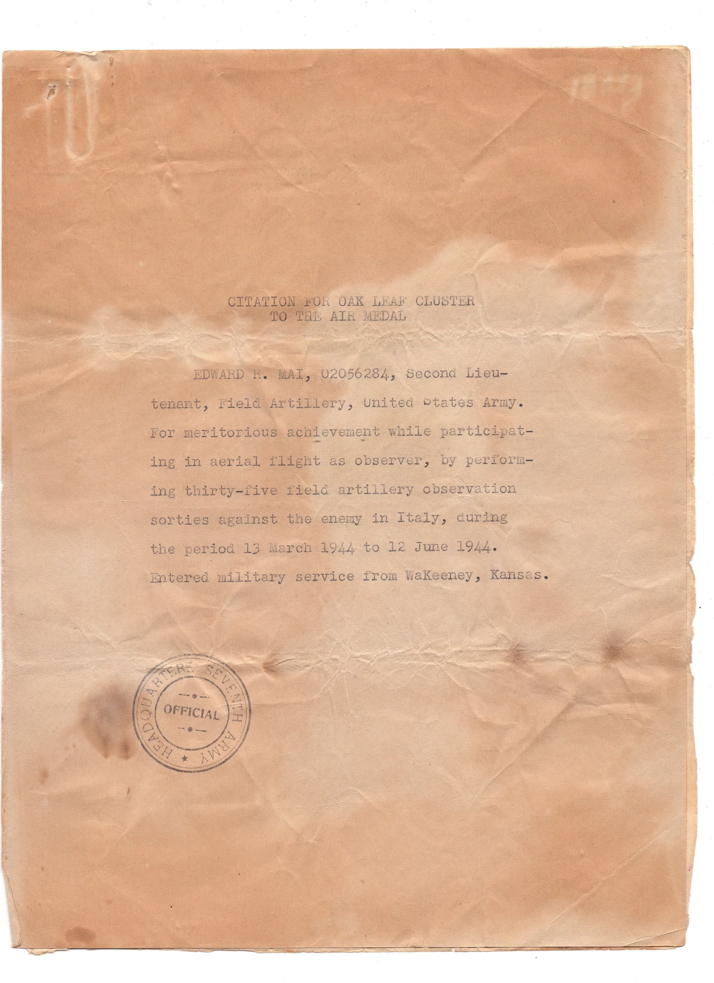 This item is a citation for an Oak Leaf Cluster to the Air Medal awarded to Edward R. MaiContext