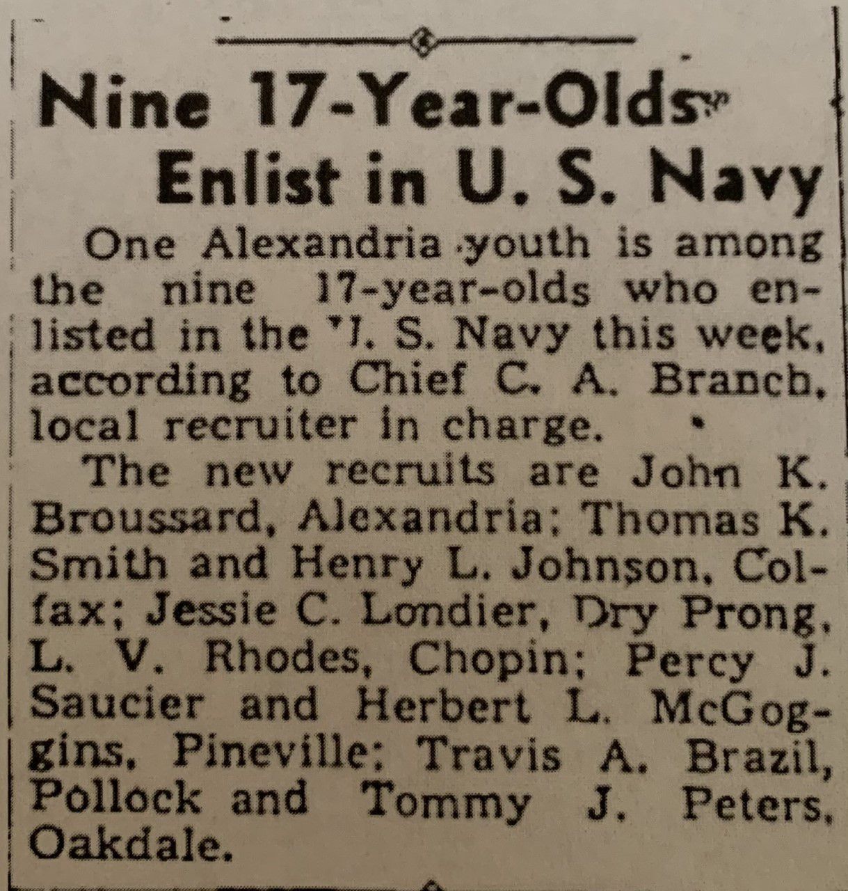 Central Louisiana local recruiter at the time, Chief C. A. Branch detailed nine 17-Year-Olds who enlisted into the U.S. Navy. Each of these nine enlistees were from the central Louisiana region.Parts