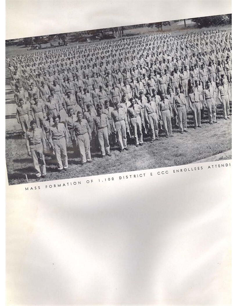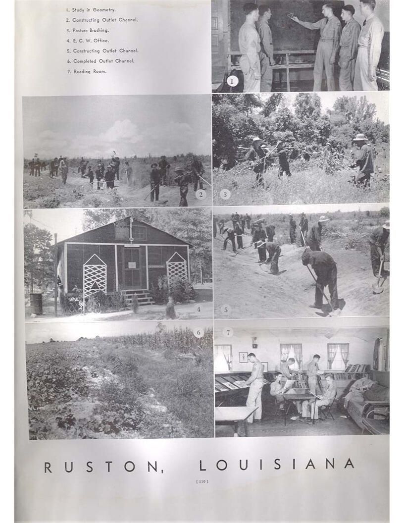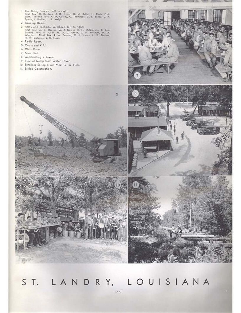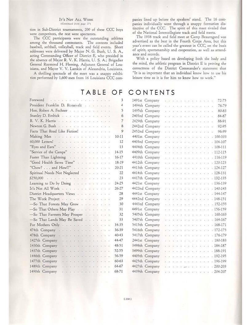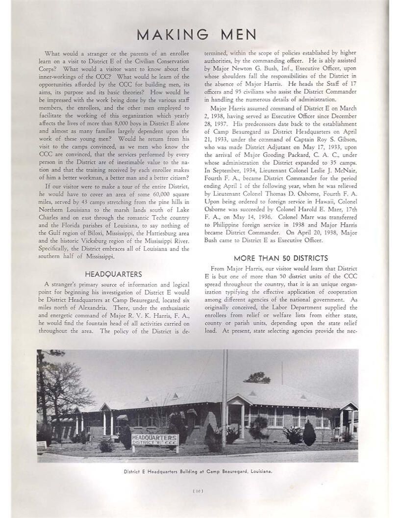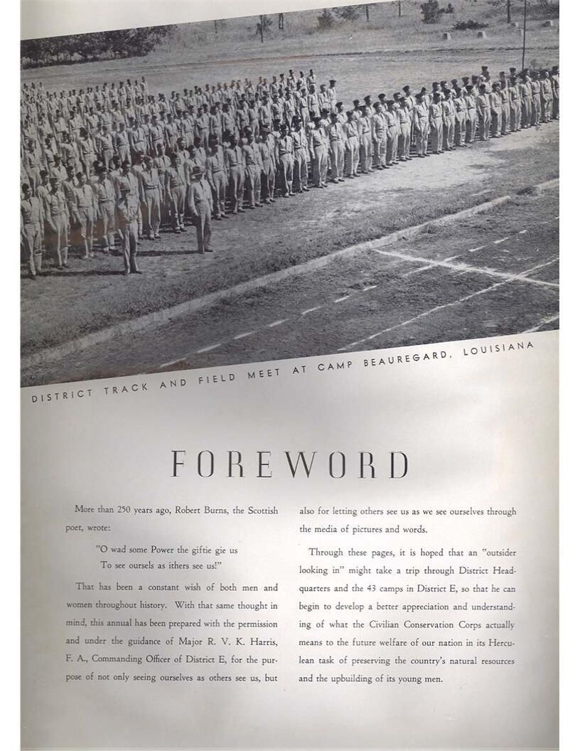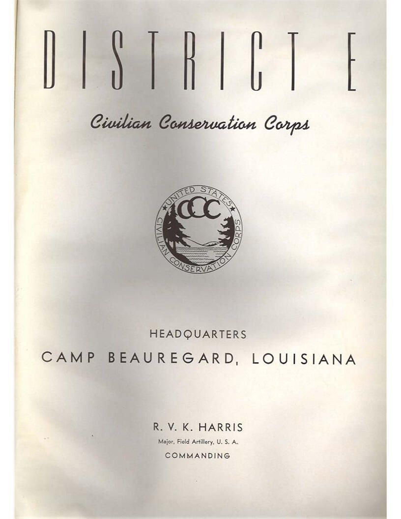 publication about District E of the CCC for the "outsider"; headquarters at Camp Beauregard, LA; Commanding officer at the time was Major R. V. K. Harris of Field Artilleries; brief history of the creation of CCC; what the CCC has been doing and how they're living; then lists off the 43 companies in District E with group photosCollection