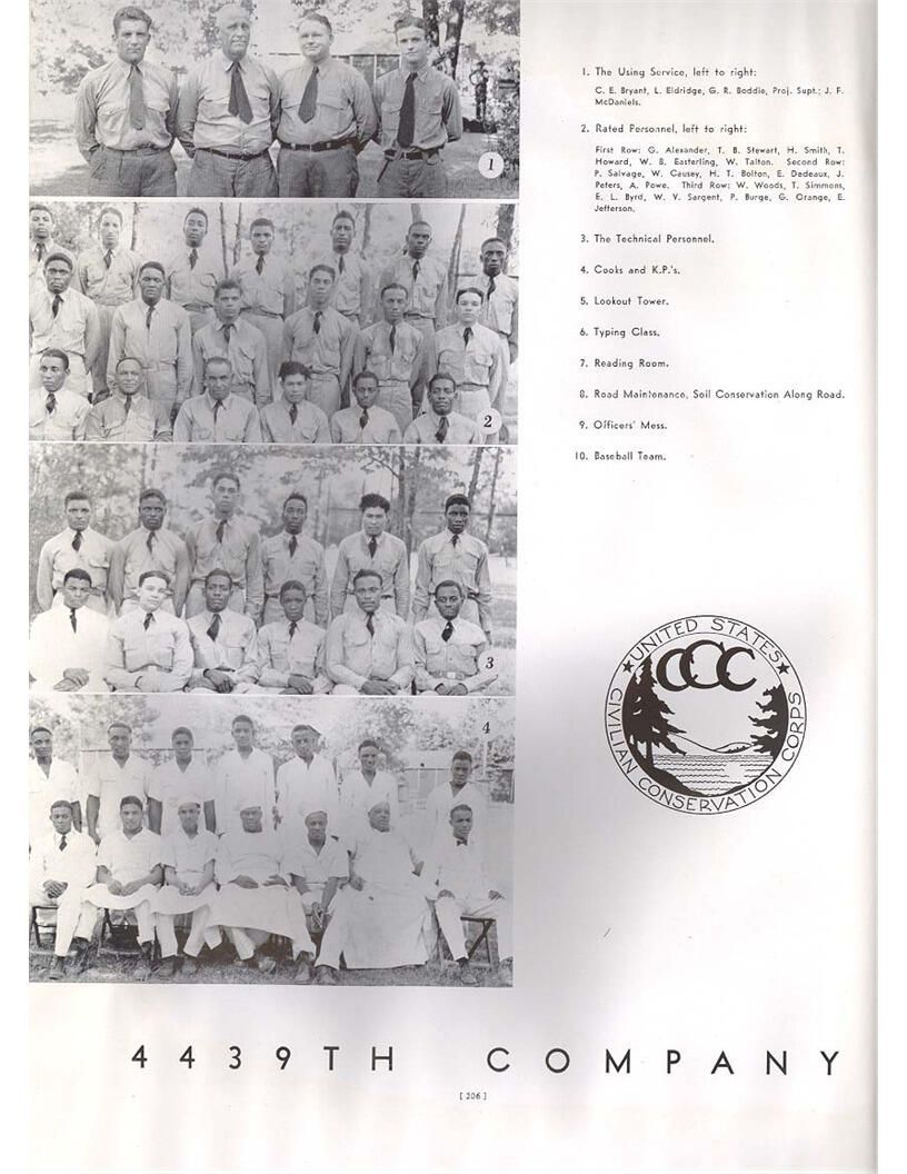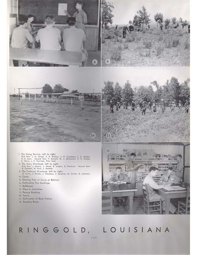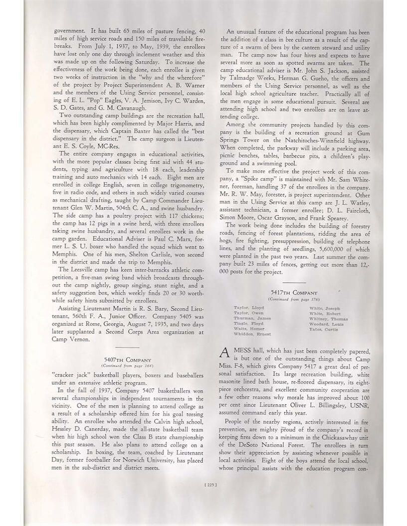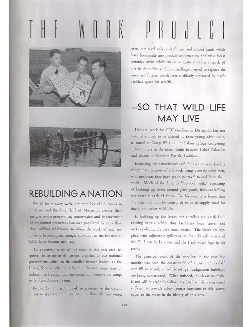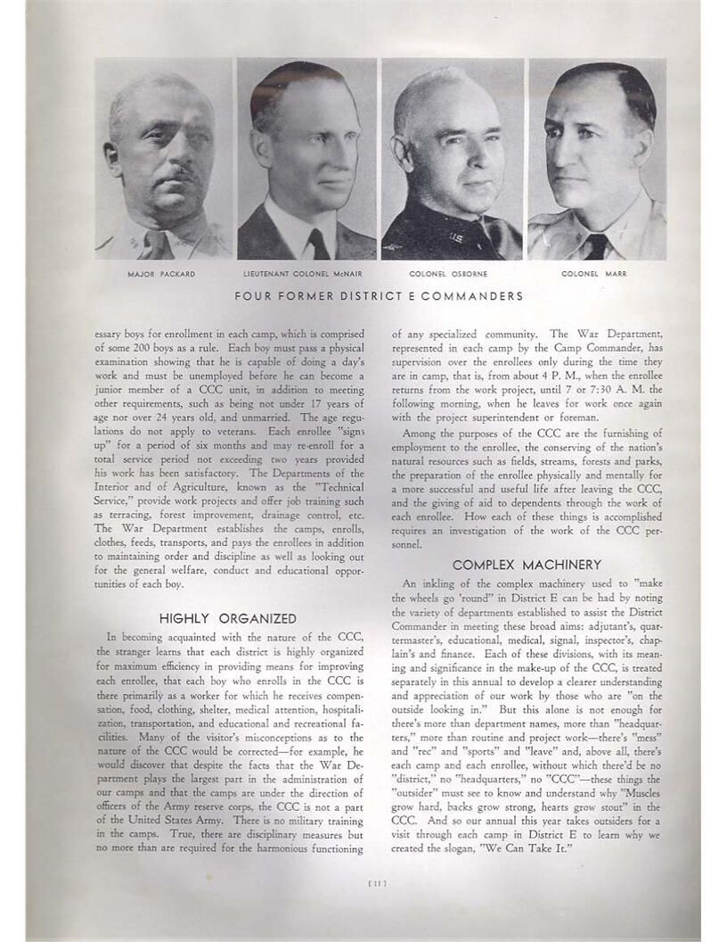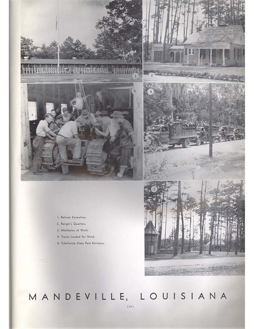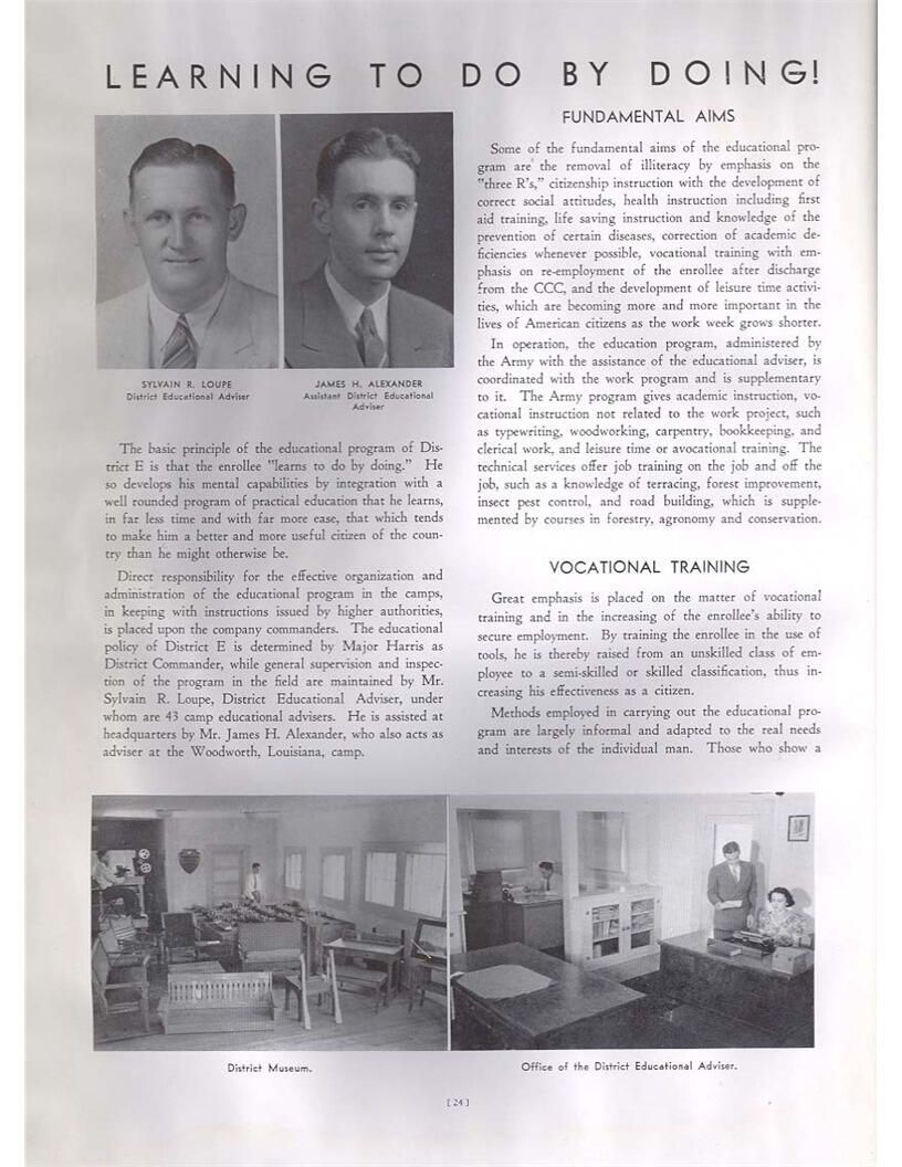 publication about District E of the CCC for the "outsider"; headquarters at Camp Beauregard, LA; Commanding officer at the time was Major R. V. K. Harris of Field Artilleries; brief history of the creation of CCC; what the CCC has been doing and how they're living; then lists off the 43 companies in District E with group photosCollection