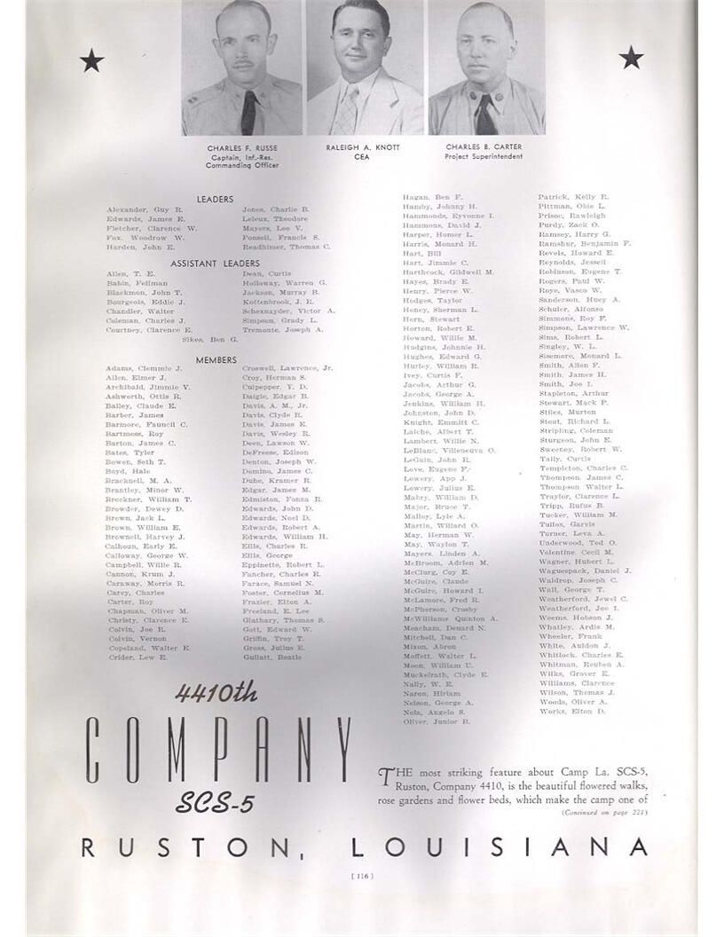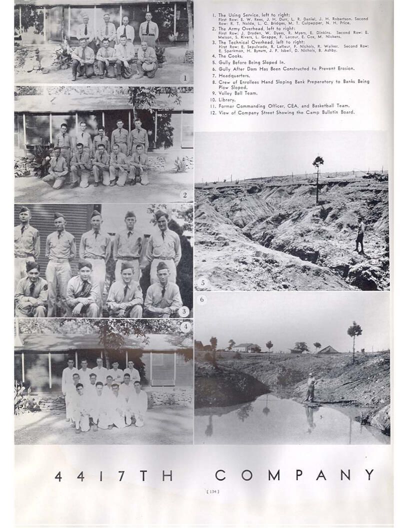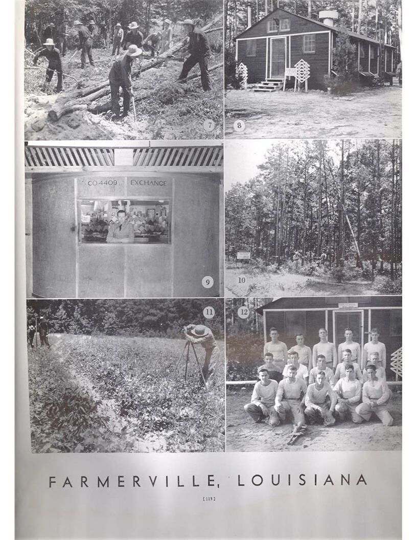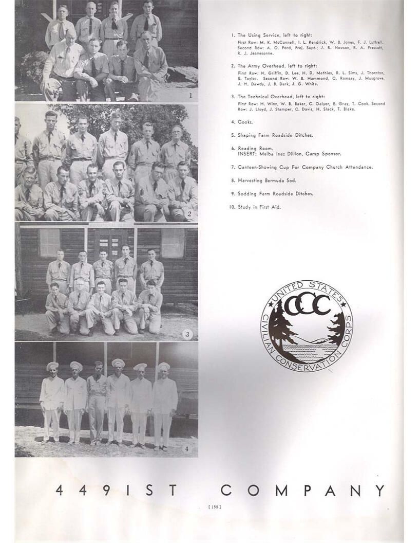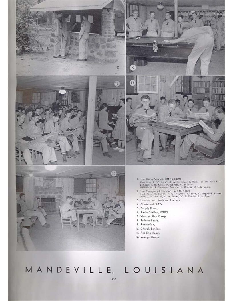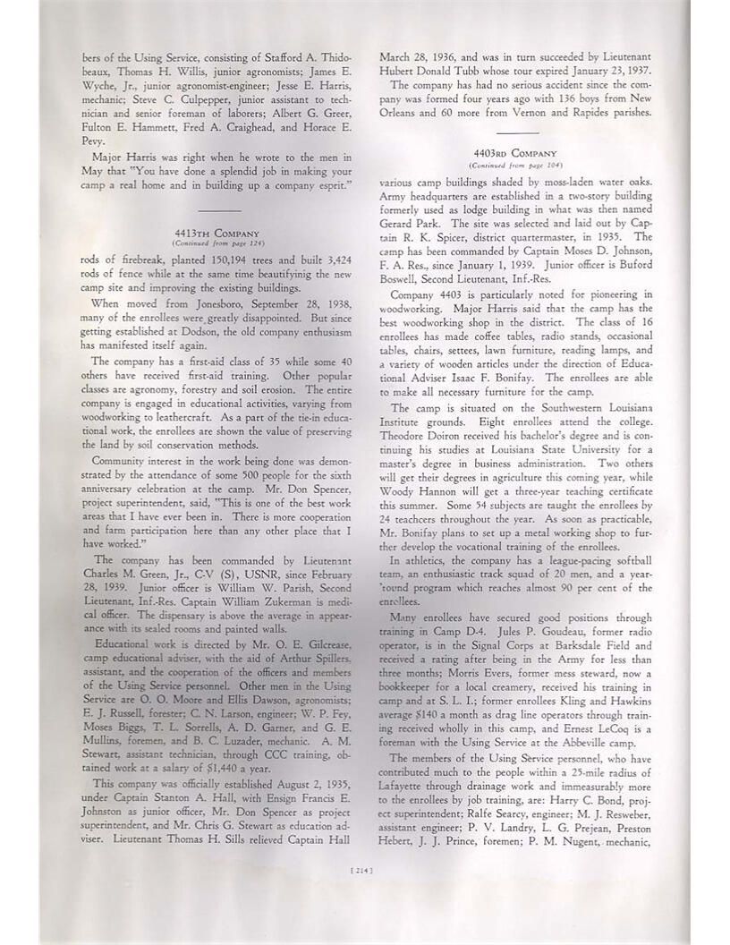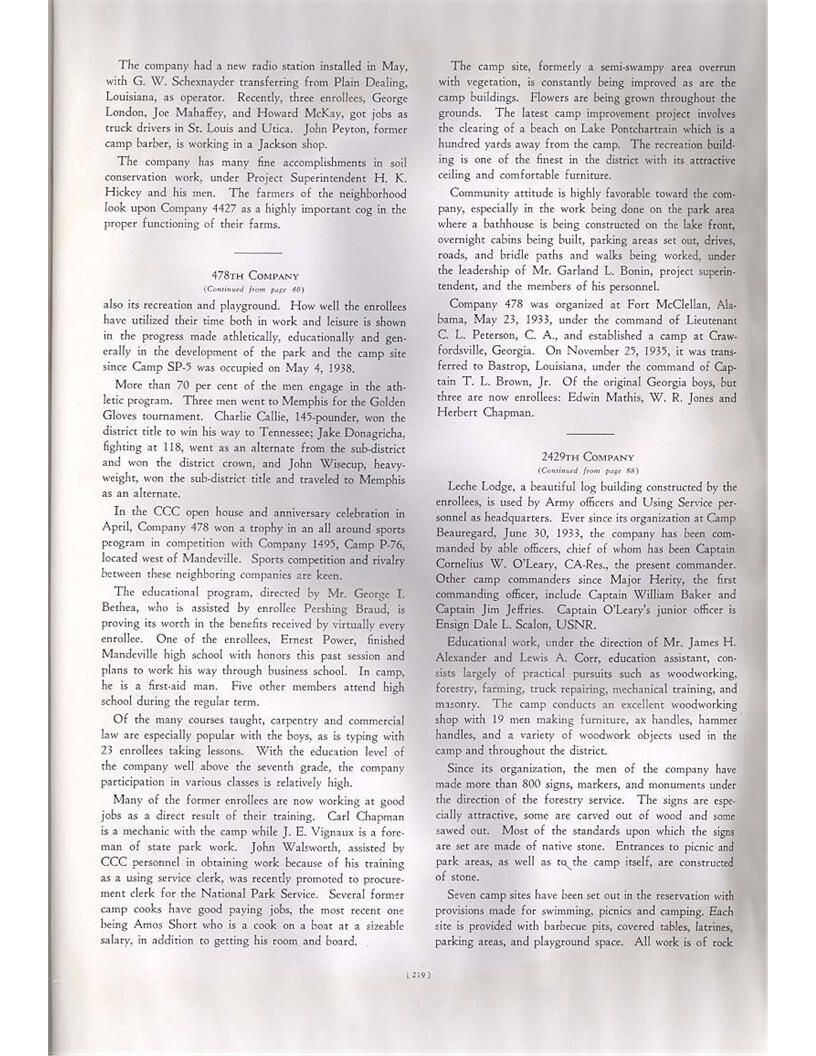 publication about District E of the CCC for the "outsider"; headquarters at Camp Beauregard, LA; Commanding officer at the time was Major R. V. K. Harris of Field Artilleries; brief history of the creation of CCC; what the CCC has been doing and how they're living; then lists off the 43 companies in District E with group photosCollection