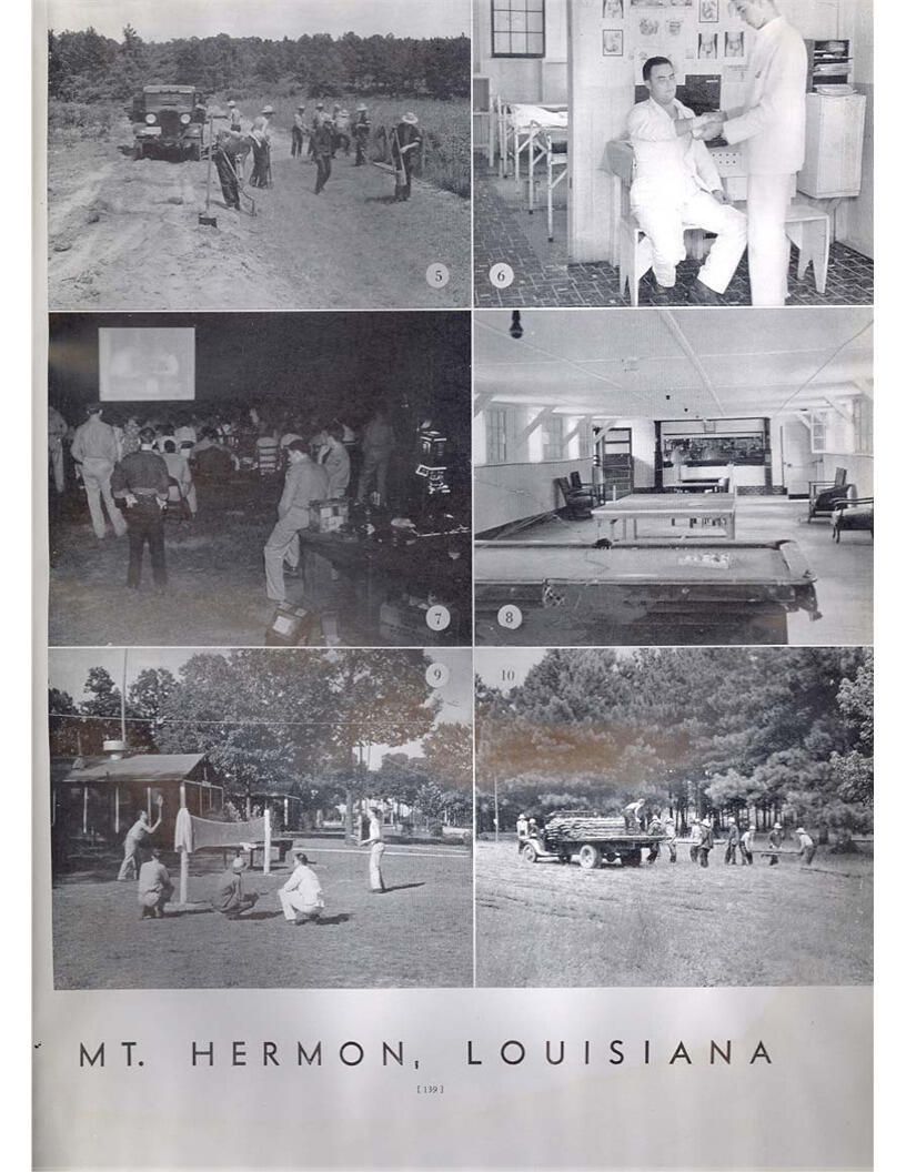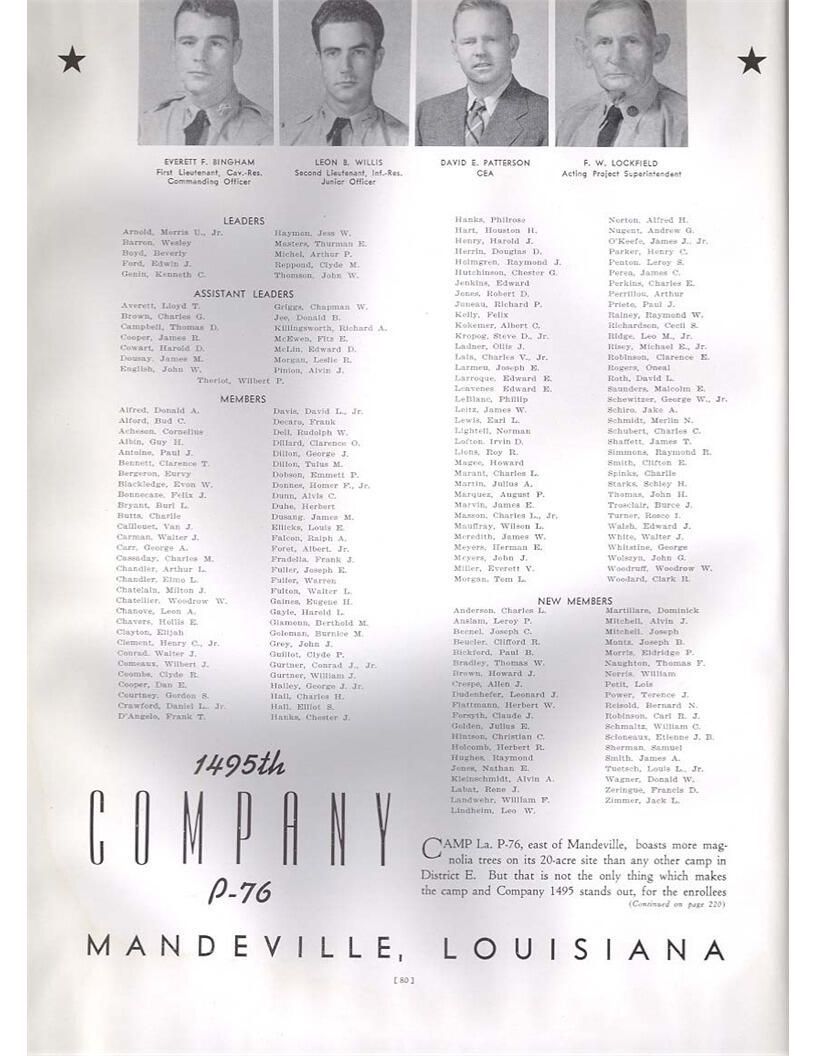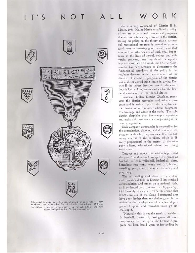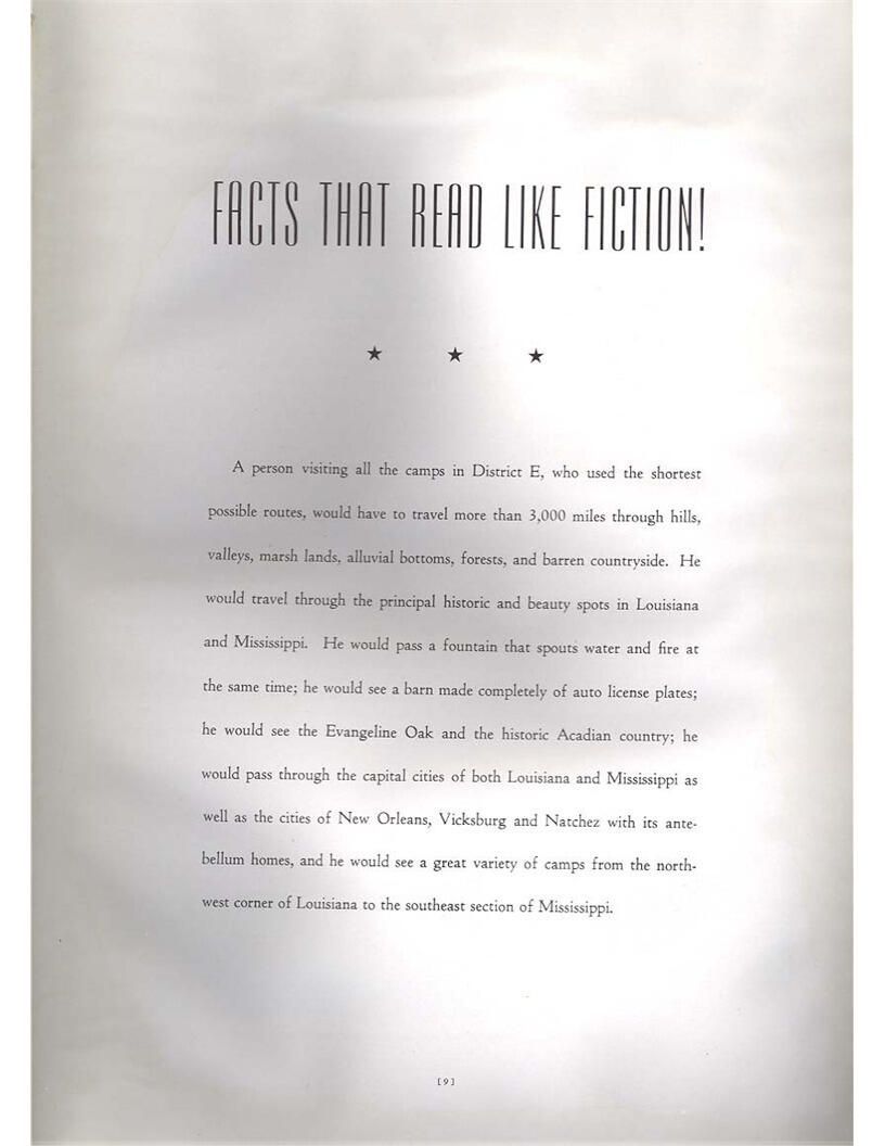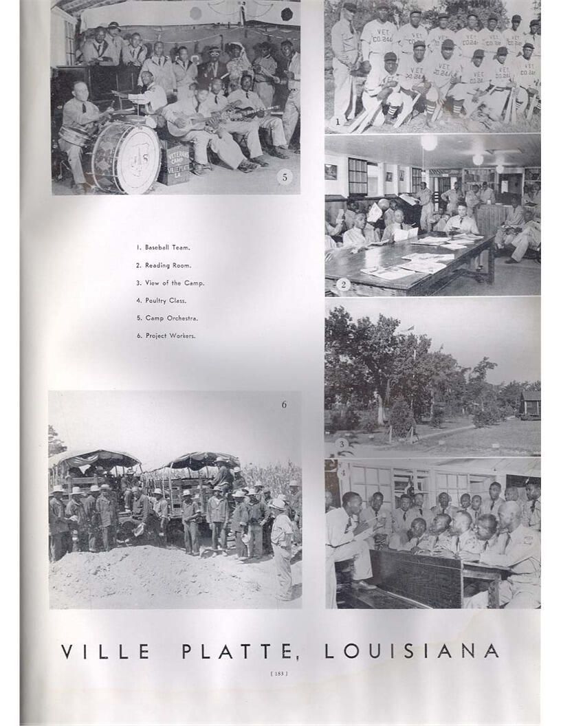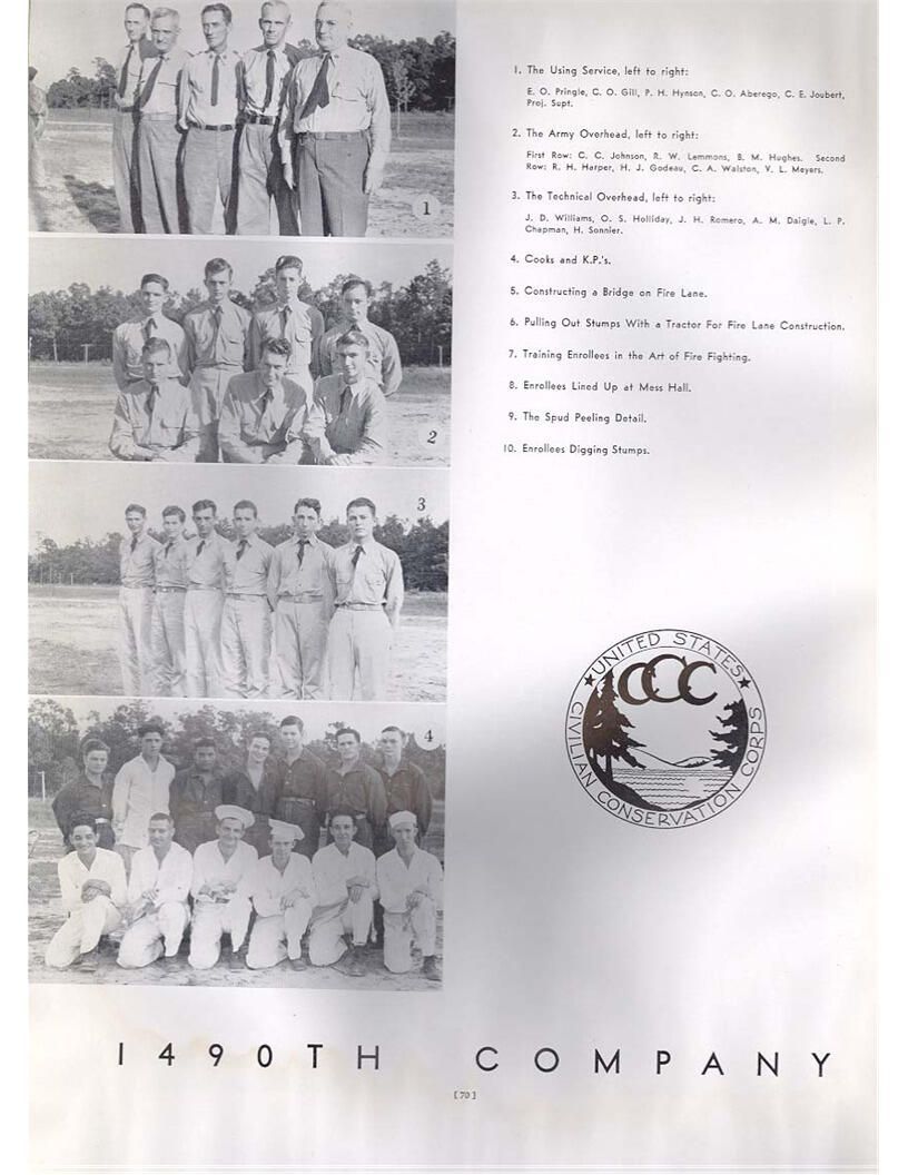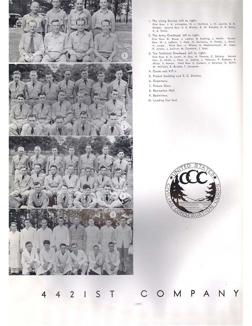 publication about District E of the CCC for the "outsider"; headquarters at Camp Beauregard, LA; Commanding officer at the time was Major R. V. K. Harris of Field Artilleries; brief history of the creation of CCC; what the CCC has been doing and how they're living; then lists off the 43 companies in District E with group photosCollection