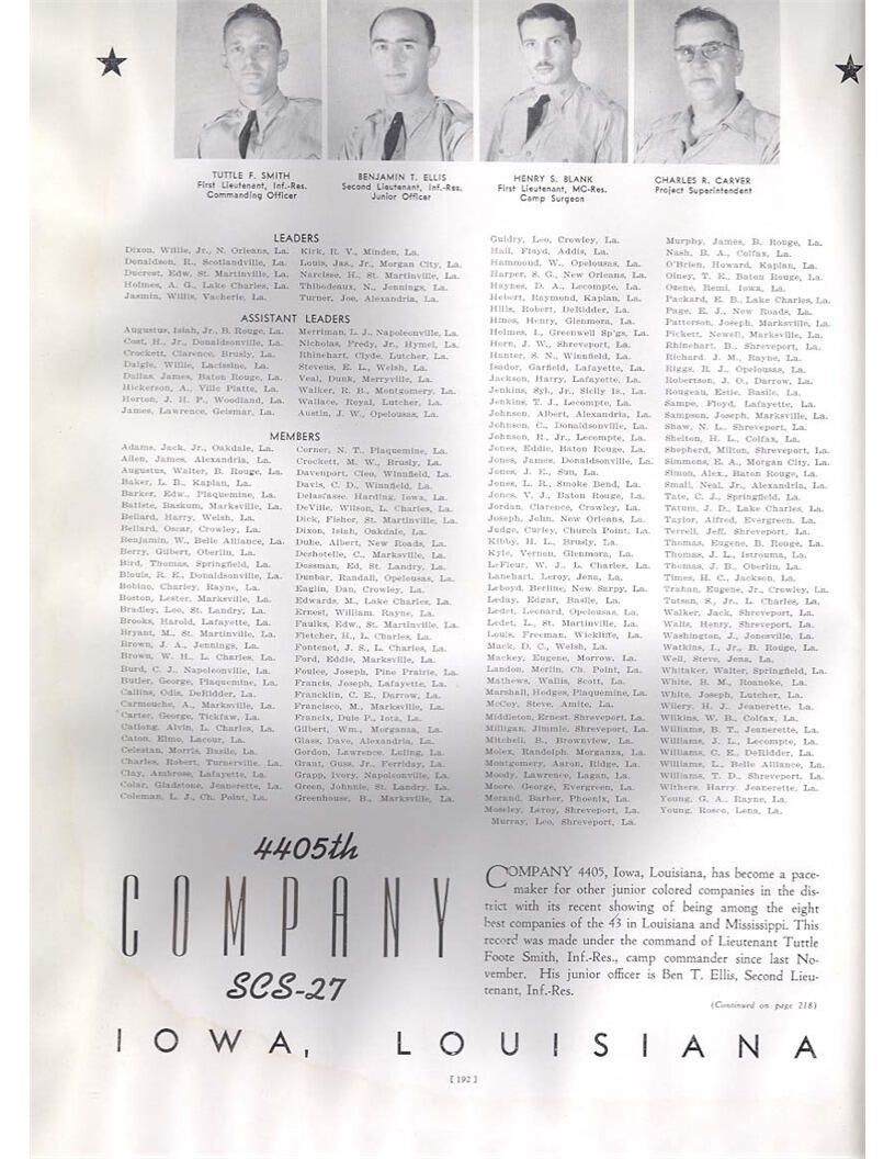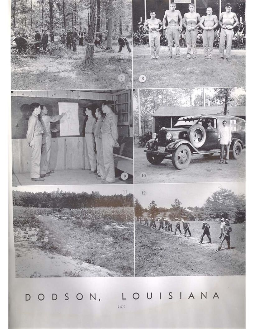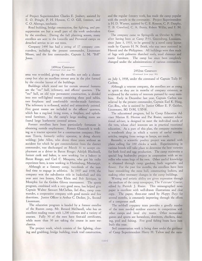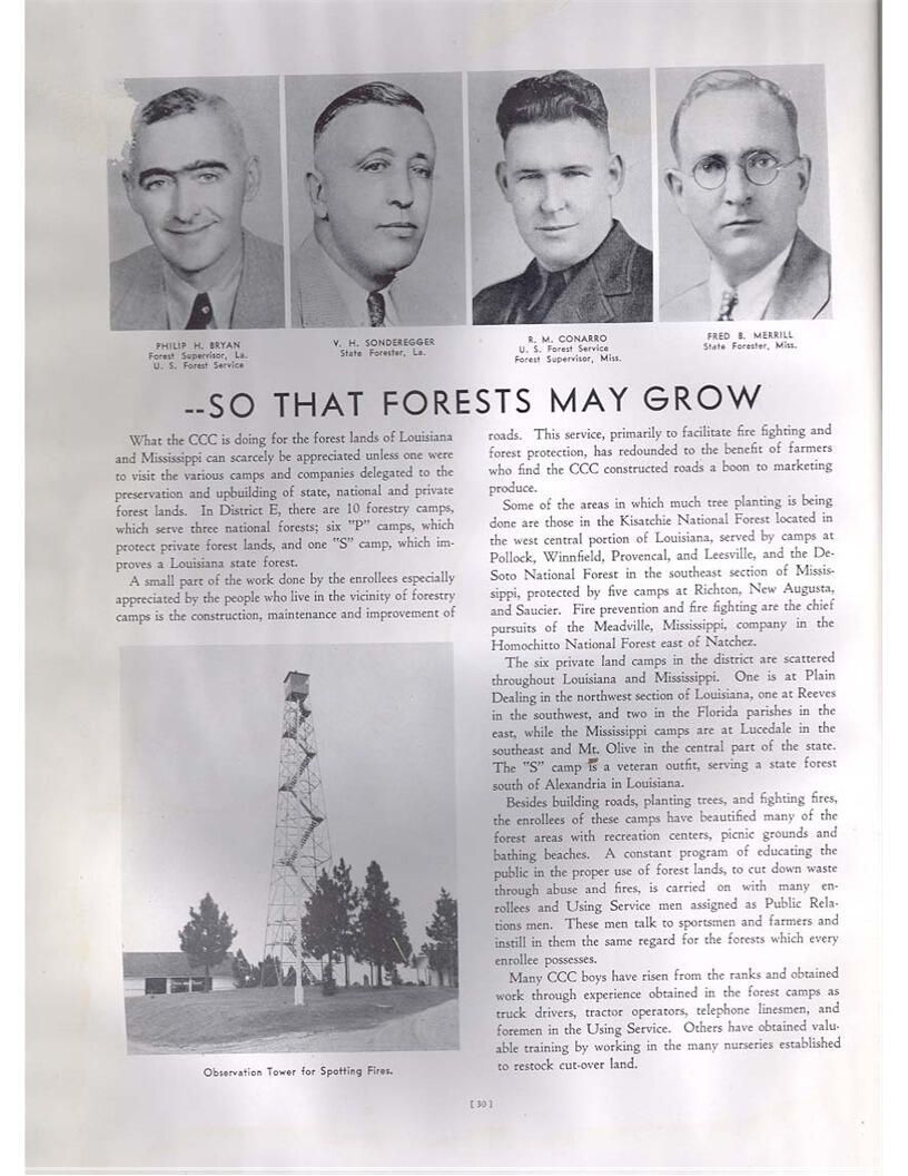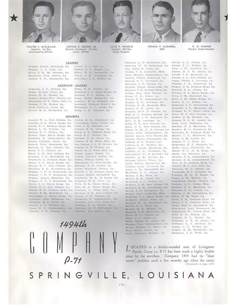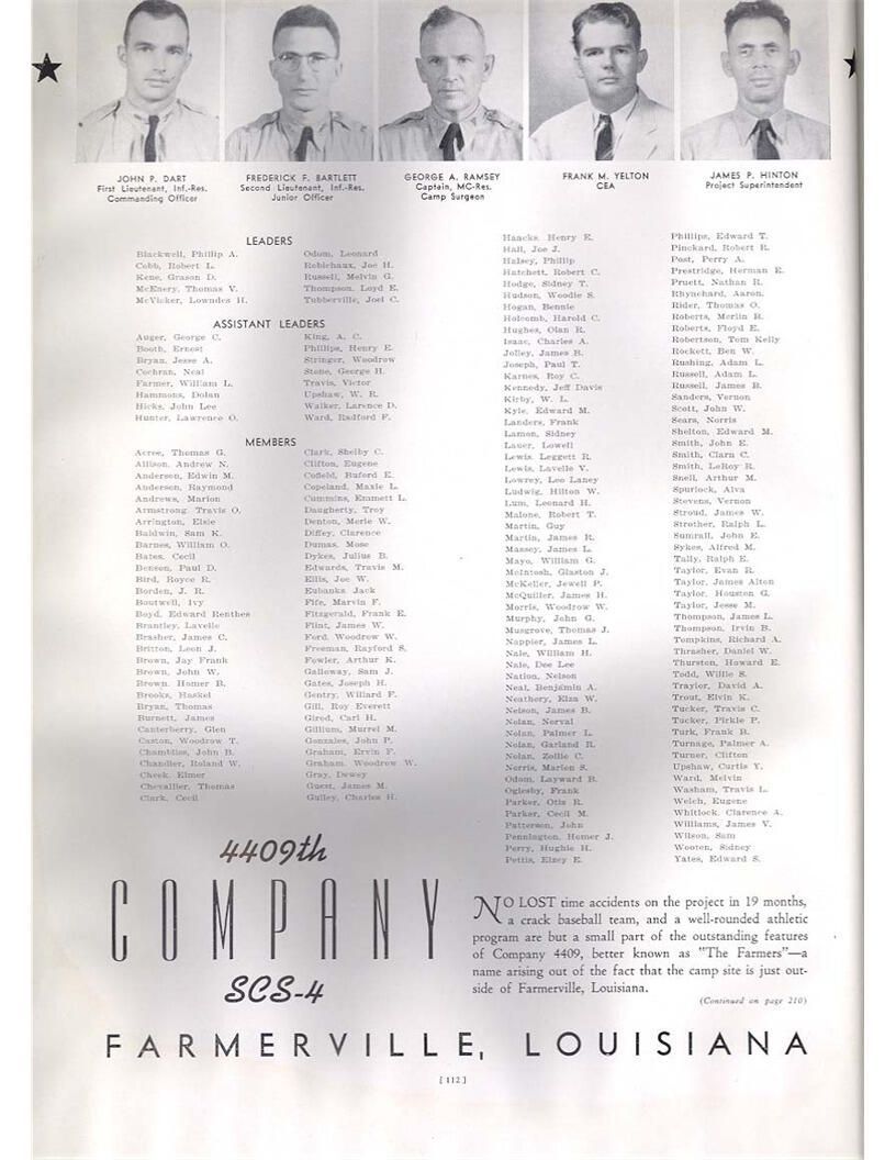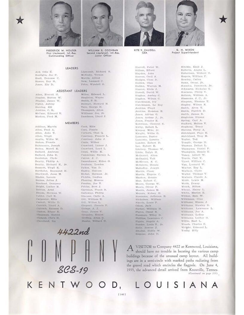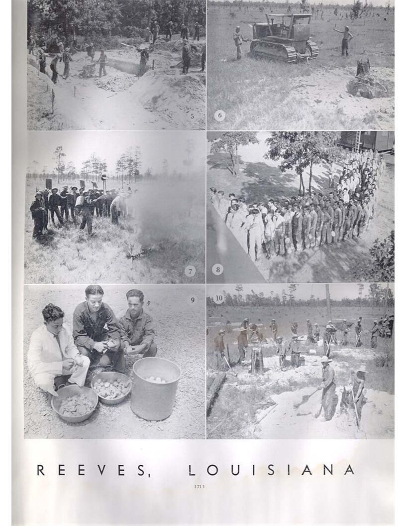 publication about District E of the CCC for the "outsider"; headquarters at Camp Beauregard, LA; Commanding officer at the time was Major R. V. K. Harris of Field Artilleries; brief history of the creation of CCC; what the CCC has been doing and how they're living; then lists off the 43 companies in District E with group photosCollection