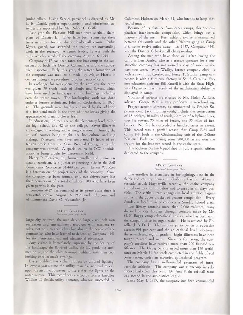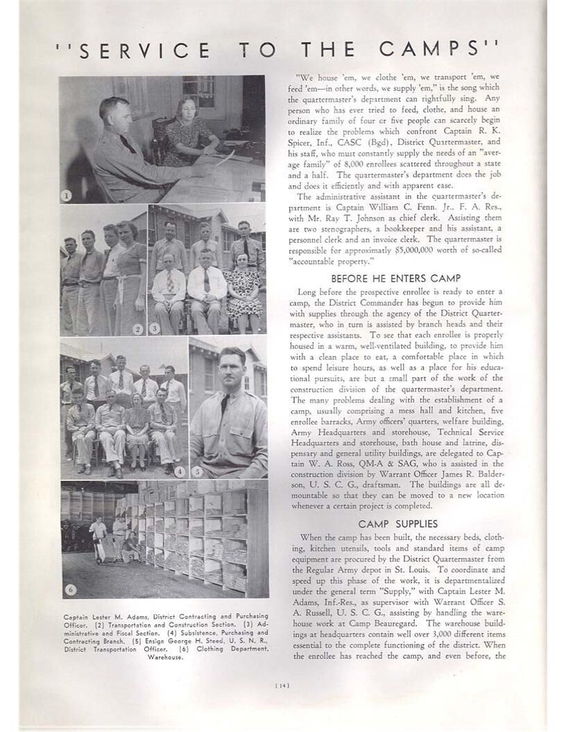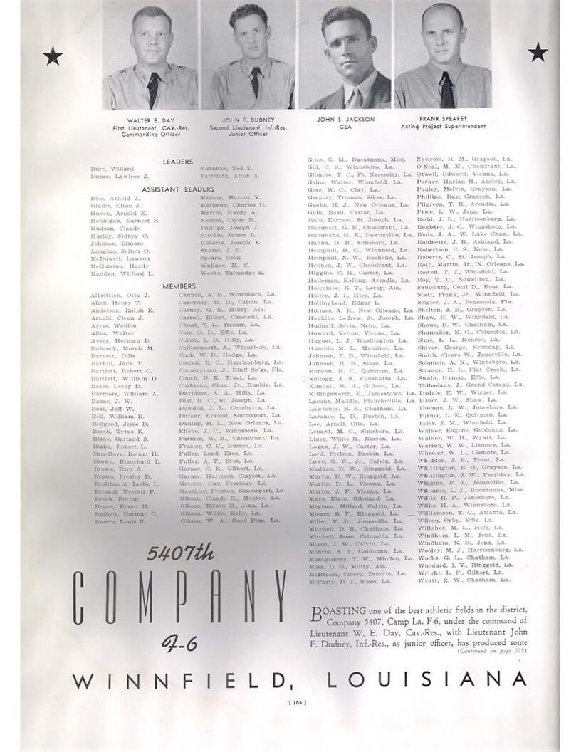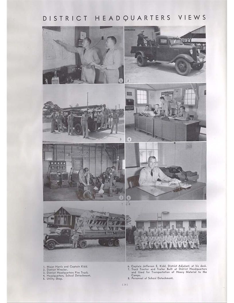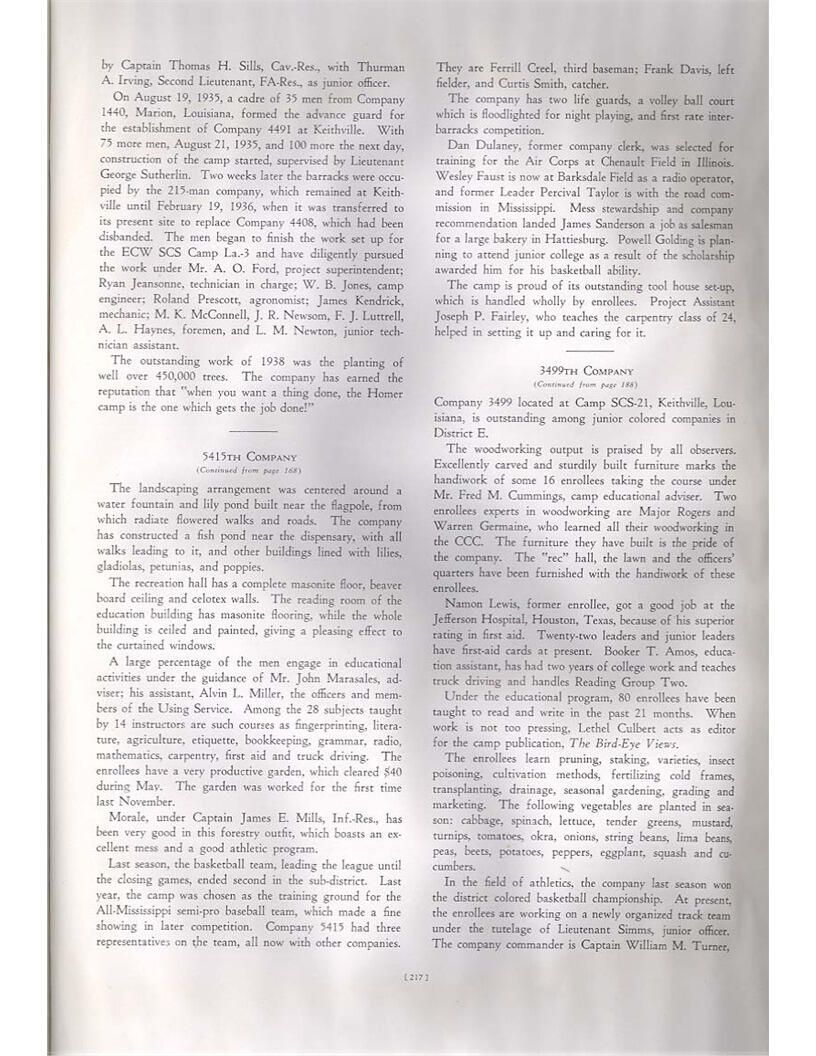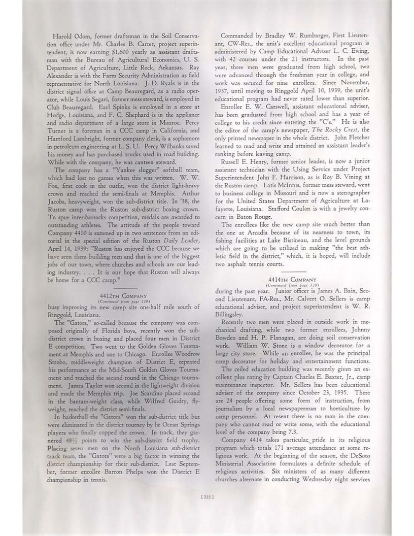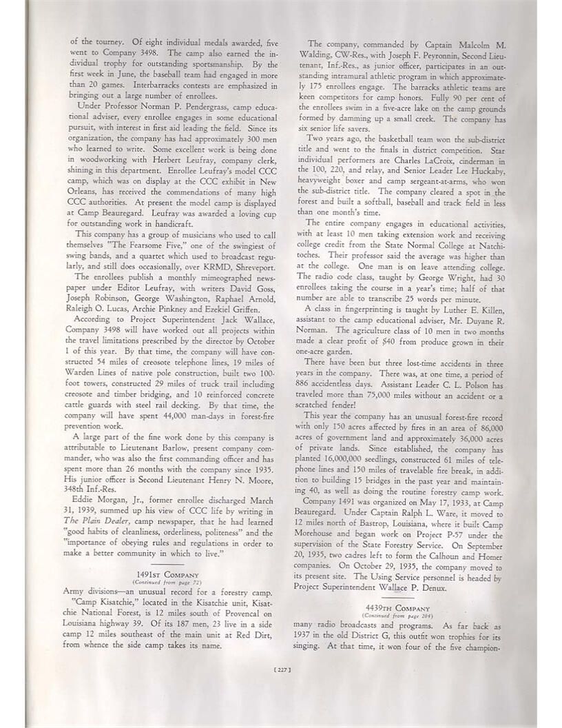 publication about District E of the CCC for the "outsider"; headquarters at Camp Beauregard, LA; Commanding officer at the time was Major R. V. K. Harris of Field Artilleries; brief history of the creation of CCC; what the CCC has been doing and how they're living; then lists off the 43 companies in District E with group photosCollection