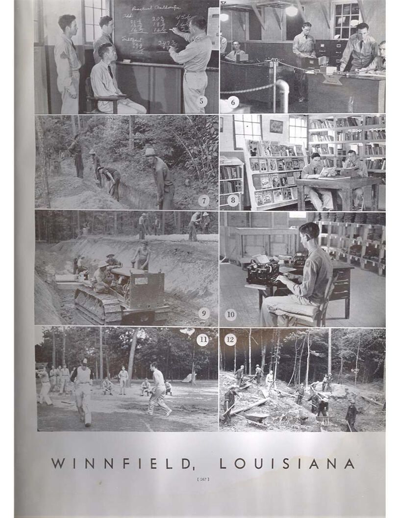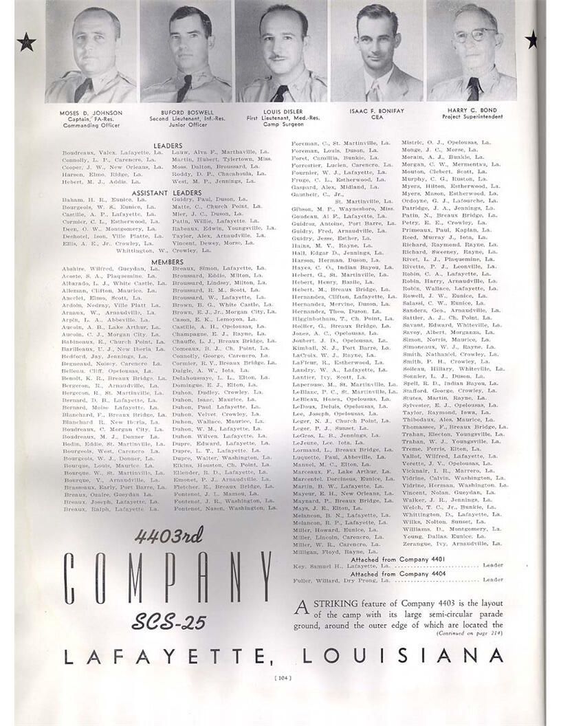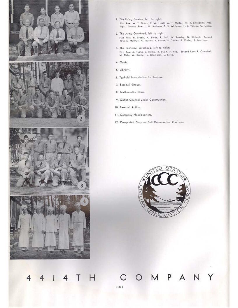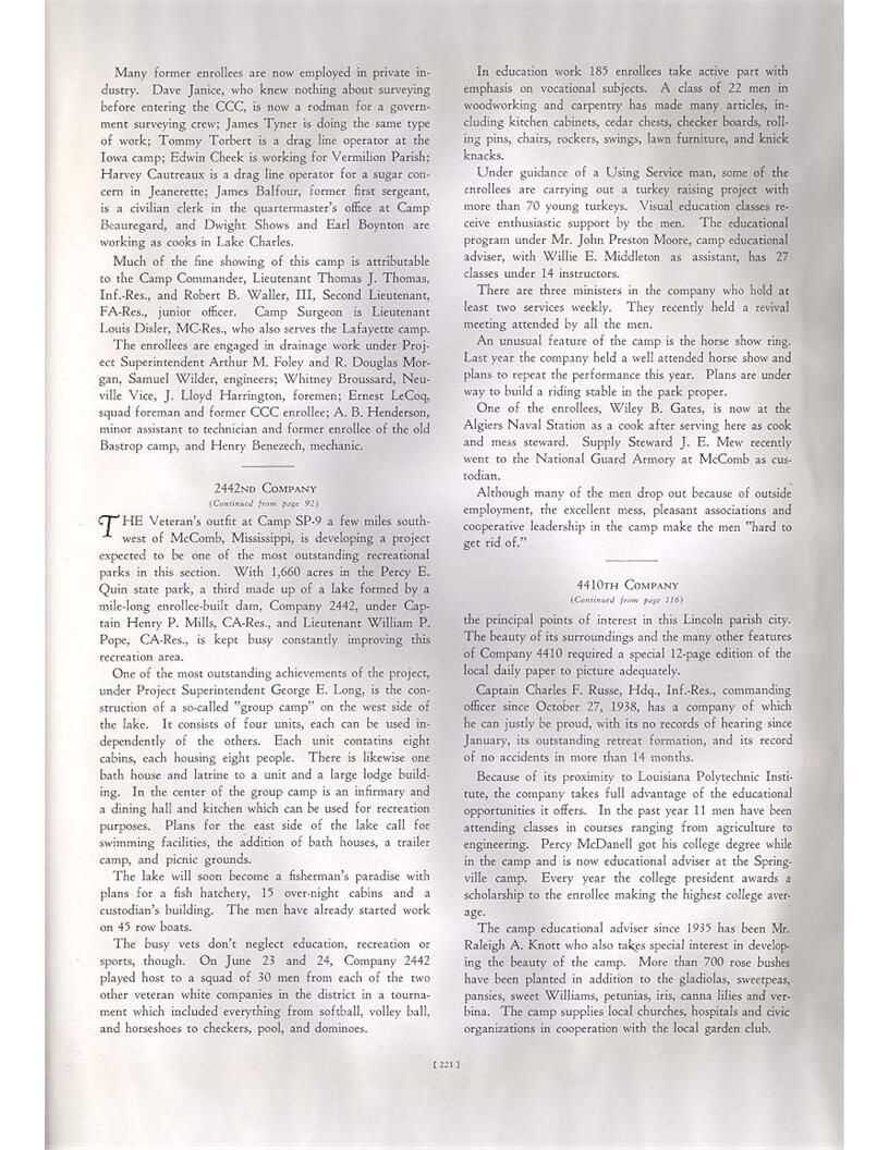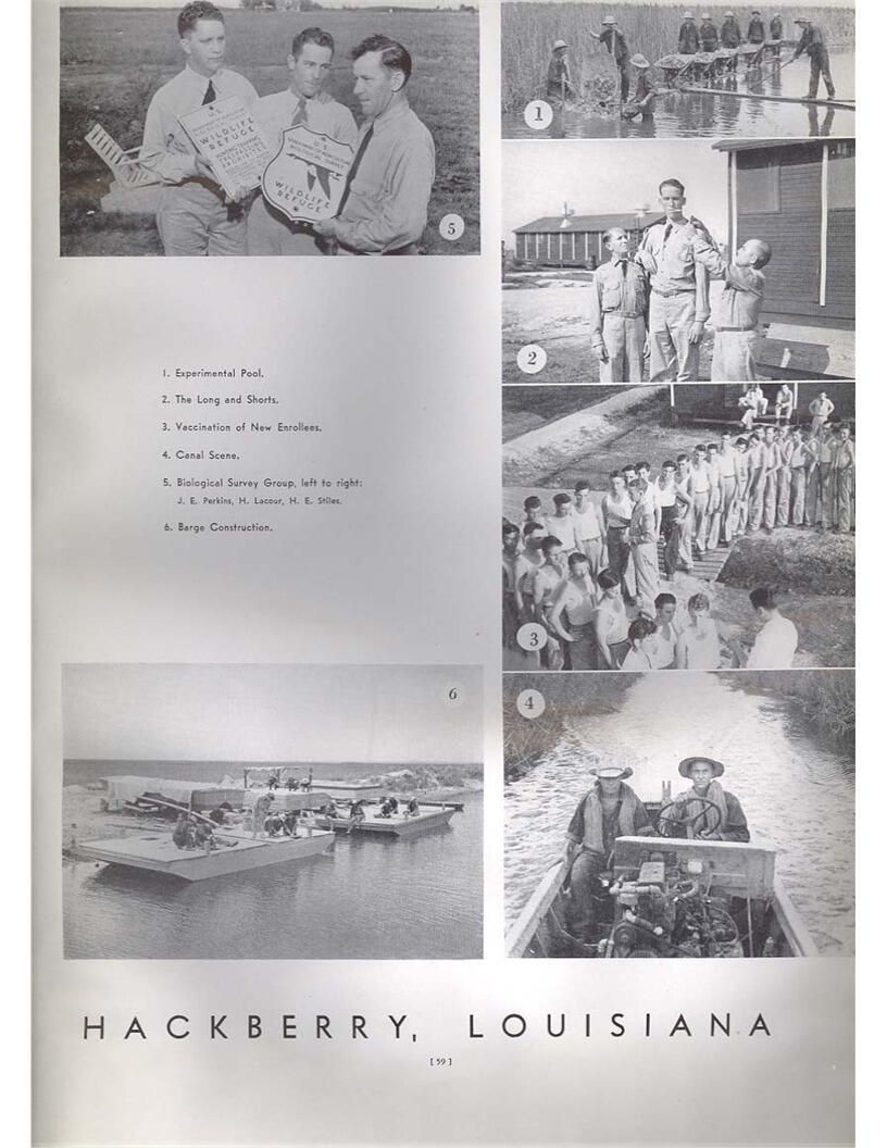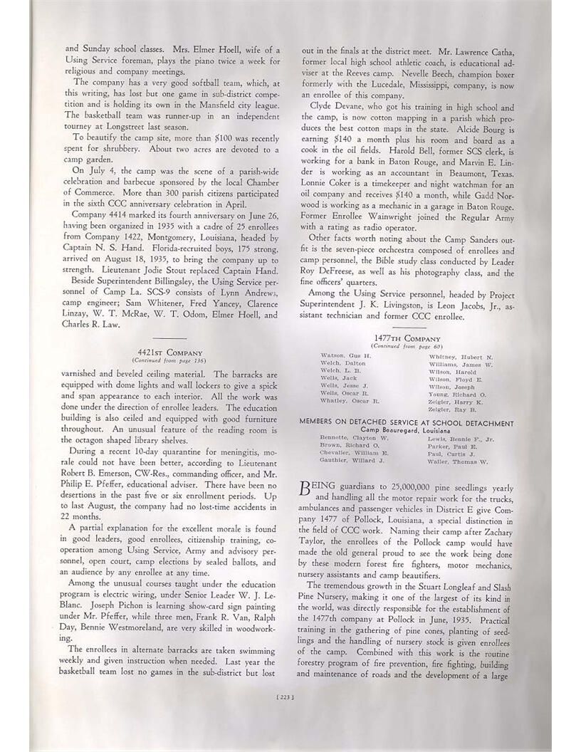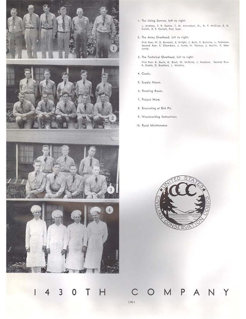 publication about District E of the CCC for the "outsider"; headquarters at Camp Beauregard, LA; Commanding officer at the time was Major R. V. K. Harris of Field Artilleries; brief history of the creation of CCC; what the CCC has been doing and how they're living; then lists off the 43 companies in District E with group photosCollection