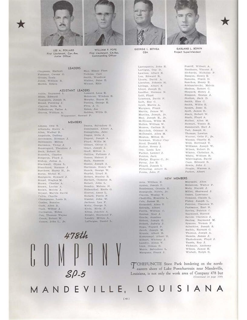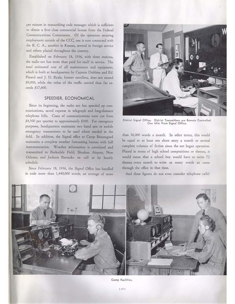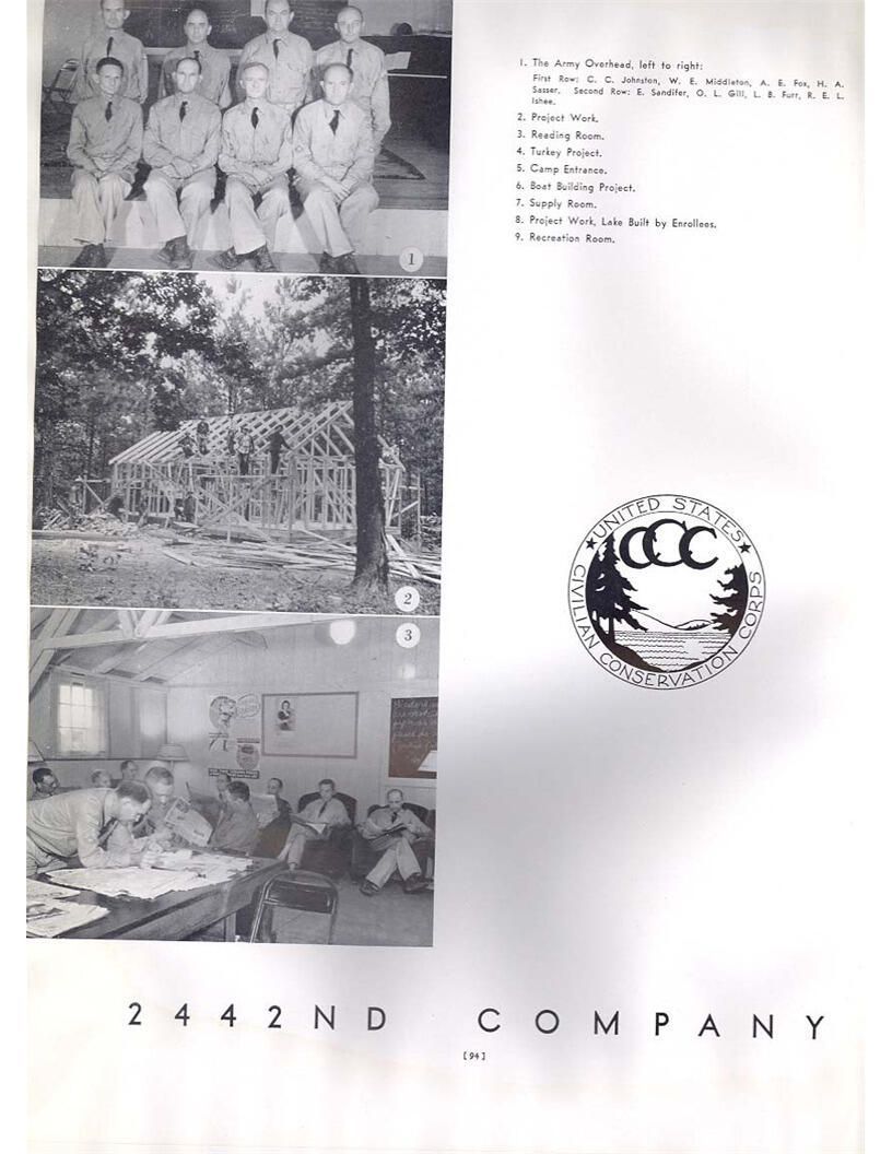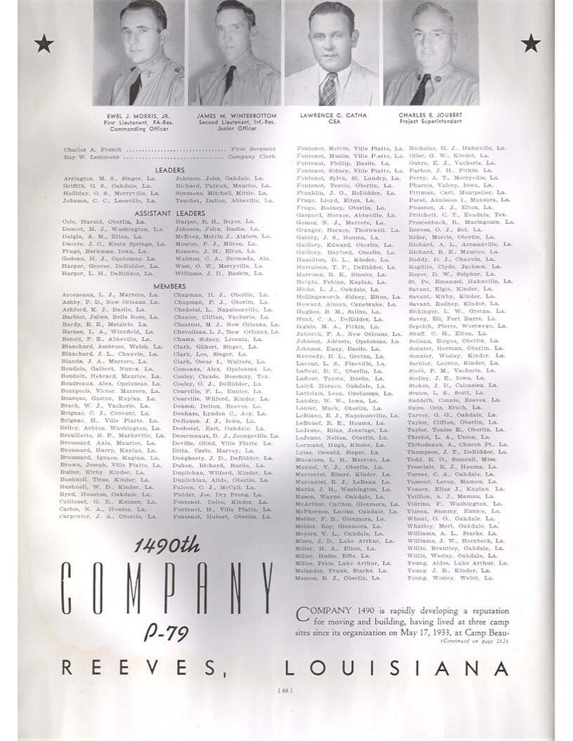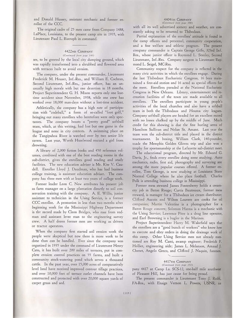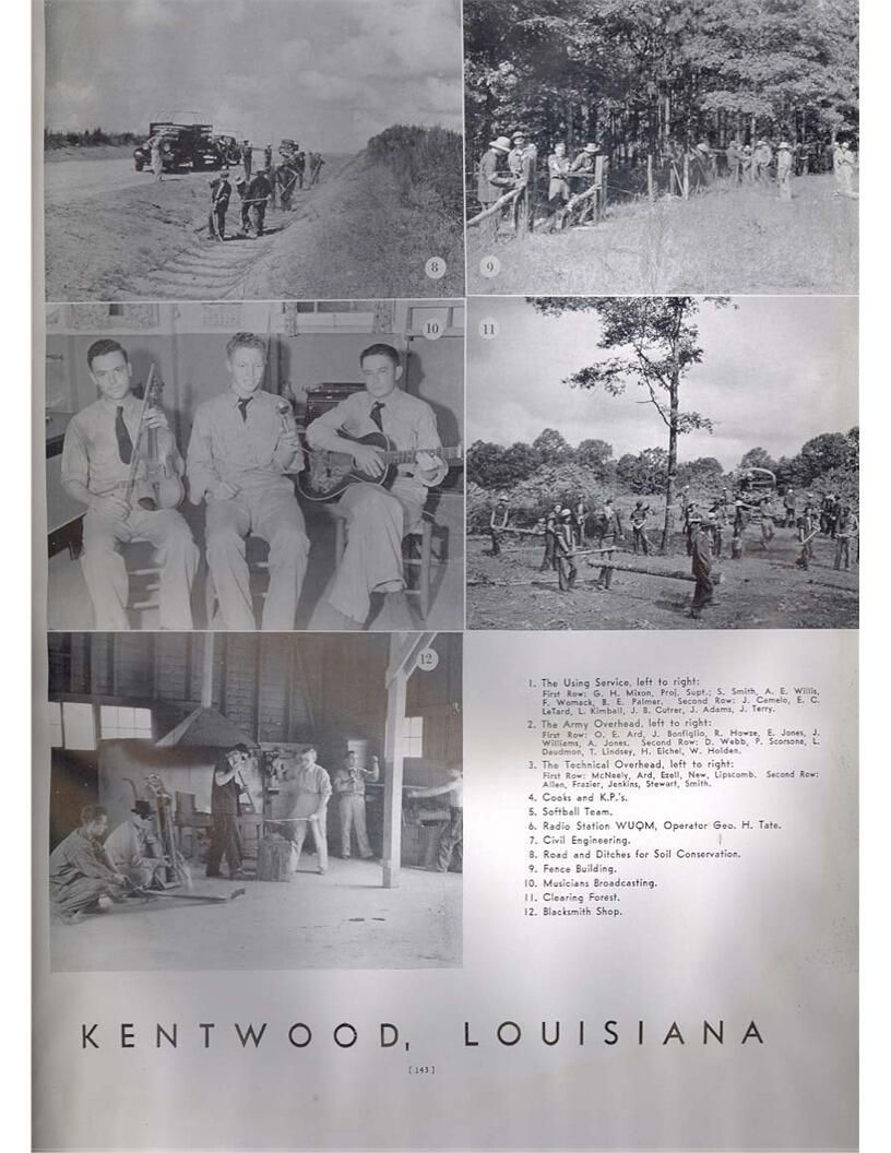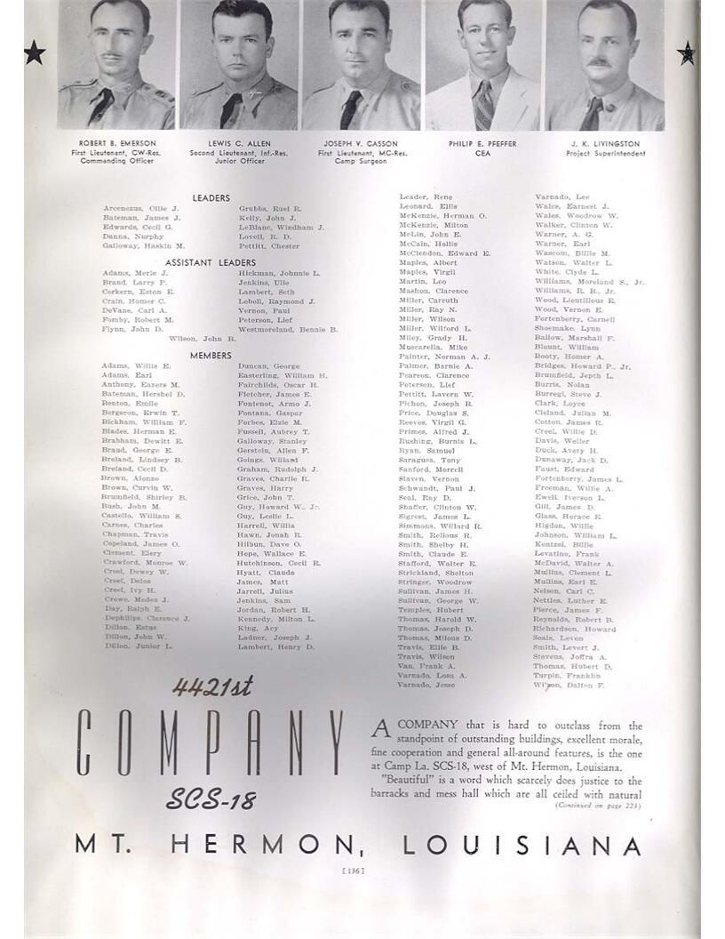 publication about District E of the CCC for the "outsider"; headquarters at Camp Beauregard, LA; Commanding officer at the time was Major R. V. K. Harris of Field Artilleries; brief history of the creation of CCC; what the CCC has been doing and how they're living; then lists off the 43 companies in District E with group photosCollection