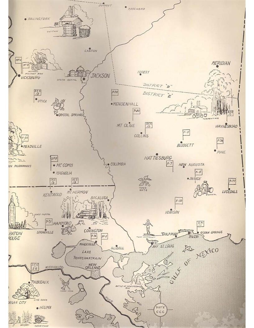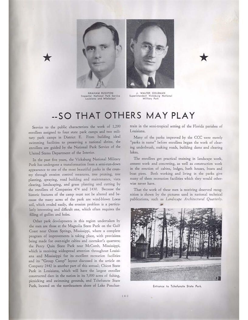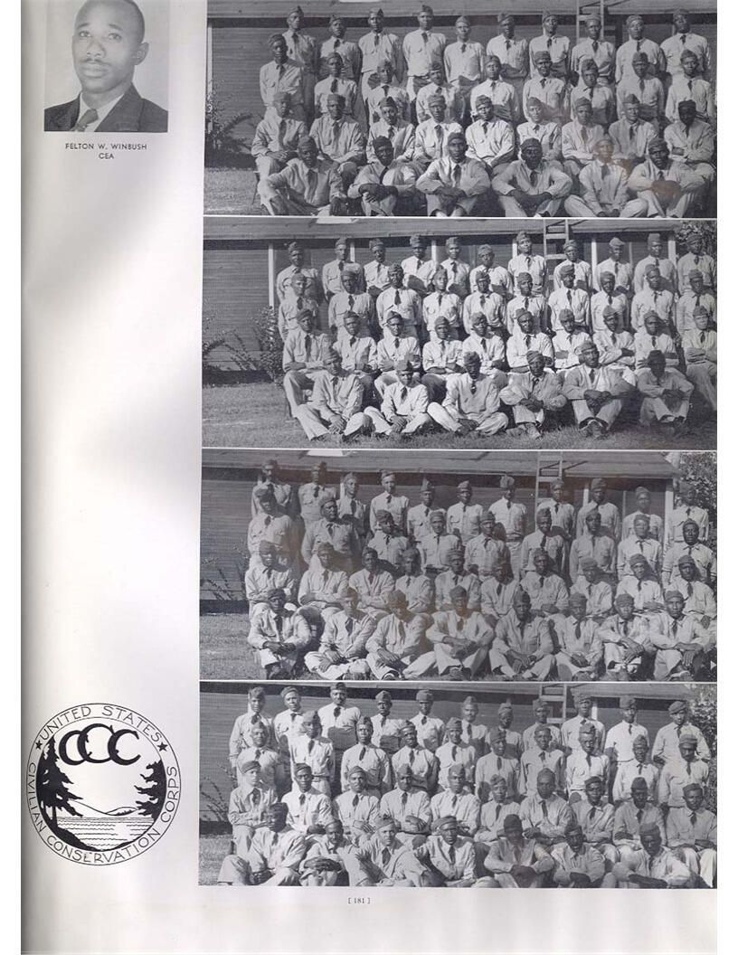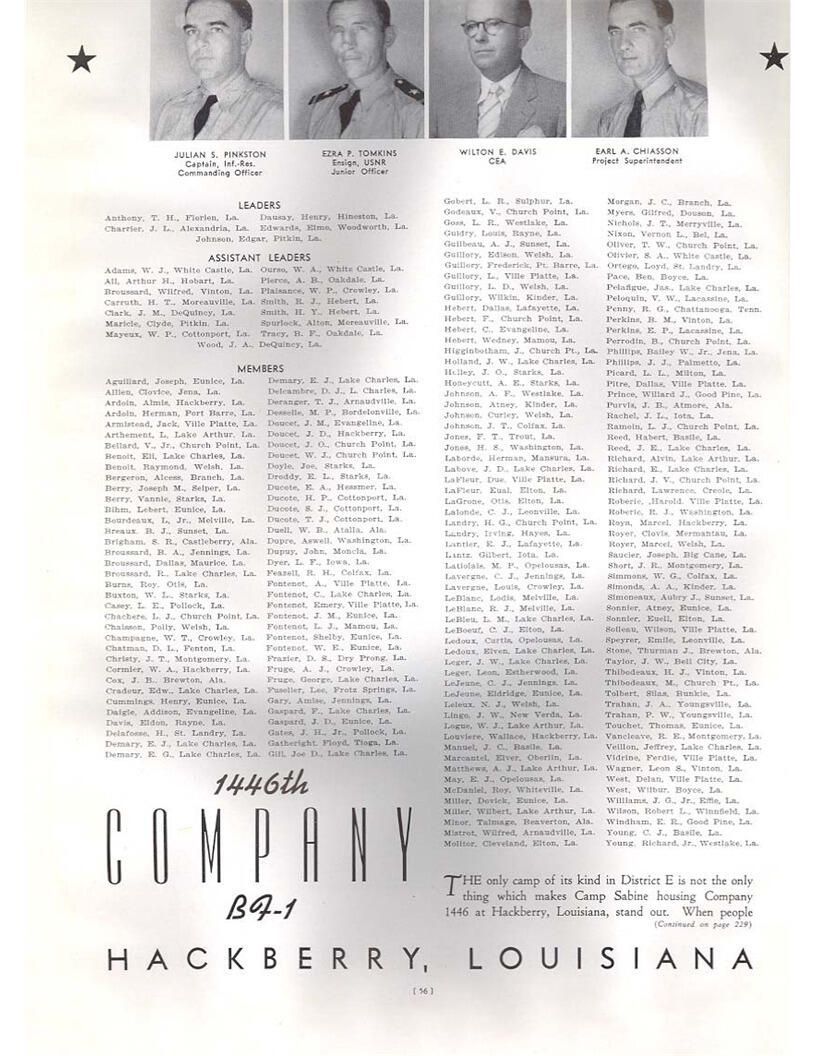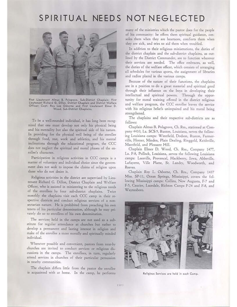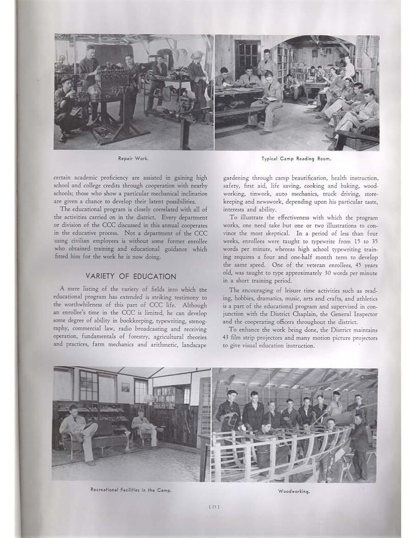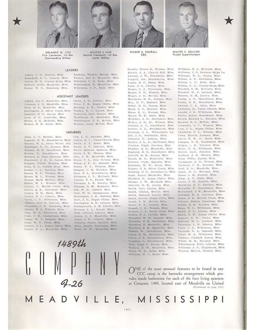 publication about District E of the CCC for the "outsider"; headquarters at Camp Beauregard, LA; Commanding officer at the time was Major R. V. K. Harris of Field Artilleries; brief history of the creation of CCC; what the CCC has been doing and how they're living; then lists off the 43 companies in District E with group photosCollection
