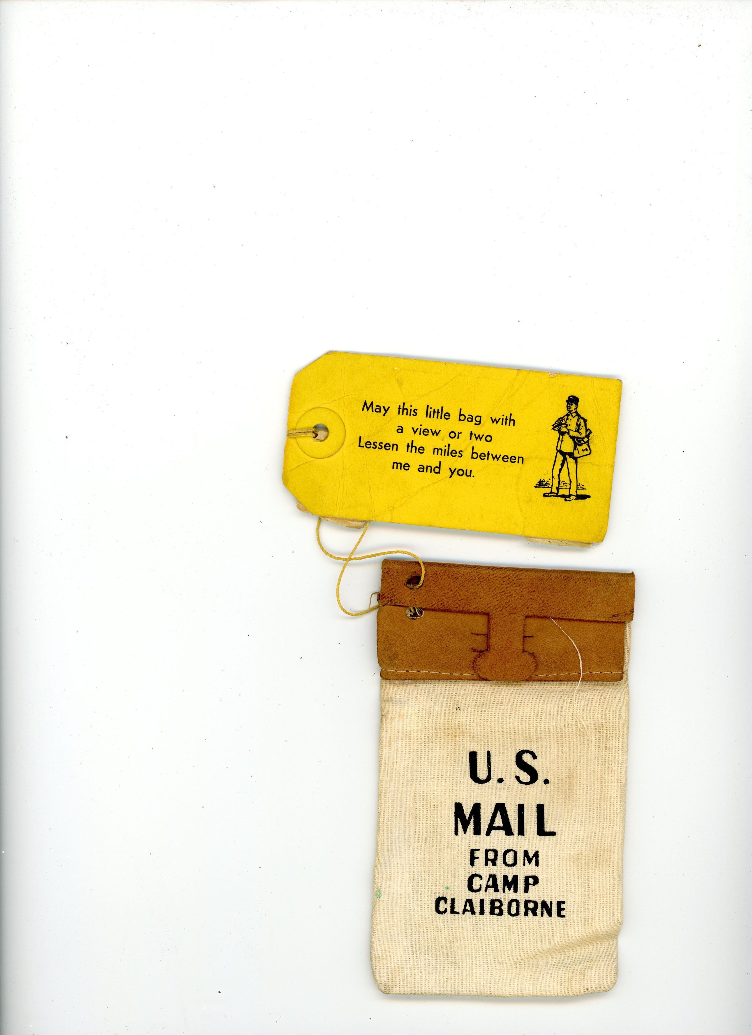 This bag was made and labeled for soldiers stationed at Camp Claiborne to mail small objects or pictures out from the camp. This particular bag had a collection of small photographs contained inside.Context