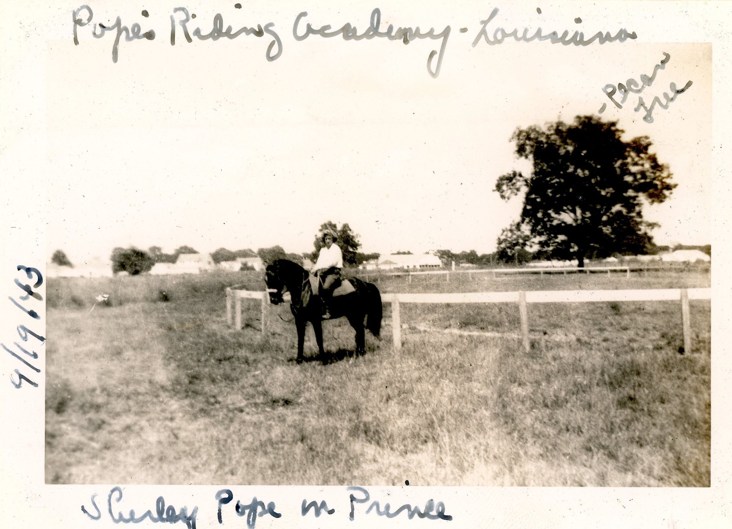 Pope's Riding Academy - Louisiana; 9/19/1943; Shirley Pope in Prince; NOTE: Pecan TreeMaterial/Technique