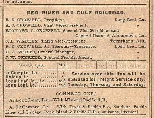 the officials in 1948 were R. D. Crowell president in Long Leaf, H. A. White general manager in Long Leaf, A. C. Crowell first vice president in Long Leaf, Richard L. Crowell second vice president and general counsel in Alexandria, S. L. Wadley third vice president in Texarkana, R. D. Crowell Jr. secretary-treasurer in Long Leaf and J. W. Terrell general freight agent in Long Leaf;