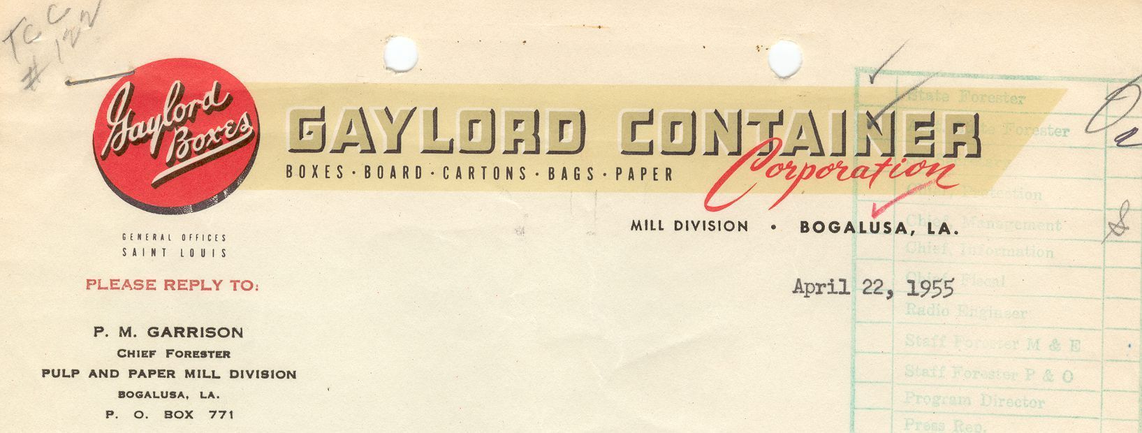 Letterhead from Gaylord Container Company April 22, 1955.Context