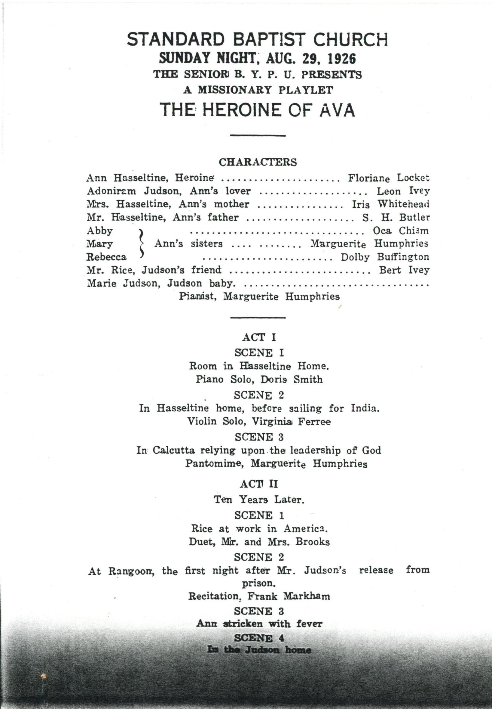 play bulletin of the play "The Heroine of Ava;" being put out on by the Seniors B.Y.P.U at the Standard Baptist Church; lists the characters and the Acts I and IICollection