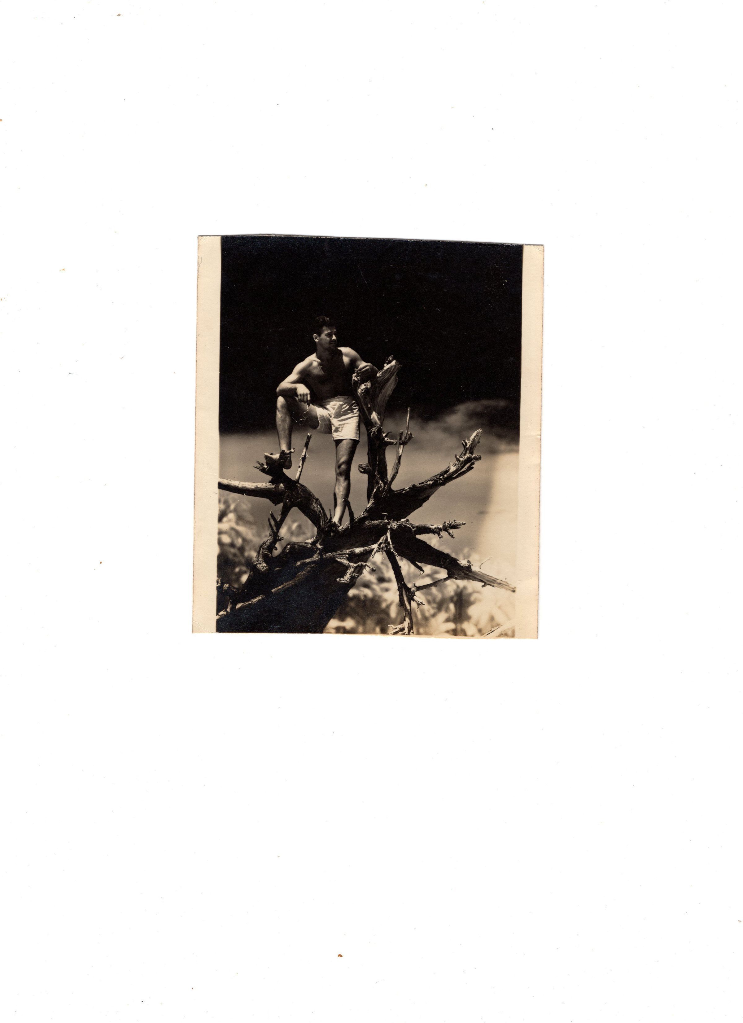 Photo depicts a man, R.P. Mouton, in shorts standing on a large piece of driftwood on Biak Island in 1944Photograph Details