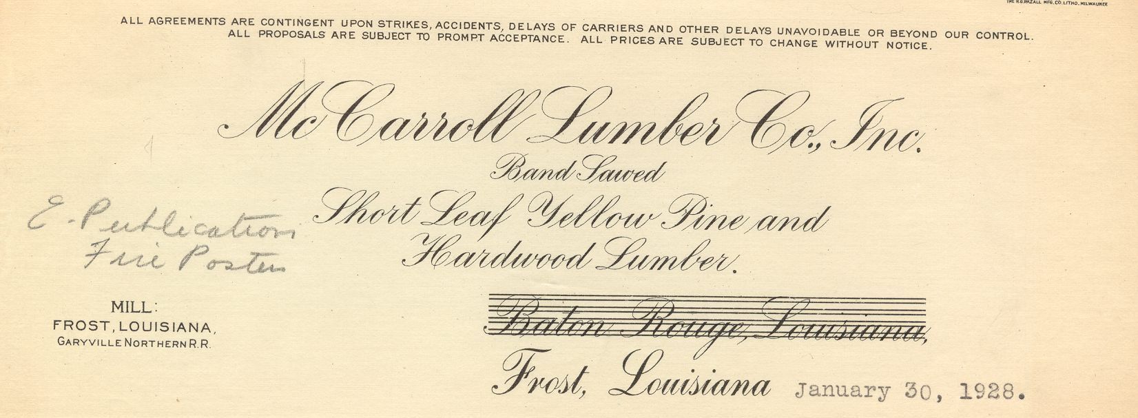 McCarroll Lumber Company began operations in Frost, Louisiana. The company specialized in the production of yellow pine and hardwood lumber. However, the company was forced to close down due to local resources drying up.Collection