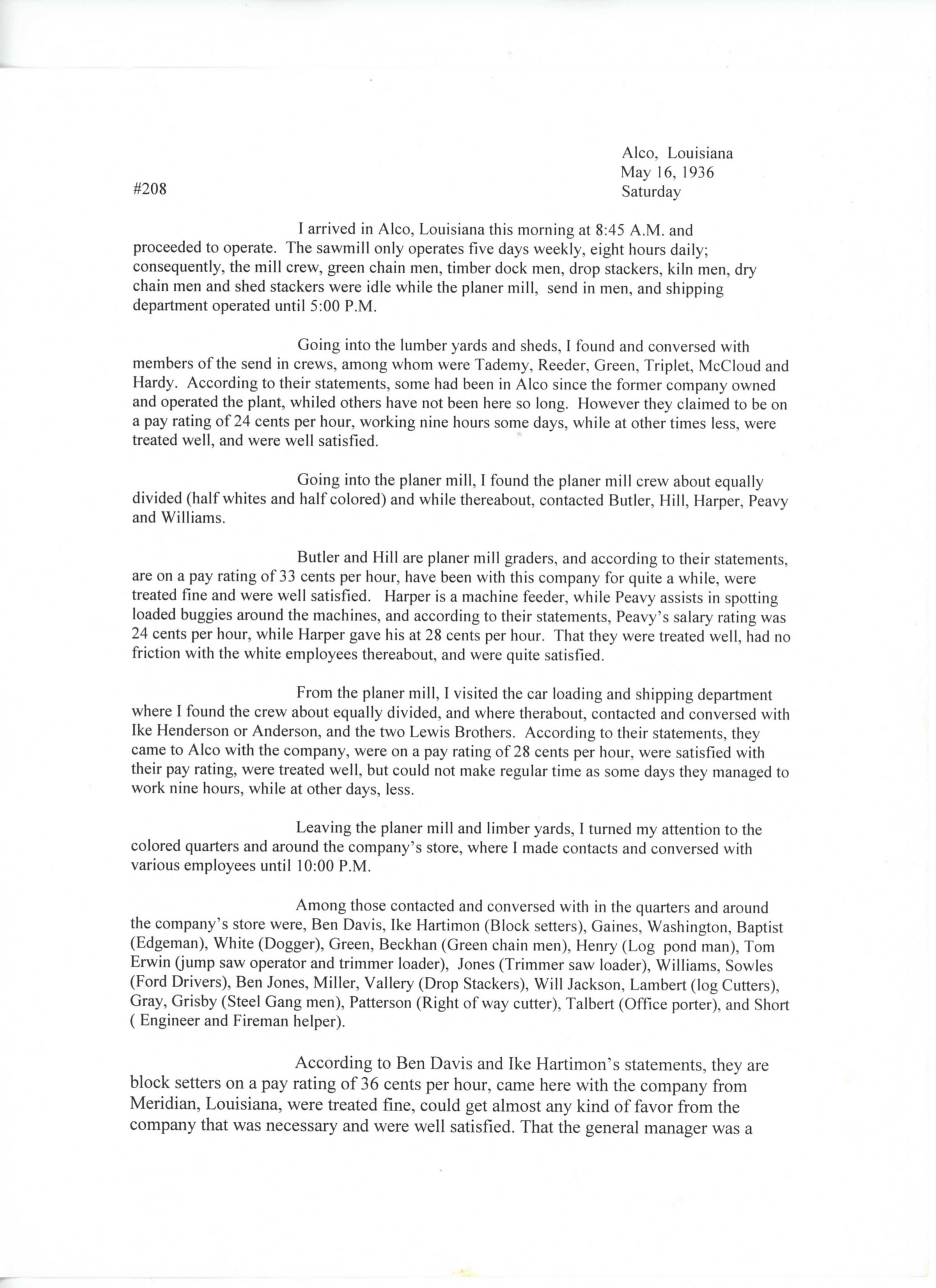 a memoir/diary entry of someone that visited or worked in Alco LA at a sawmill; number in top left corner #208, then #2 #208, #3 #208