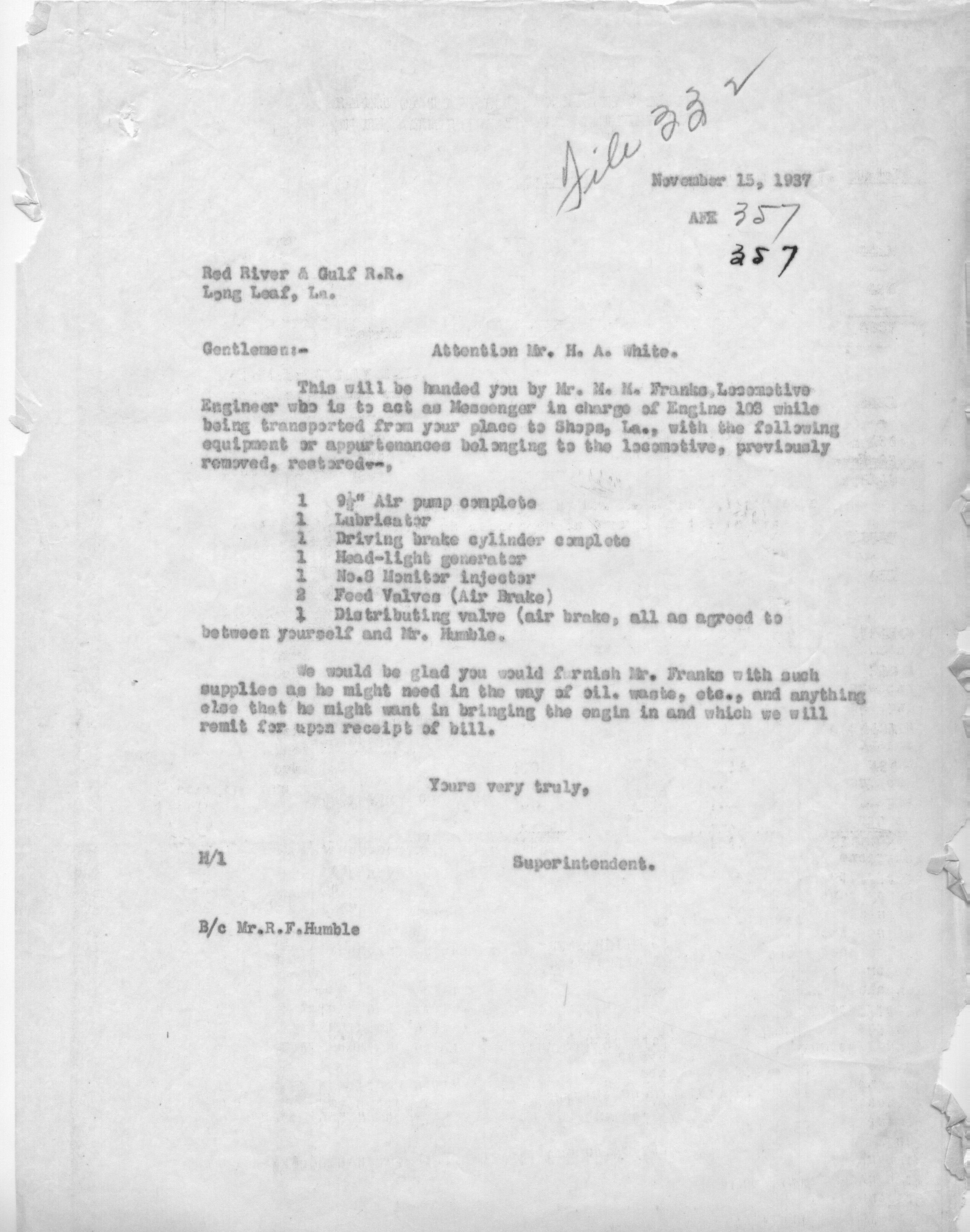 Letter to Red River & Gulf Railroad from R. F. Humble Nov 1937 (2)Entry/Object ID