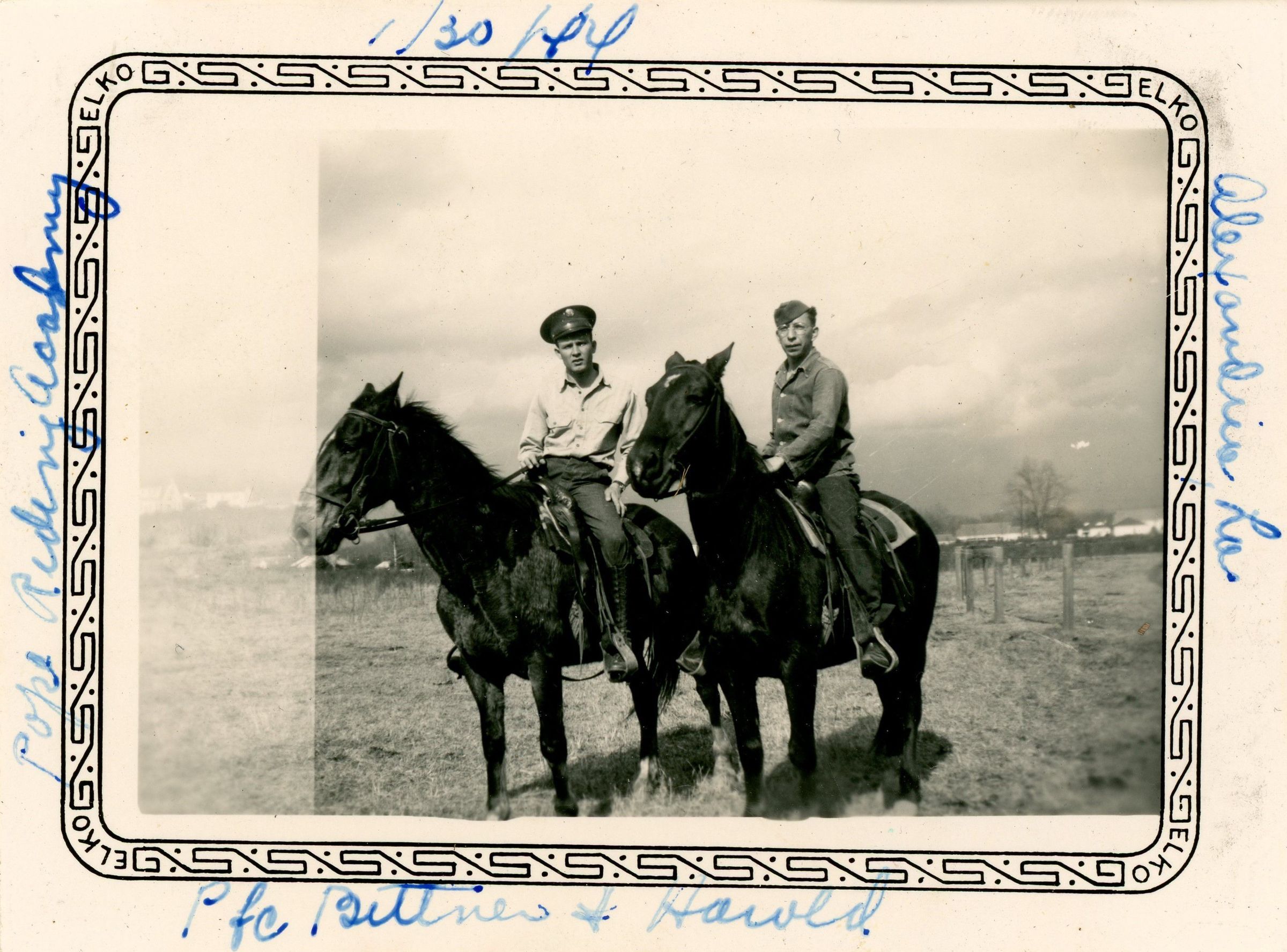 Photo at Pope Riding Academy, Alexandria, Louisiana, January 30, 1944, with handwritten inscription "Pfc Bittner + Harold"Photograph Details
