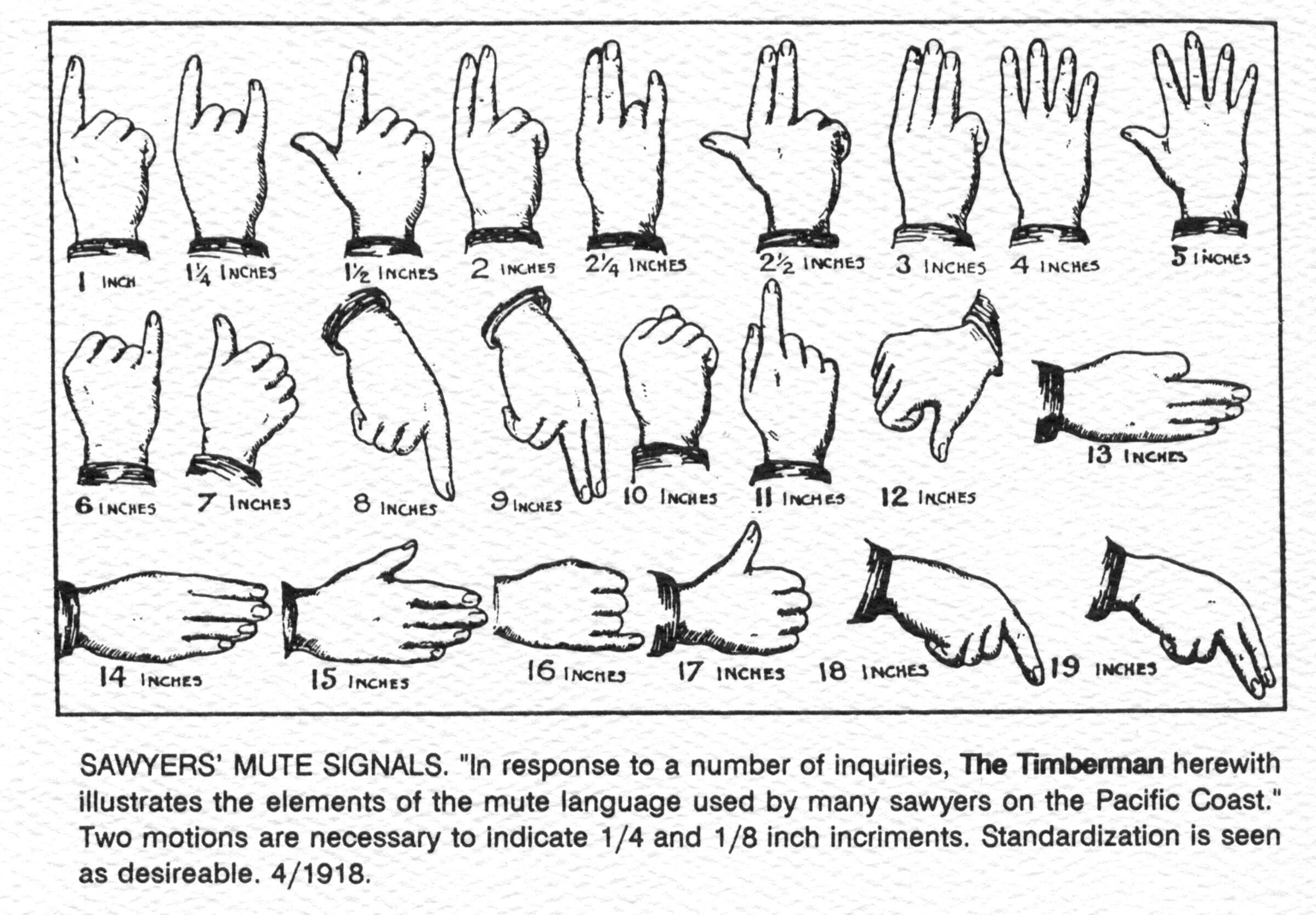 a diagram of the hand signals sawyers used in the mill to talk in regarding the length or width of the lumberDate(s) of Creation