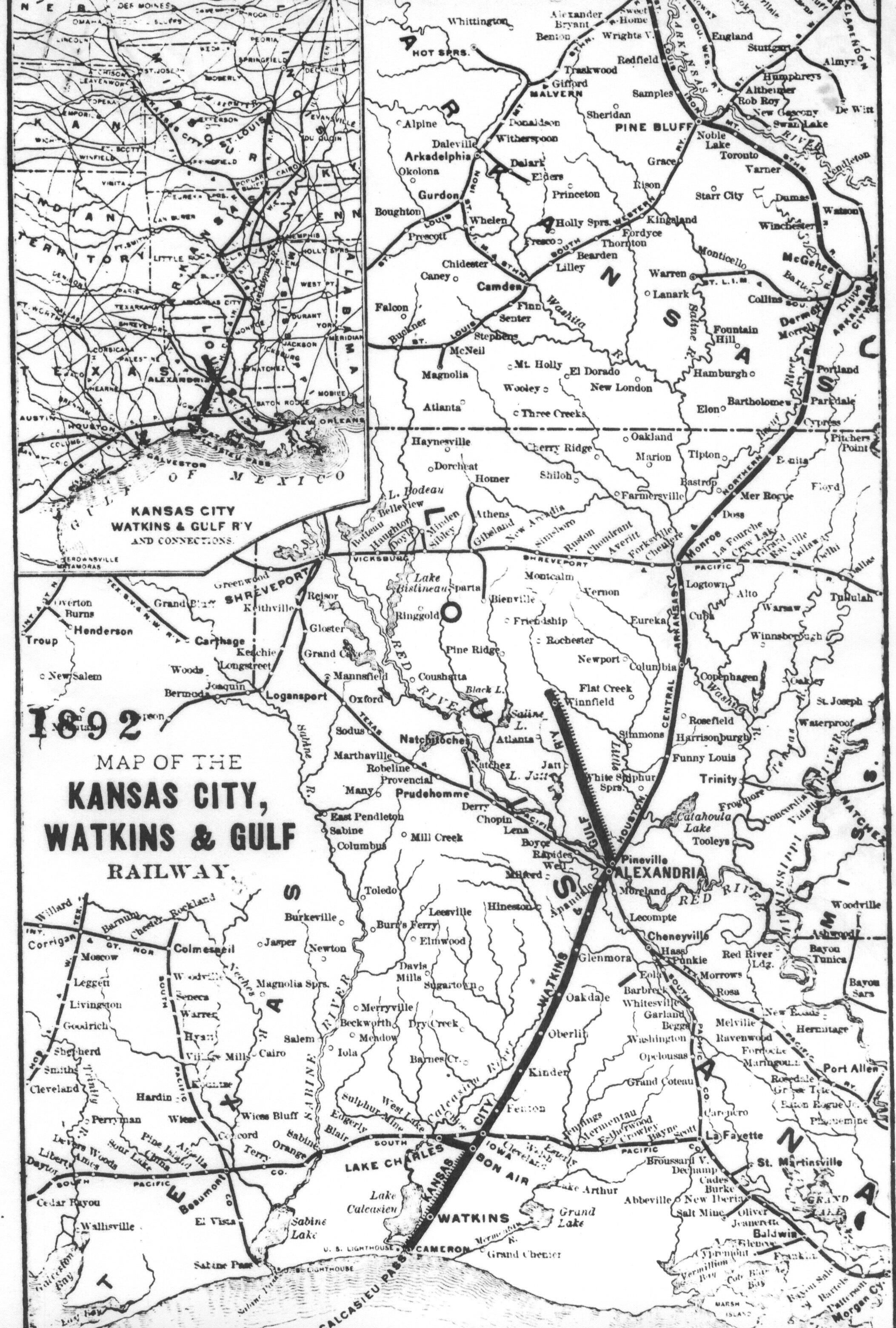 the map of Kansas City, Watkins & Gulf Railroad Co.; shows the states LA, TX and Arkansas; the railway goes through Alexandria, LACollection