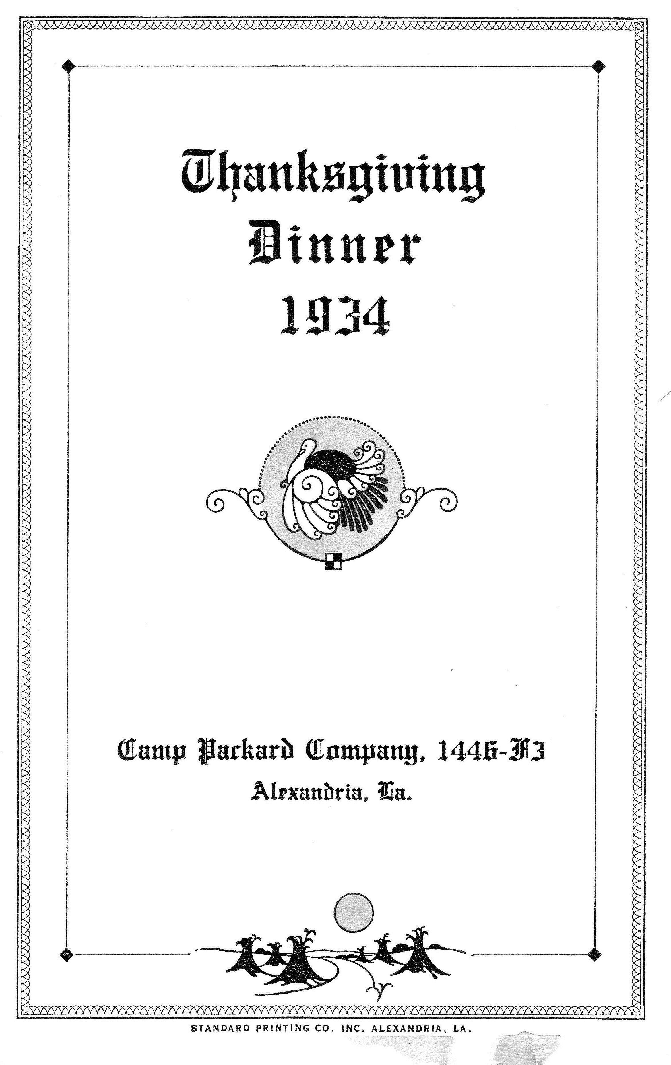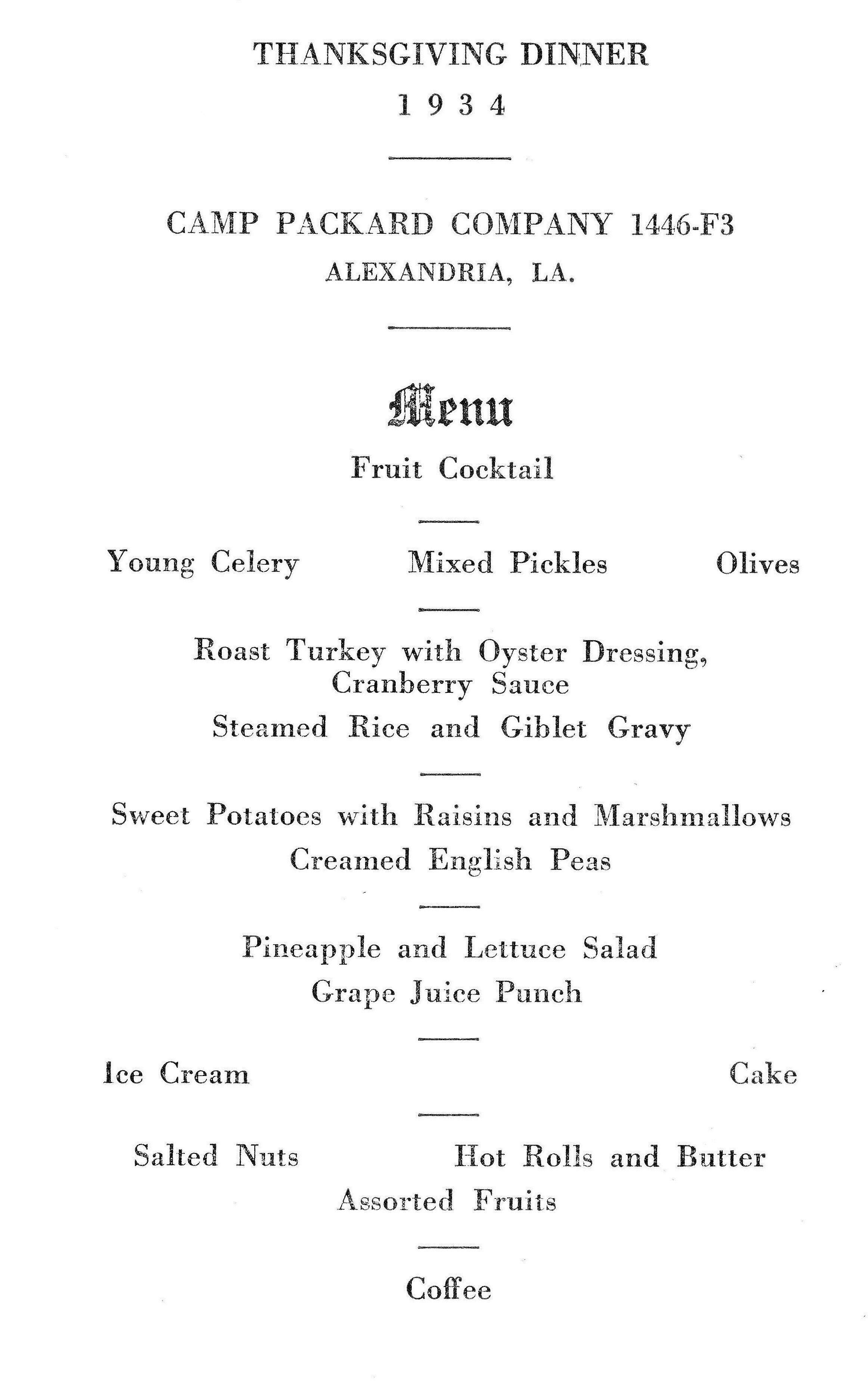 Camp Packard, Co. 1446-F3; had along the lines of fruit, vegetables, a roast turkey, grape punch, coffee, rolls, and dessert; Alexandria, LACreator