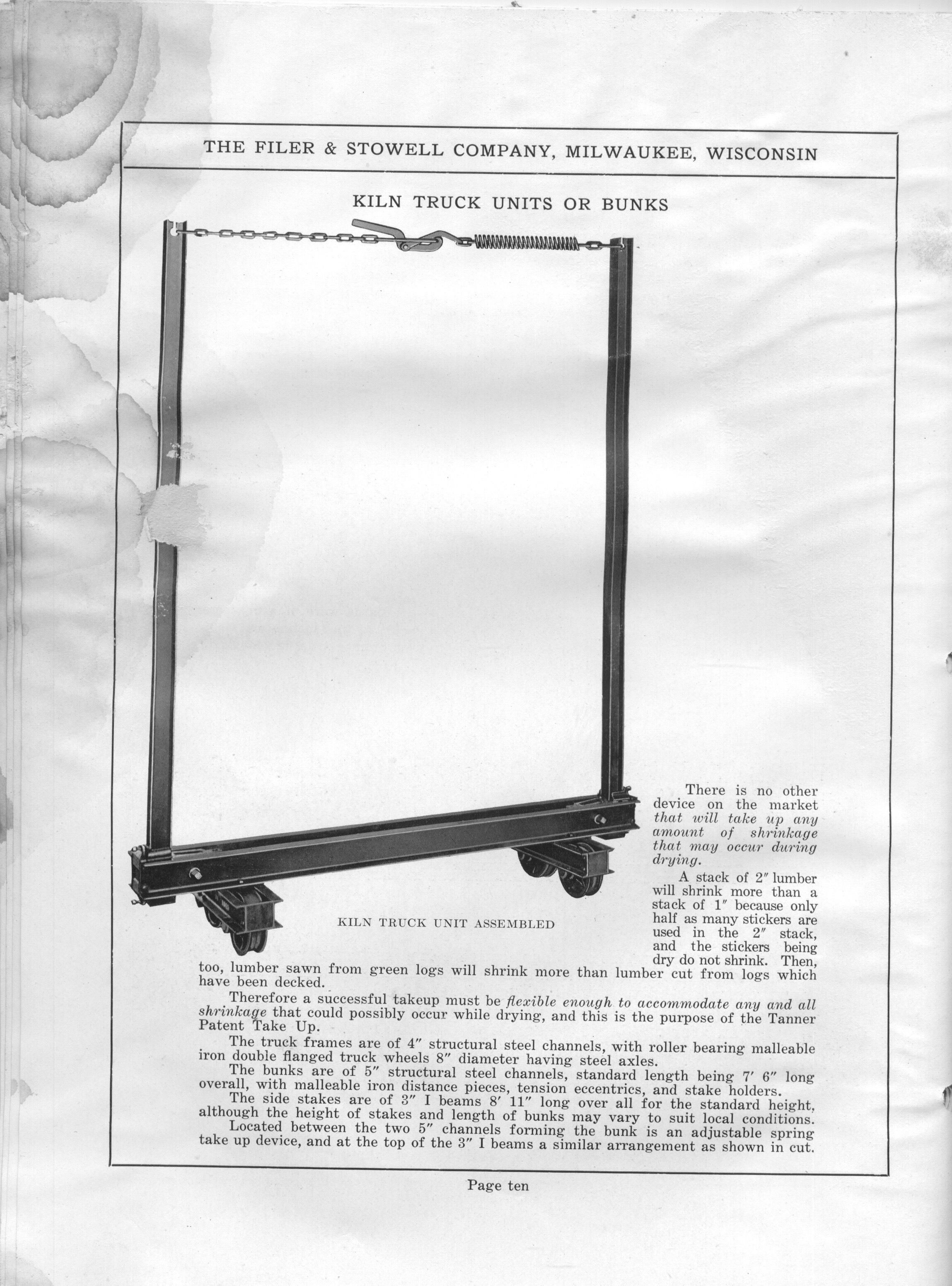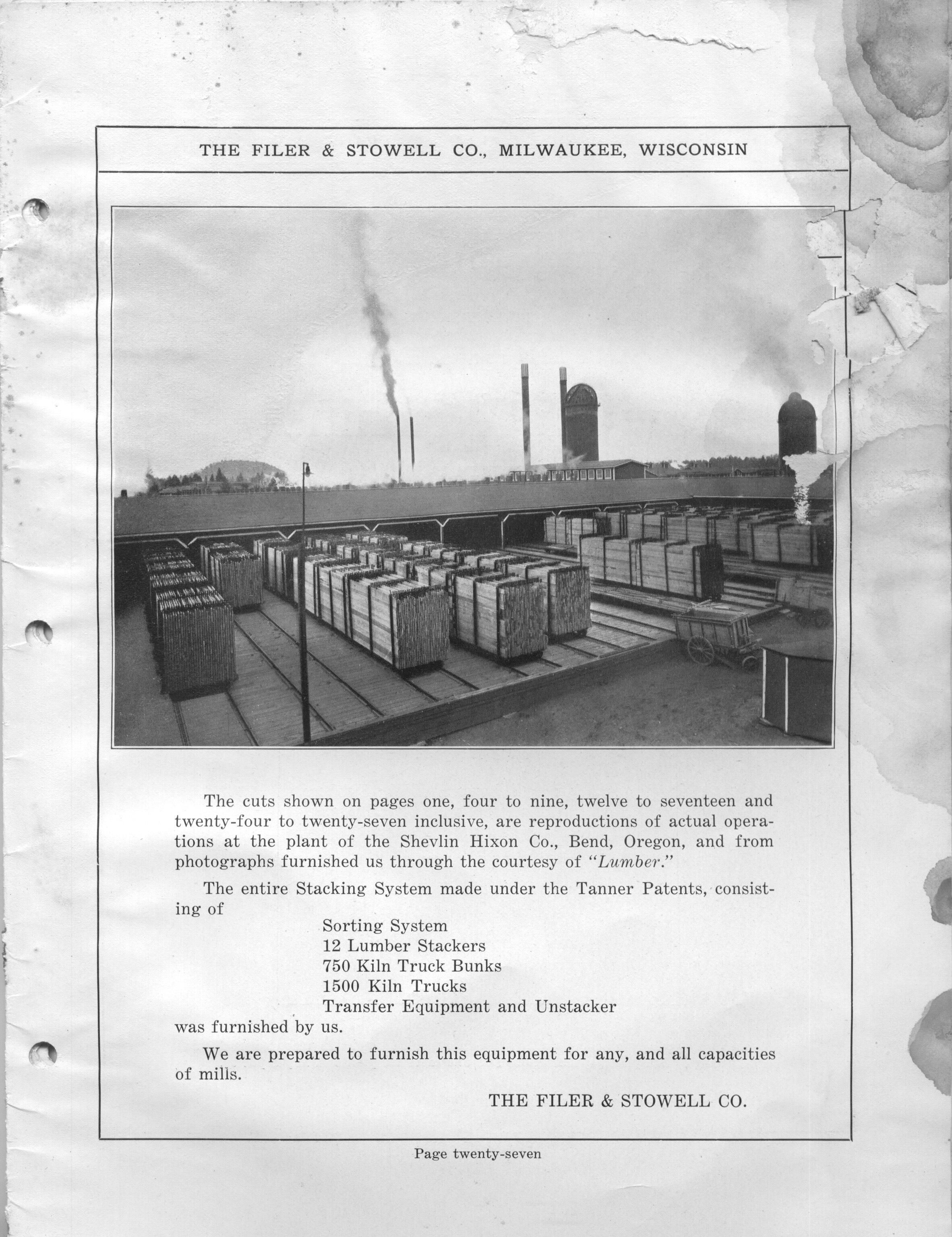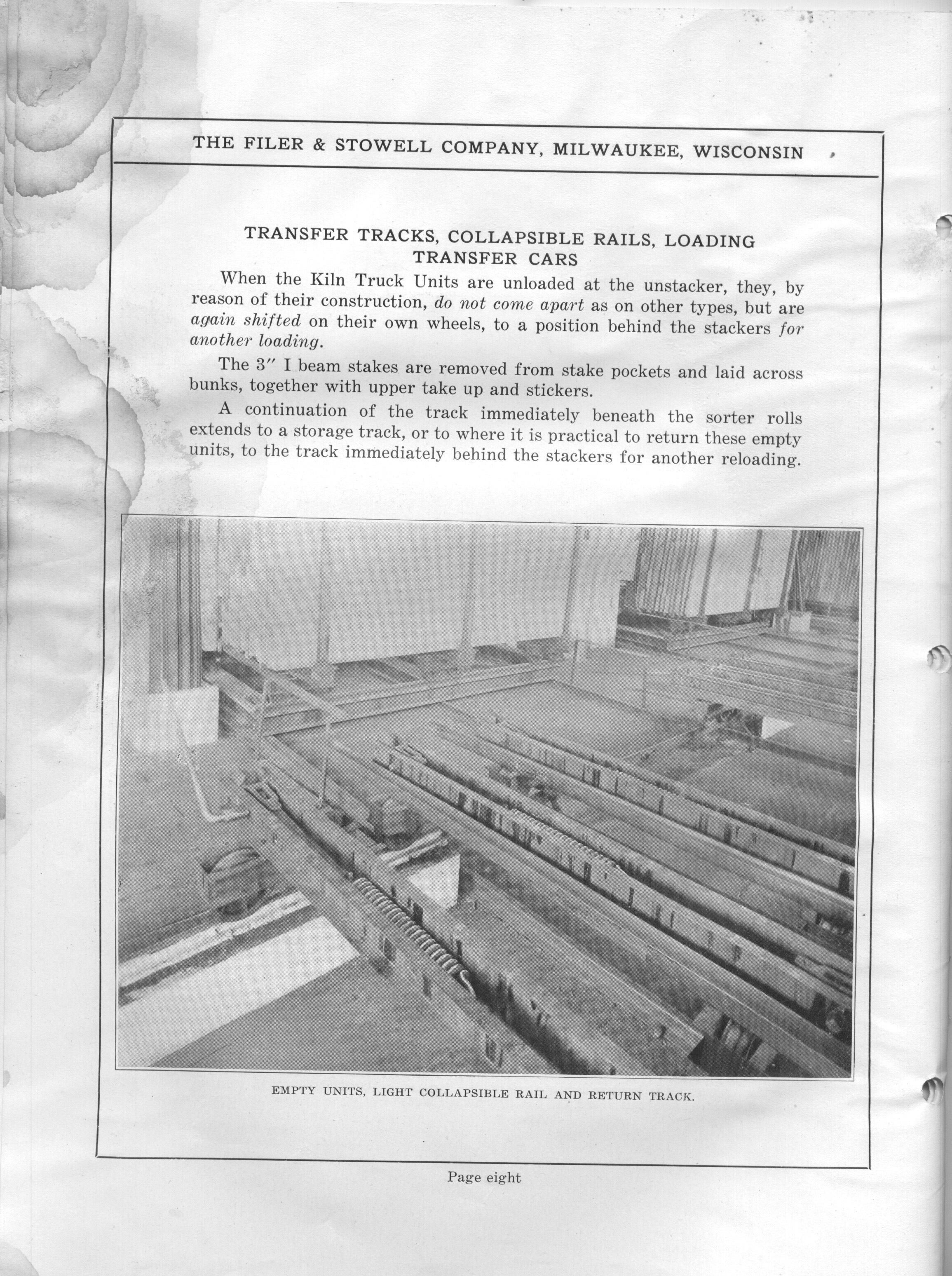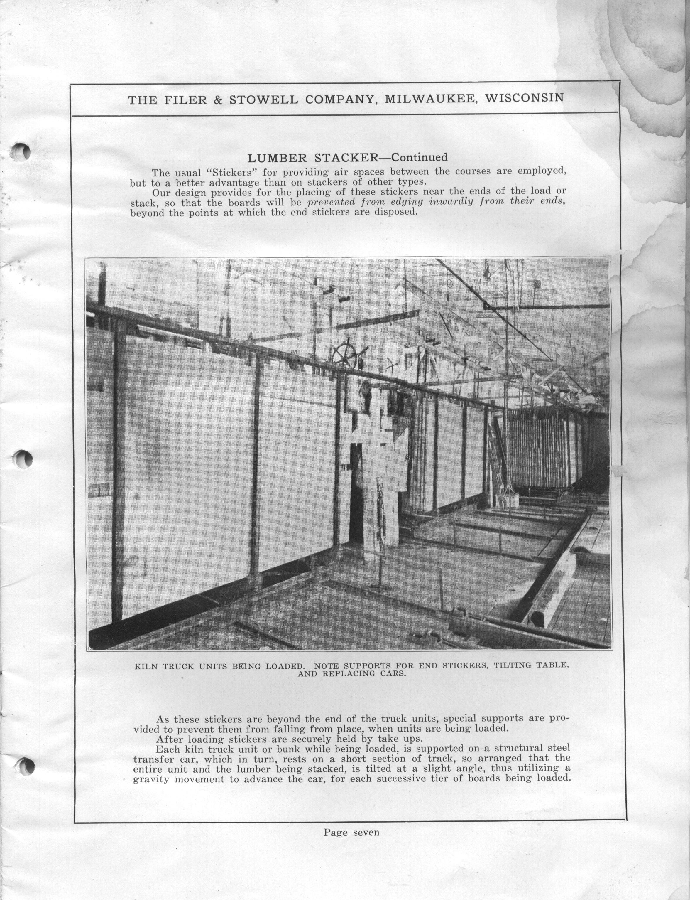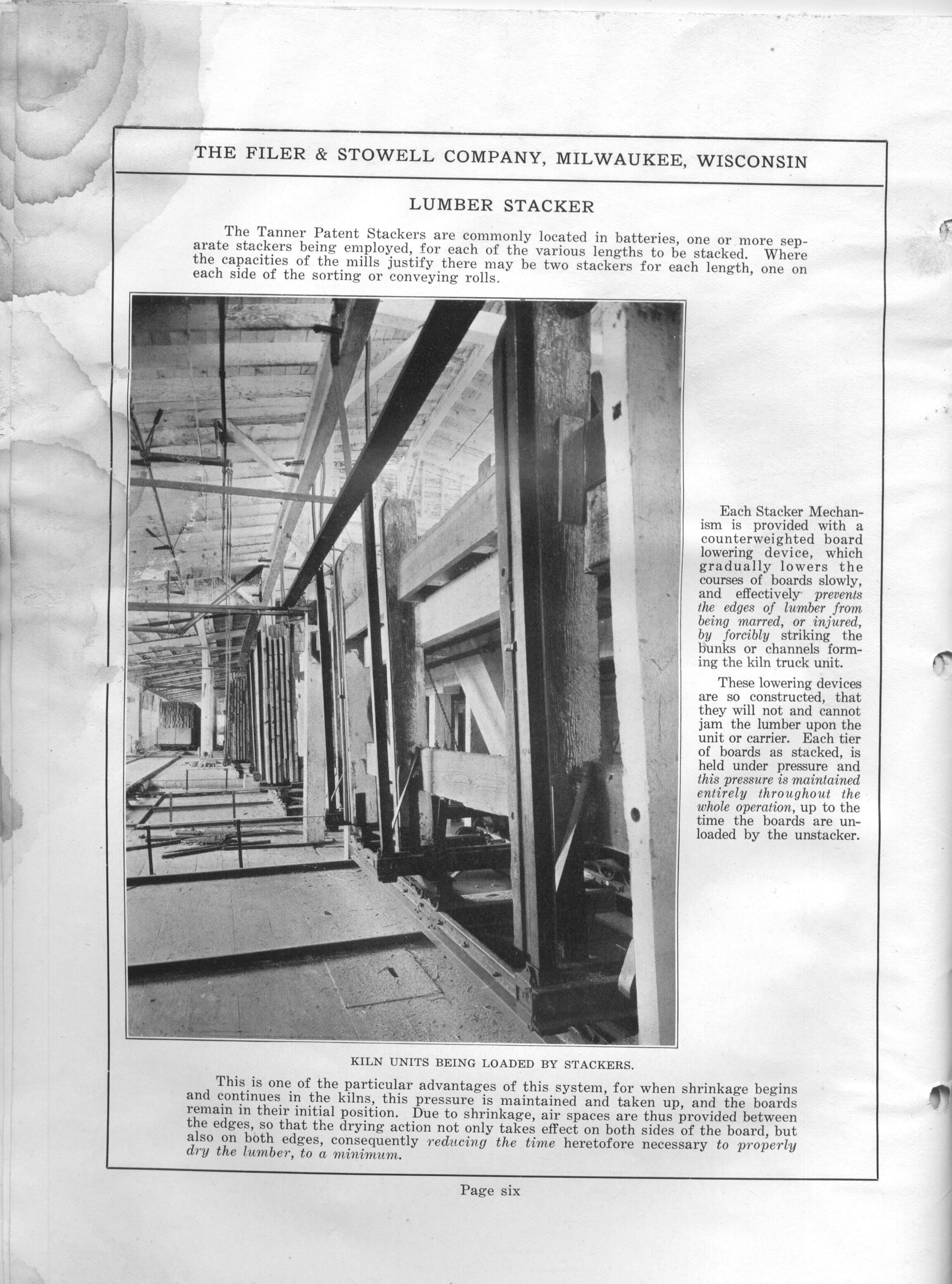 aerial drawing of the Filer & Stowell Co.; features the Tanner patent edge lumber stacking system, a complete automatic operating system; which consisted of: Lumber sorter (2 channel), Lumber stacker, Transfer tracks of collapsible rails and loading transfer cars, Kiln truck units or bunks, Power transfer car, Cable operating or driving rig, Special power transfer car, Electric power transfer car, Unstacker or unloaderContext