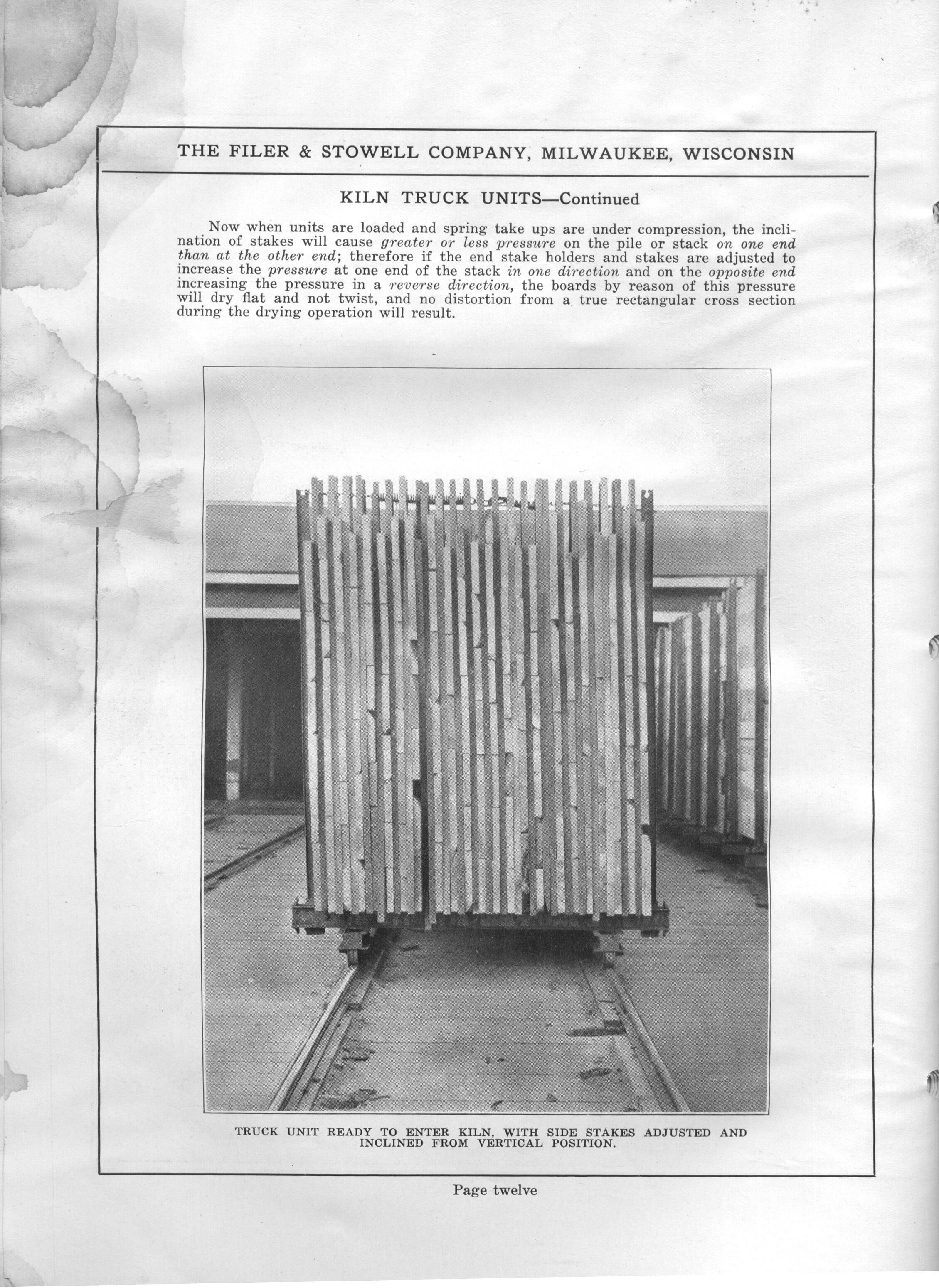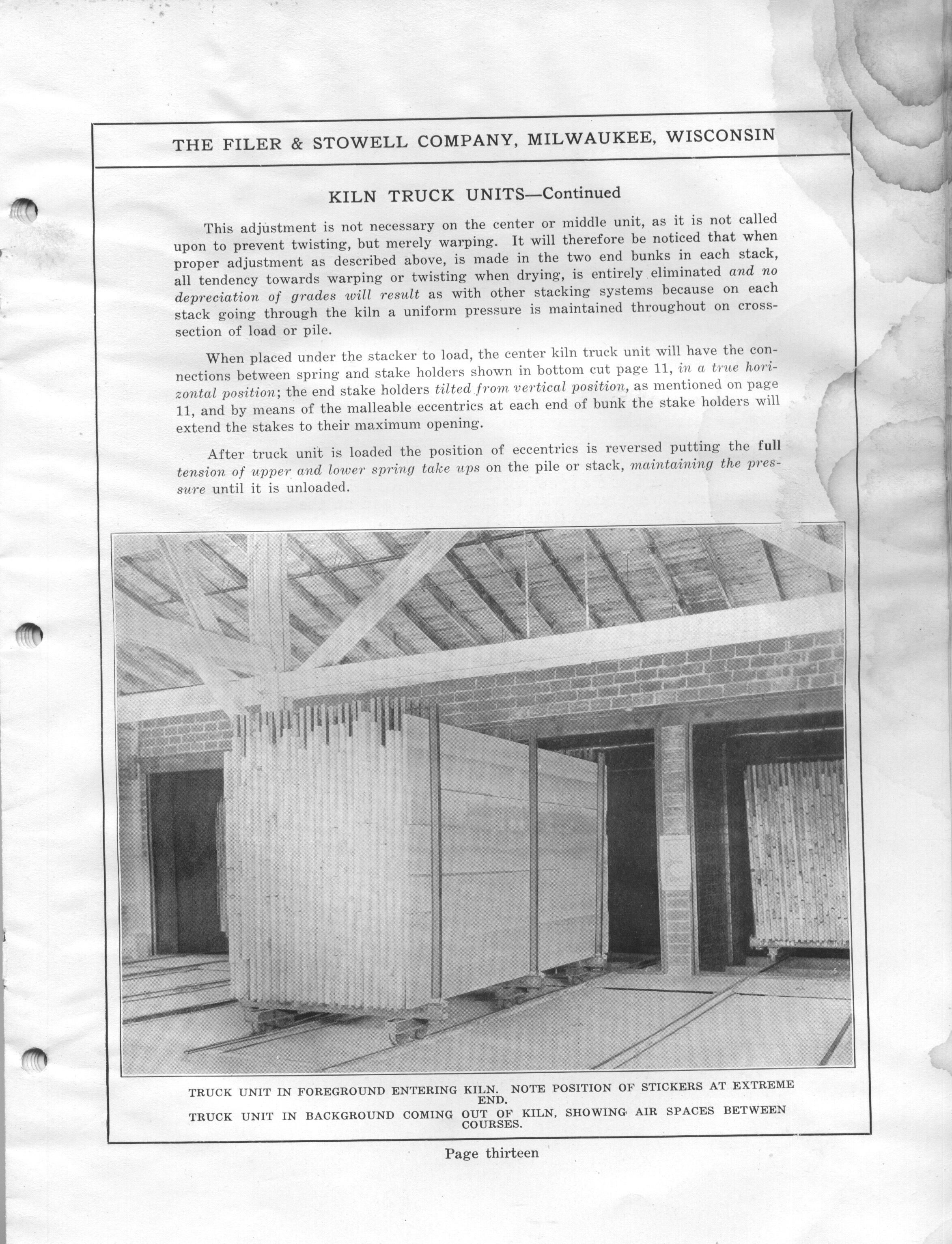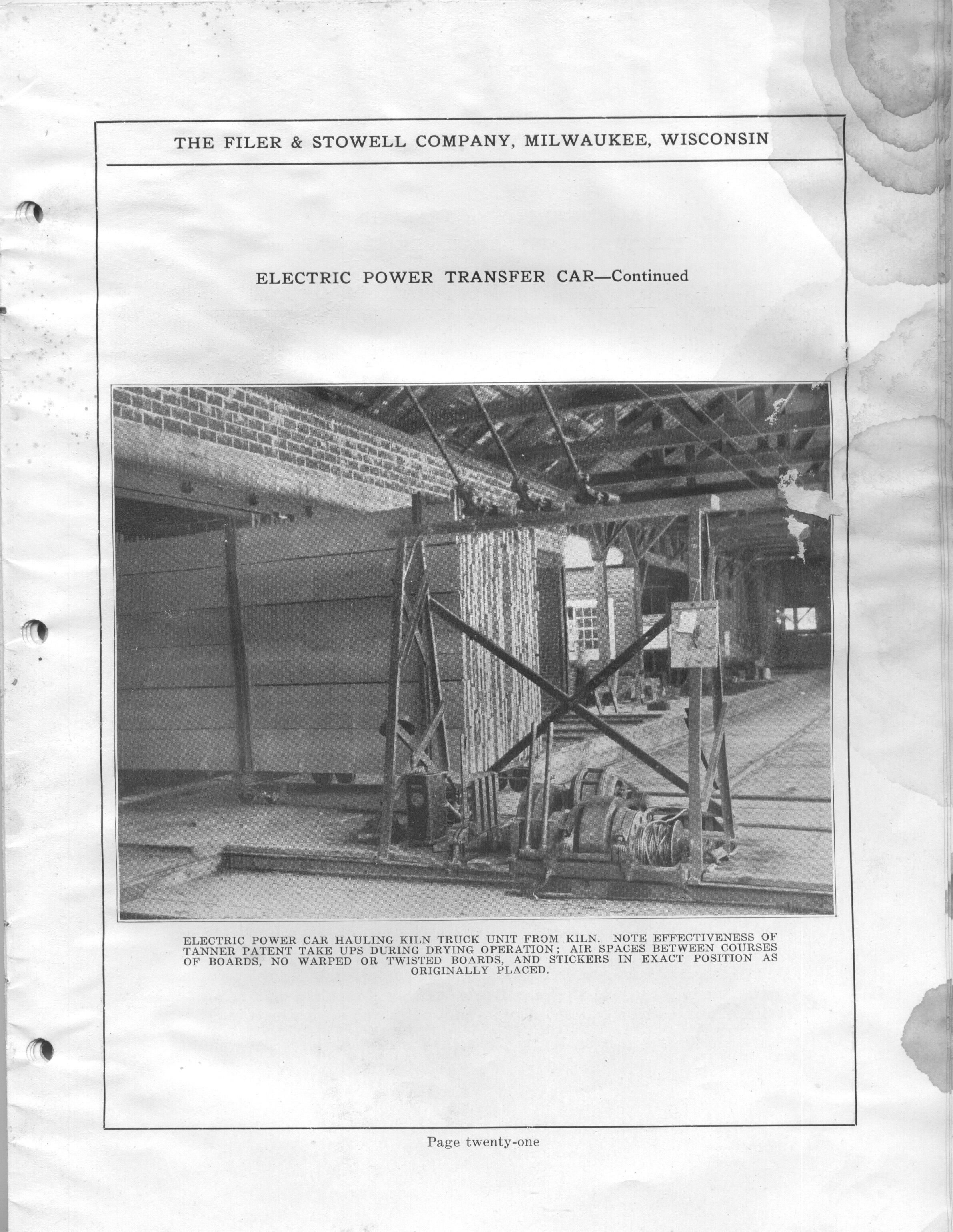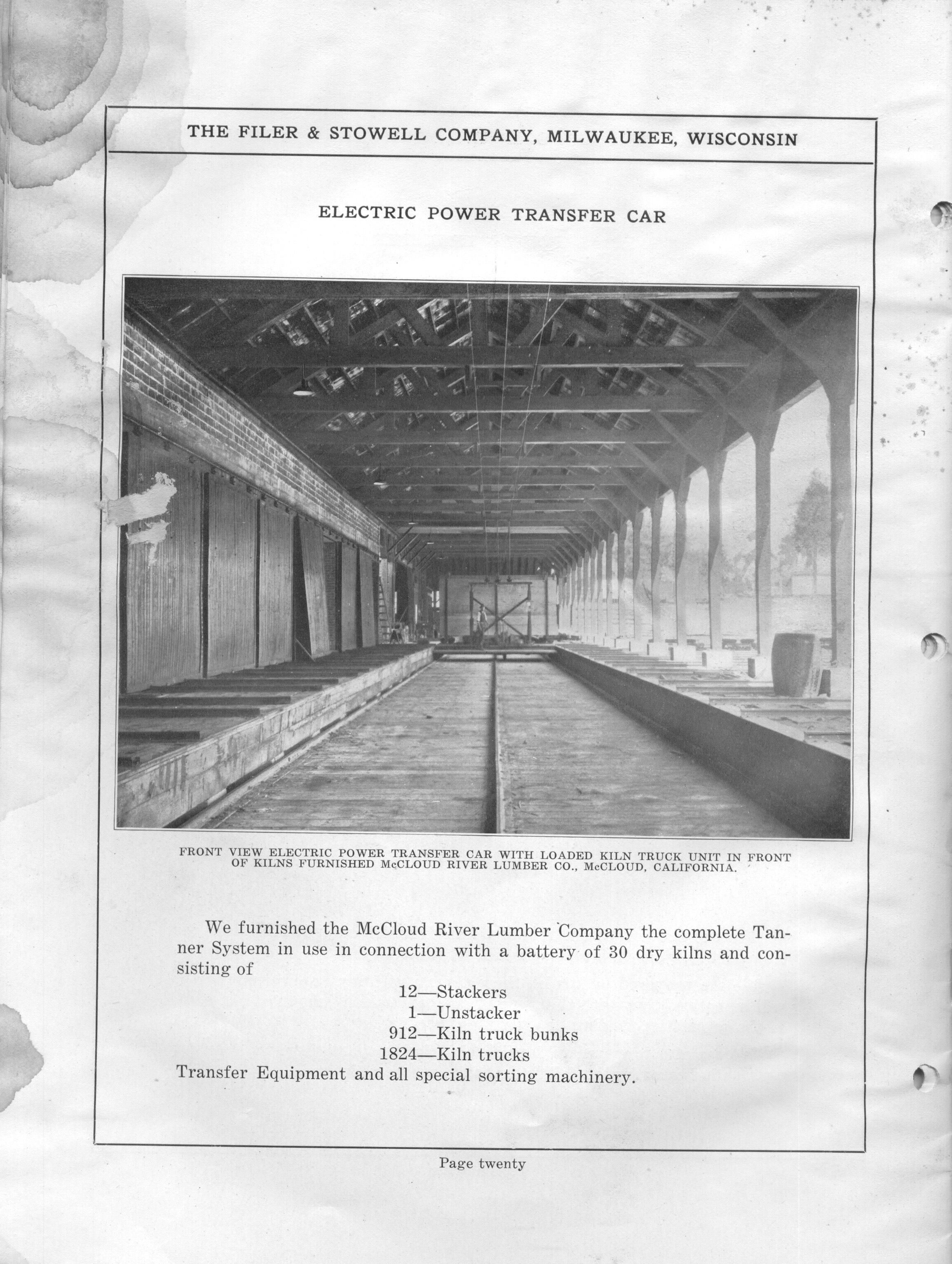 aerial drawing of the Filer & Stowell Co.; features the Tanner patent edge lumber stacking system, a complete automatic operating system; which consisted of: Lumber sorter (2 channel), Lumber stacker, Transfer tracks of collapsible rails and loading transfer cars, Kiln truck units or bunks, Power transfer car, Cable operating or driving rig, Special power transfer car, Electric power transfer car, Unstacker or unloaderContext
