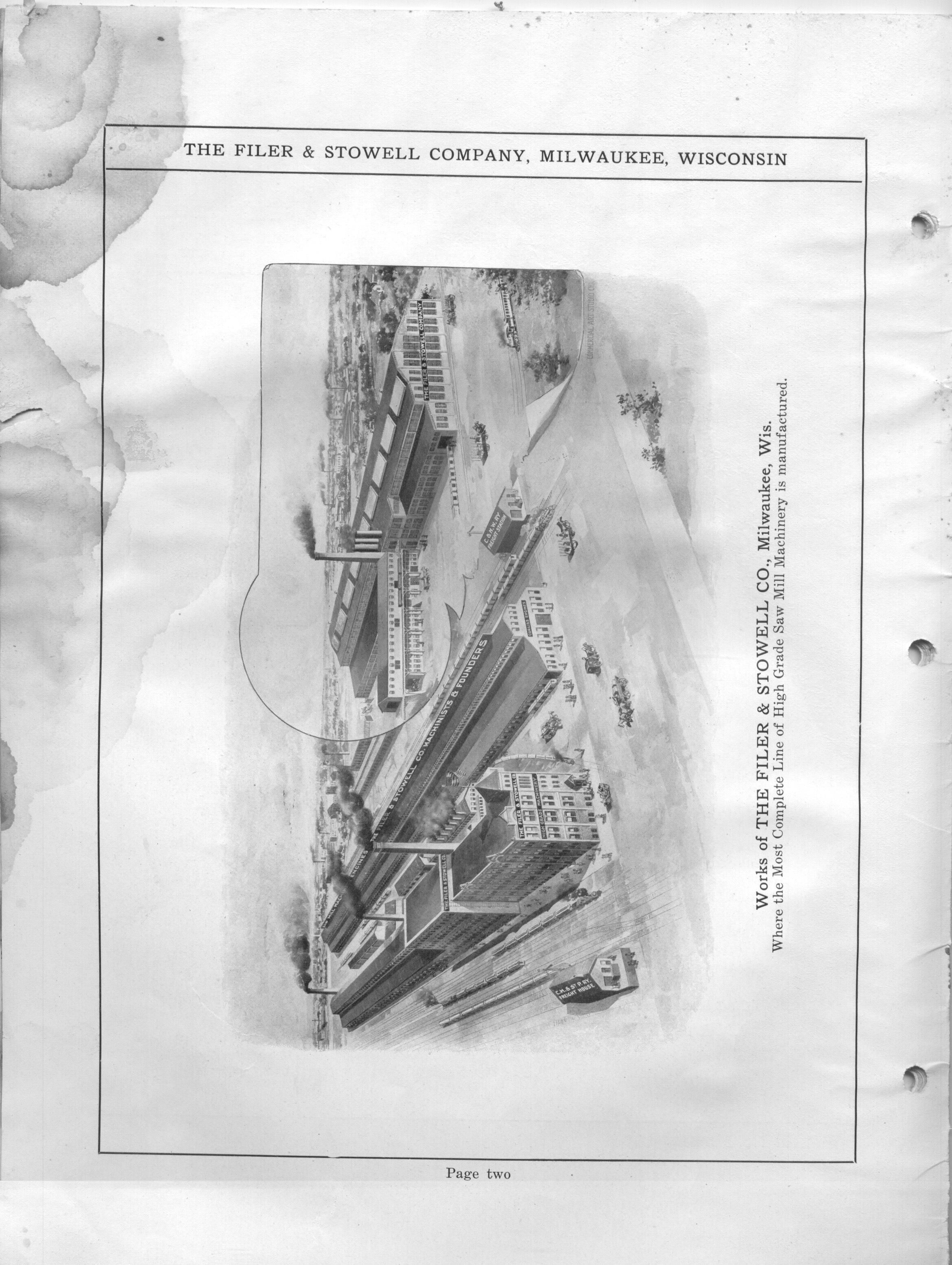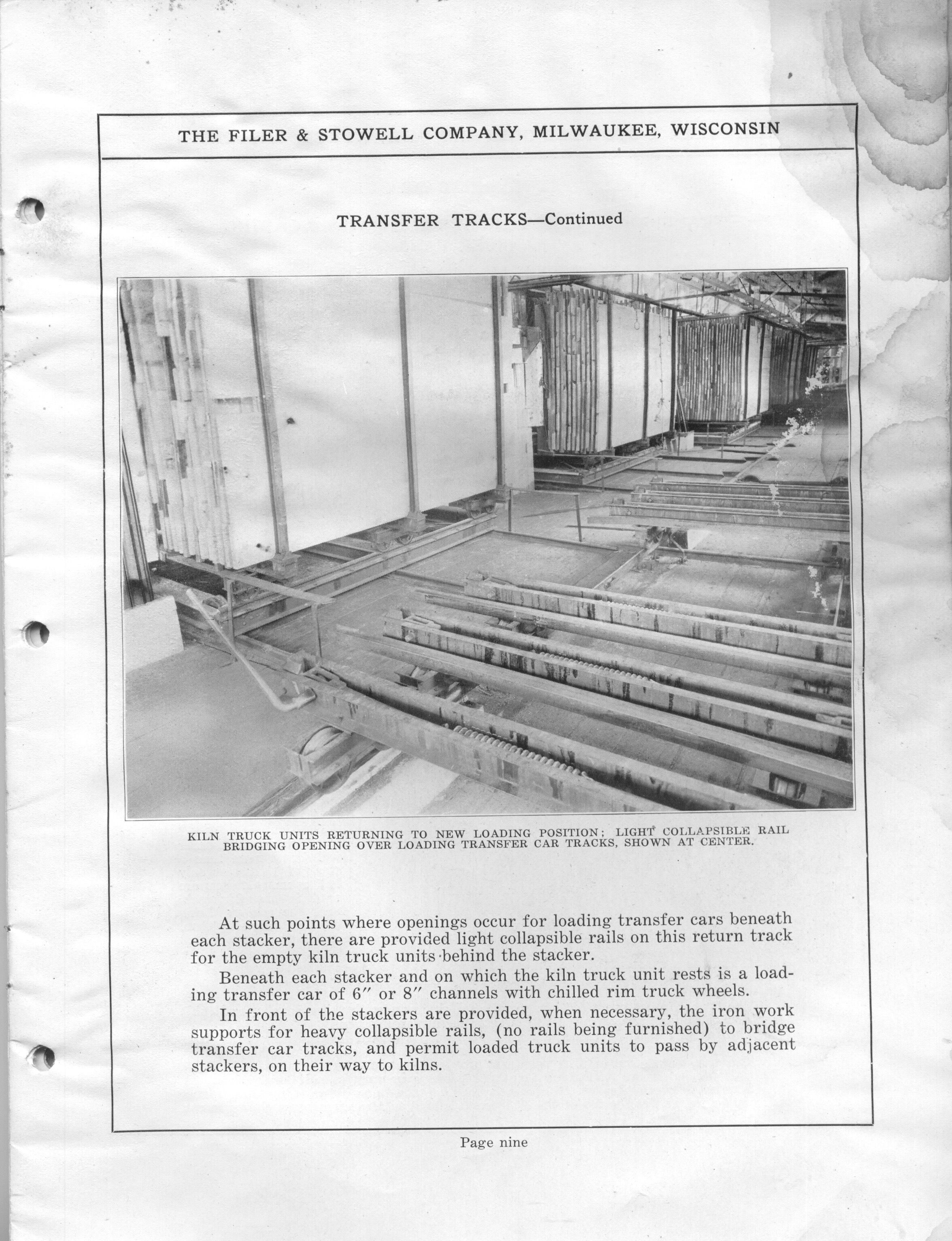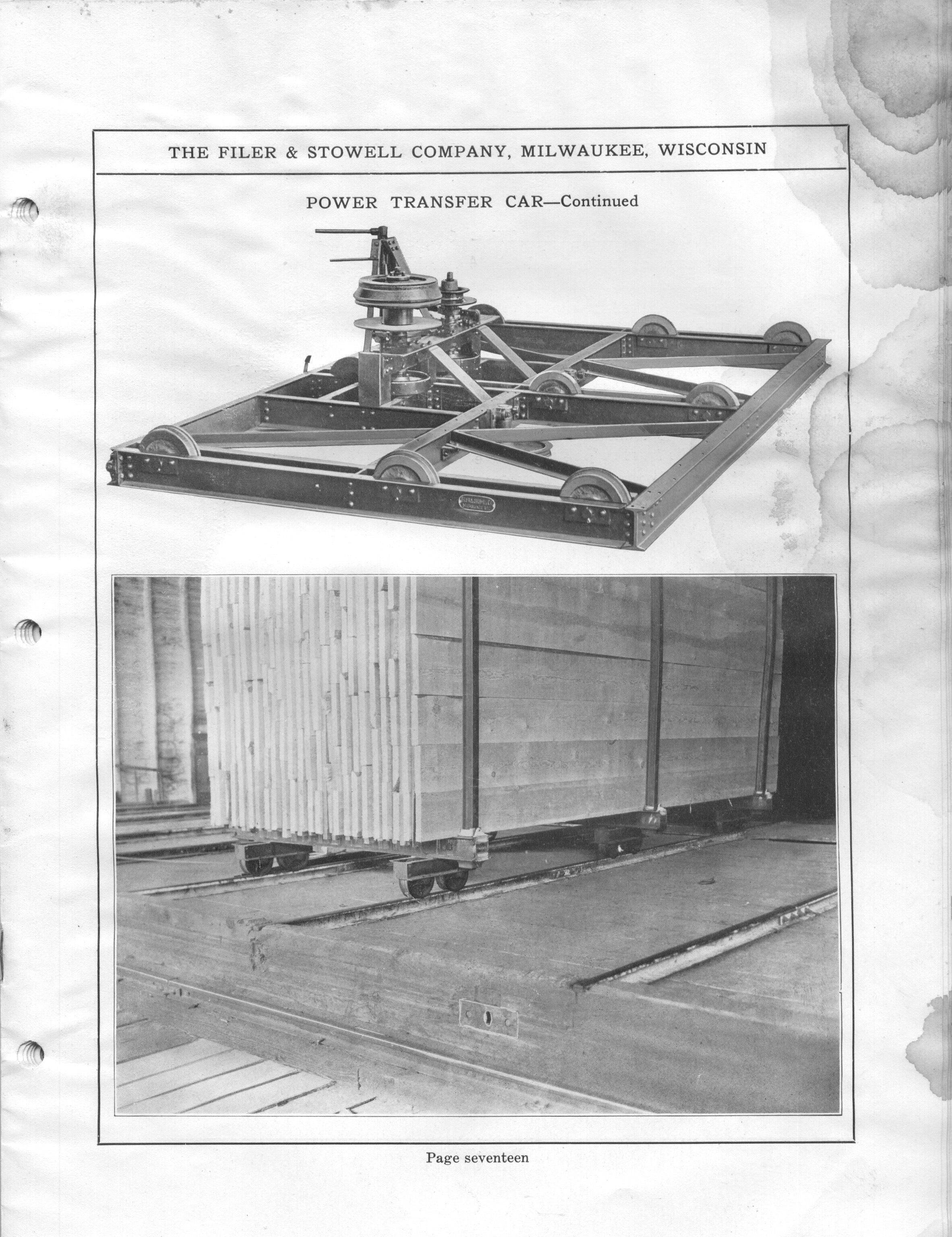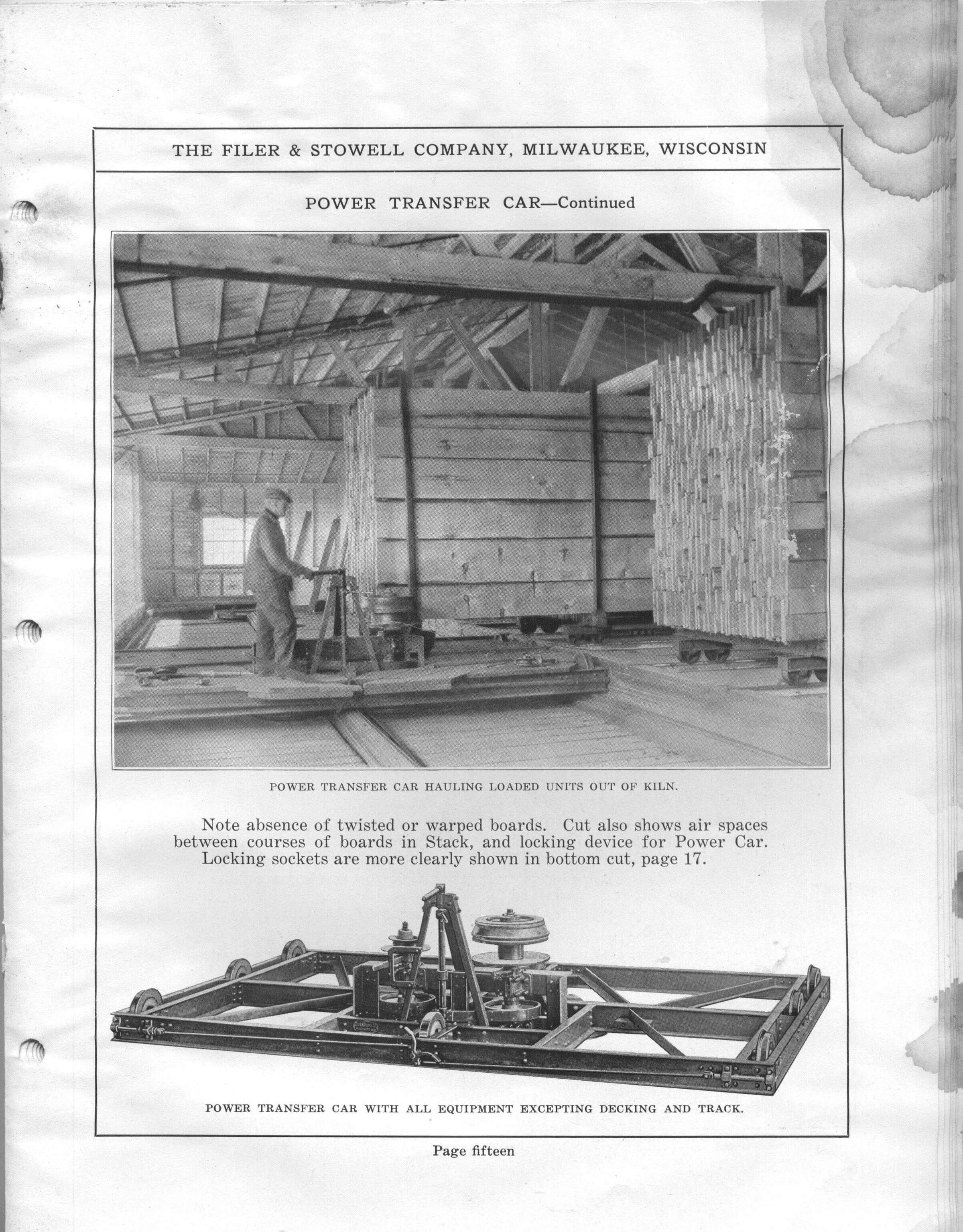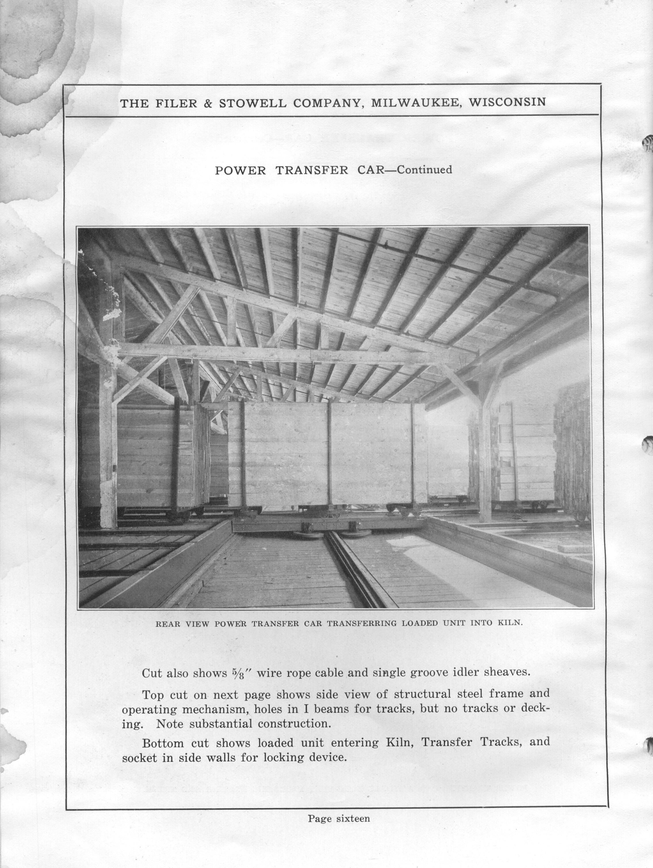 aerial drawing of the Filer & Stowell Co.; features the Tanner patent edge lumber stacking system, a complete automatic operating system; which consisted of: Lumber sorter (2 channel), Lumber stacker, Transfer tracks of collapsible rails and loading transfer cars, Kiln truck units or bunks, Power transfer car, Cable operating or driving rig, Special power transfer car, Electric power transfer car, Unstacker or unloaderContext