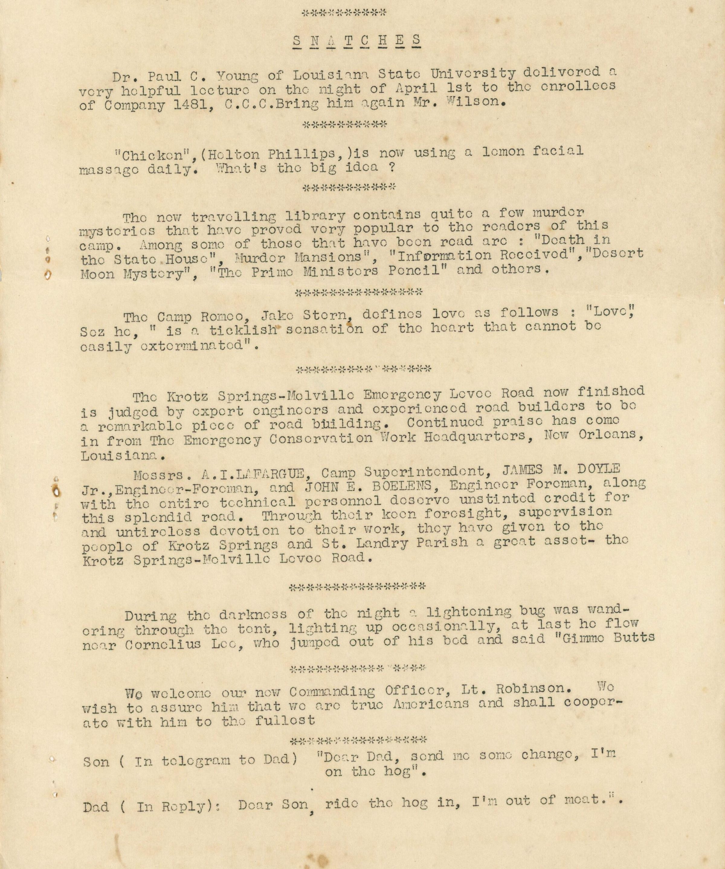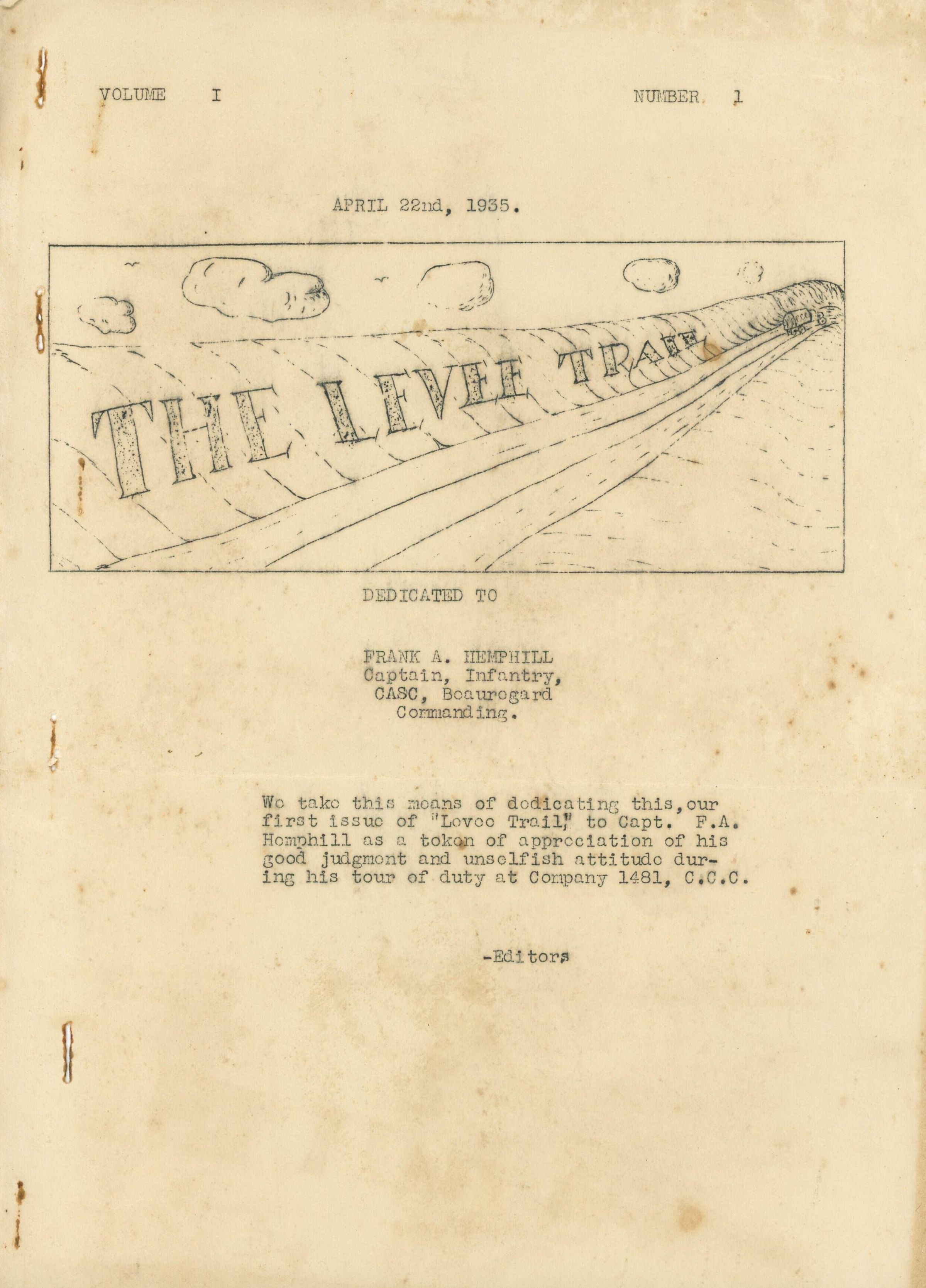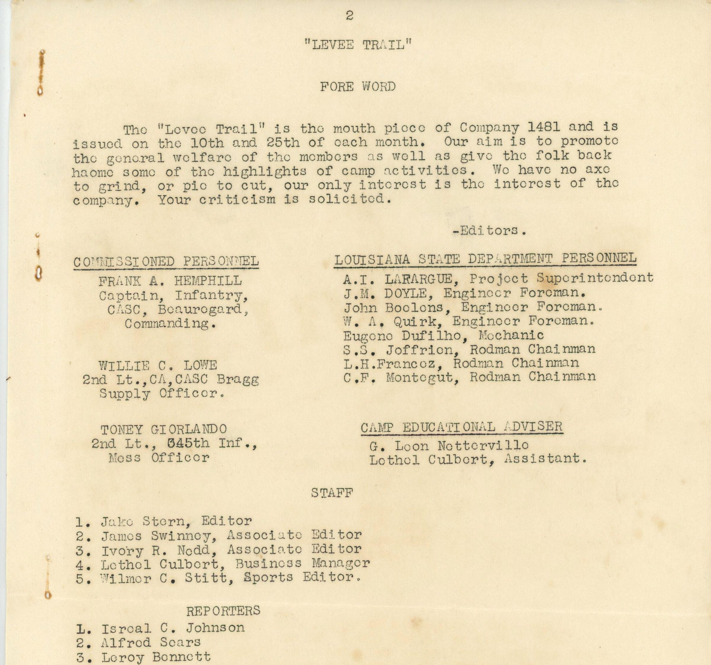 editors Louisiana State Dept. Personnel: A. I. Larargue project superintendent, J. M. Dooyle engineer foreman, John Boolons engineer foreman, W. A. Quirk engineer foreman, Eugone Dufilho mechanic, S. S. Joffrion rodman chainman, L. H. Francoz rodman chainman, and C. F. Montogut rodman chainman