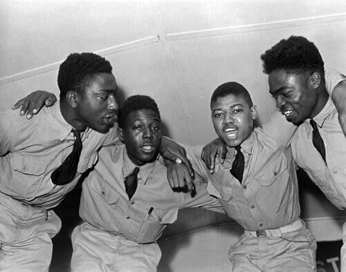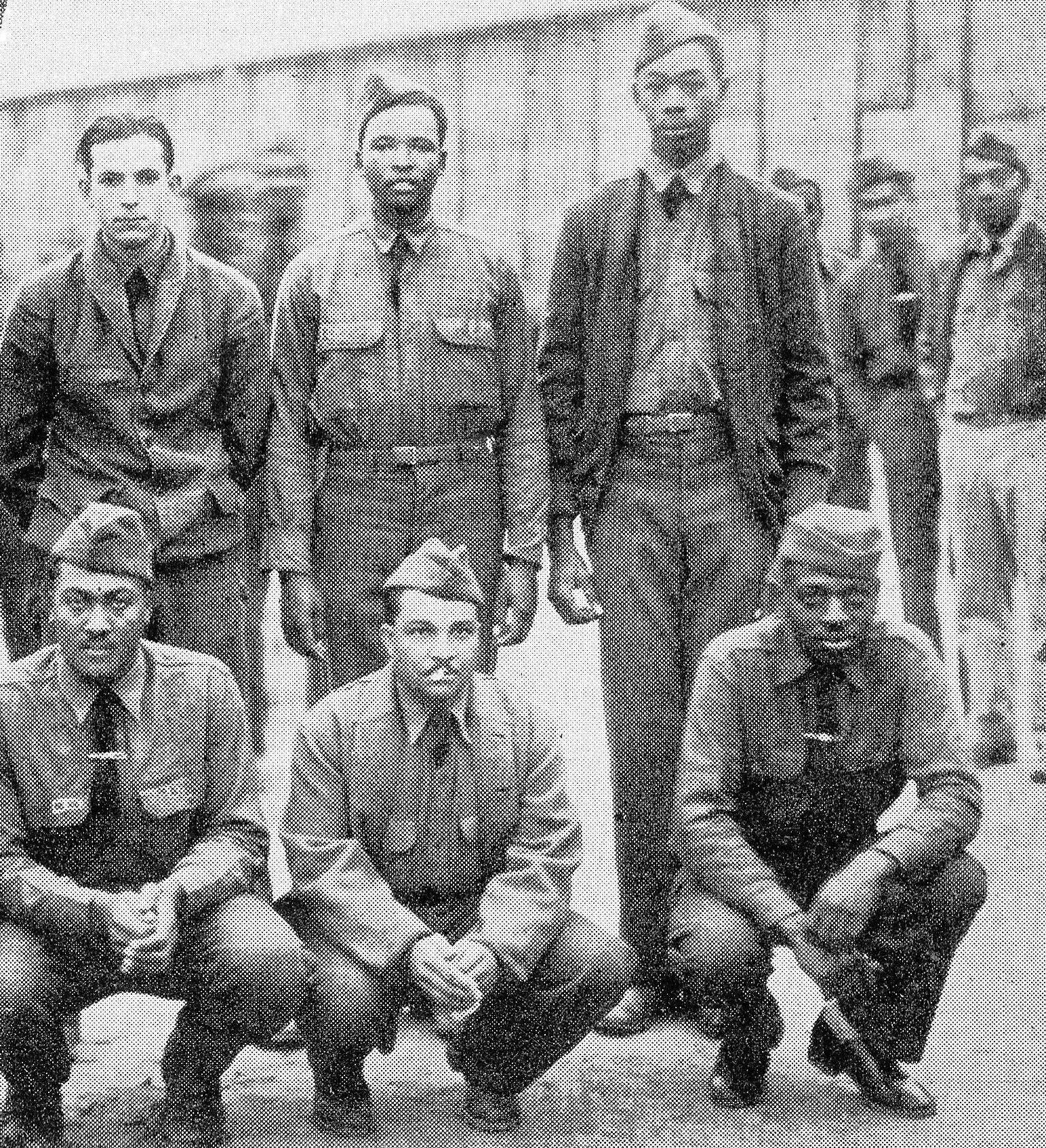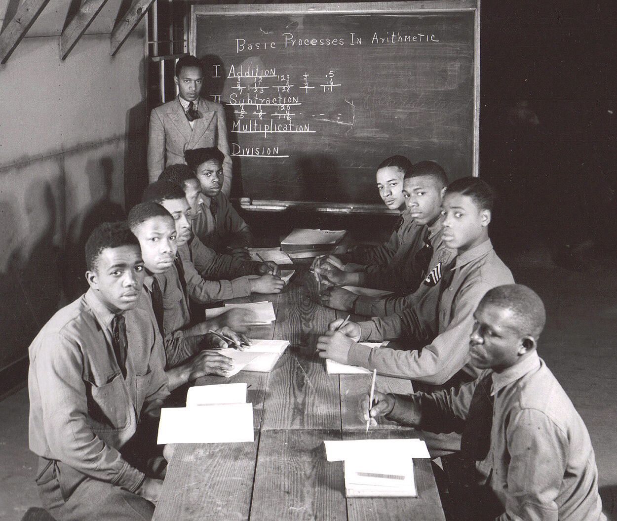 African American CCC boys; were provided an education; 1 teacher and 9 students; 6 African Americans of the Army, more in the background; working on a levee camp; an African American CCC quartetPhotograph Details