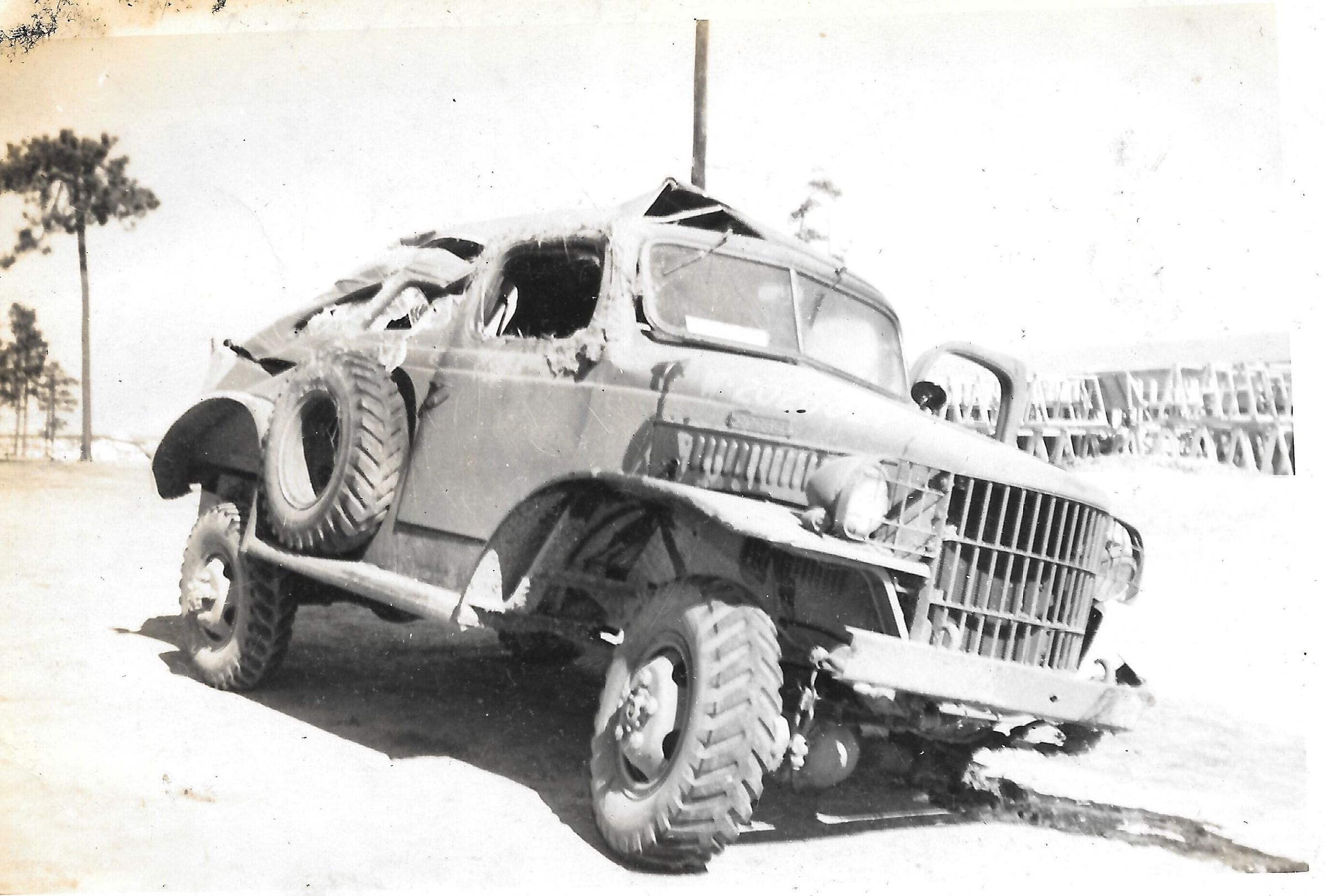 A smashed jeep, left vacant at Camp Claiborne.Photograph Details