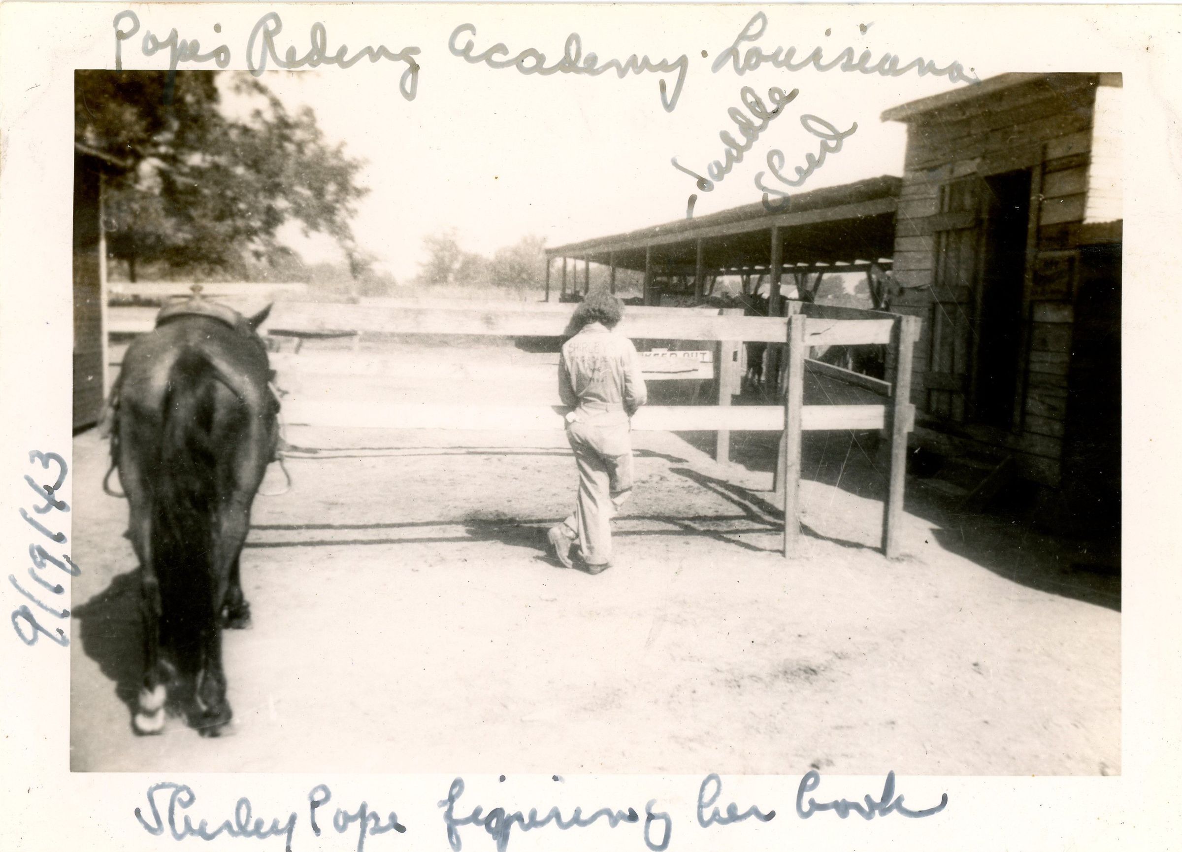 Pope's Riding Academy - Louisiana; 9/19/43; Shirley Pope [unintelligible] her [unintelligible]; NOTE: Saddle ShedMaterial/Technique