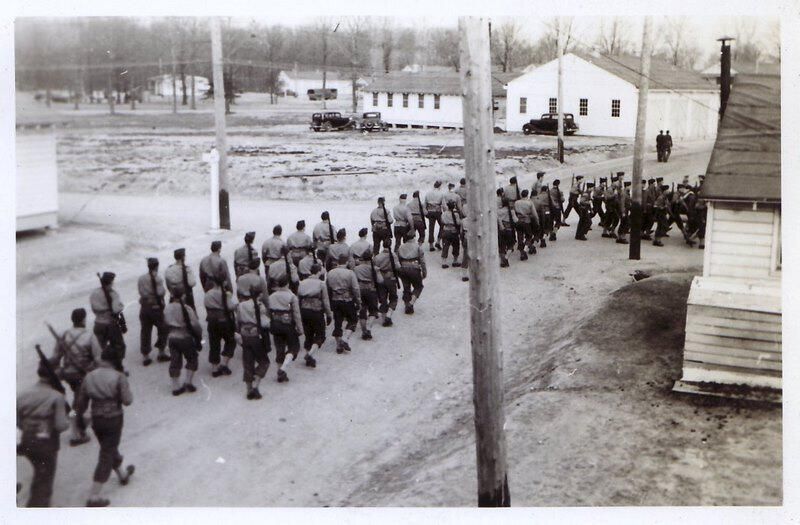 A group of soldiers marches away from the barracks where this photo was taken, seemingly on the second floor.