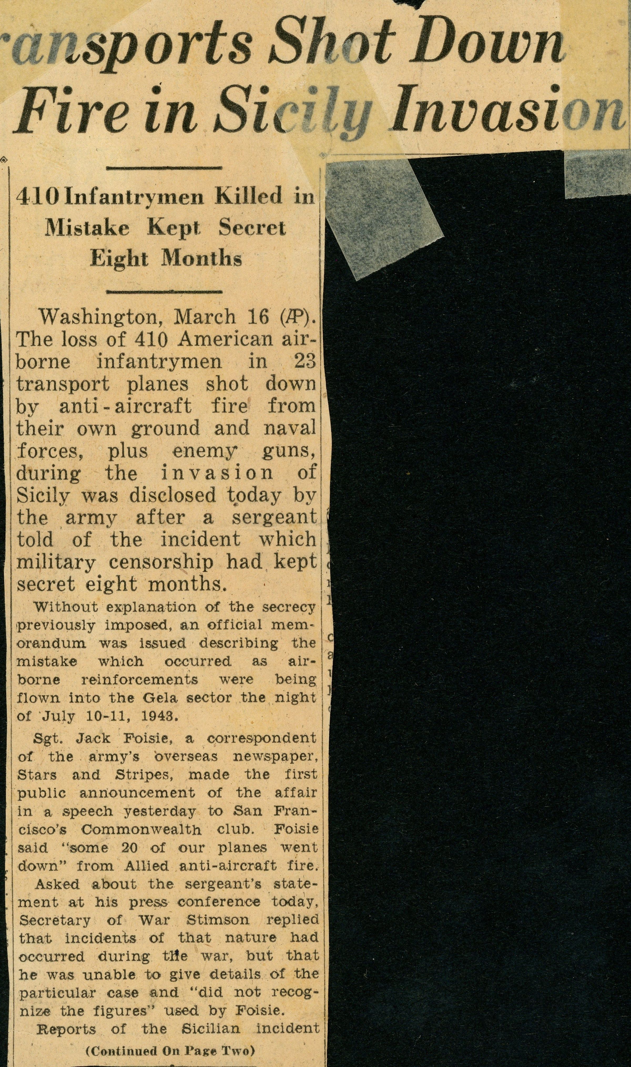 Camp Claiborne - Newspaper Clipping - "Transports Shot Down Fire in Sicily Invasion"Entry/Object ID
