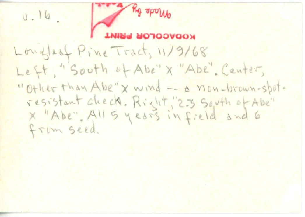 No. 16 Longleaf Pine Tract, 11/9/68 Left, "South of Abe" x 'Abe". Center, "other than Abe" x wind--a non-brown-spot-resistant check. Right, "2.3 South of Abe" x 'Abe". All 5 years in field and 6 from seedMaterial/Technique