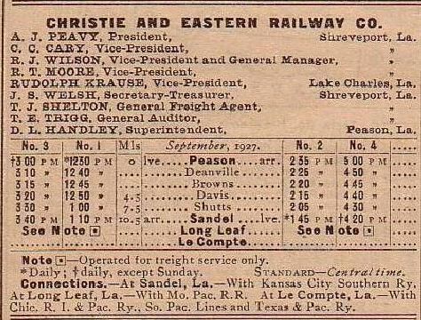the officials in 1927 were A. J. Peavy president at Shreveport, C. C. Cray vice president at Shreveport, R. J. Wilson vice president and general manger at Peason, R. T. Moore vice president at Shreveport, Rudolph Krause secretary and treasurer at Lake Charles, J. S. Welsh assistant secretary-treasurer at Lake Charles, T. J. Shelton general freight agent at Shreveport, T. E. Trigg auditor at Shreveport, D. L. Handley superintendent at Peason;