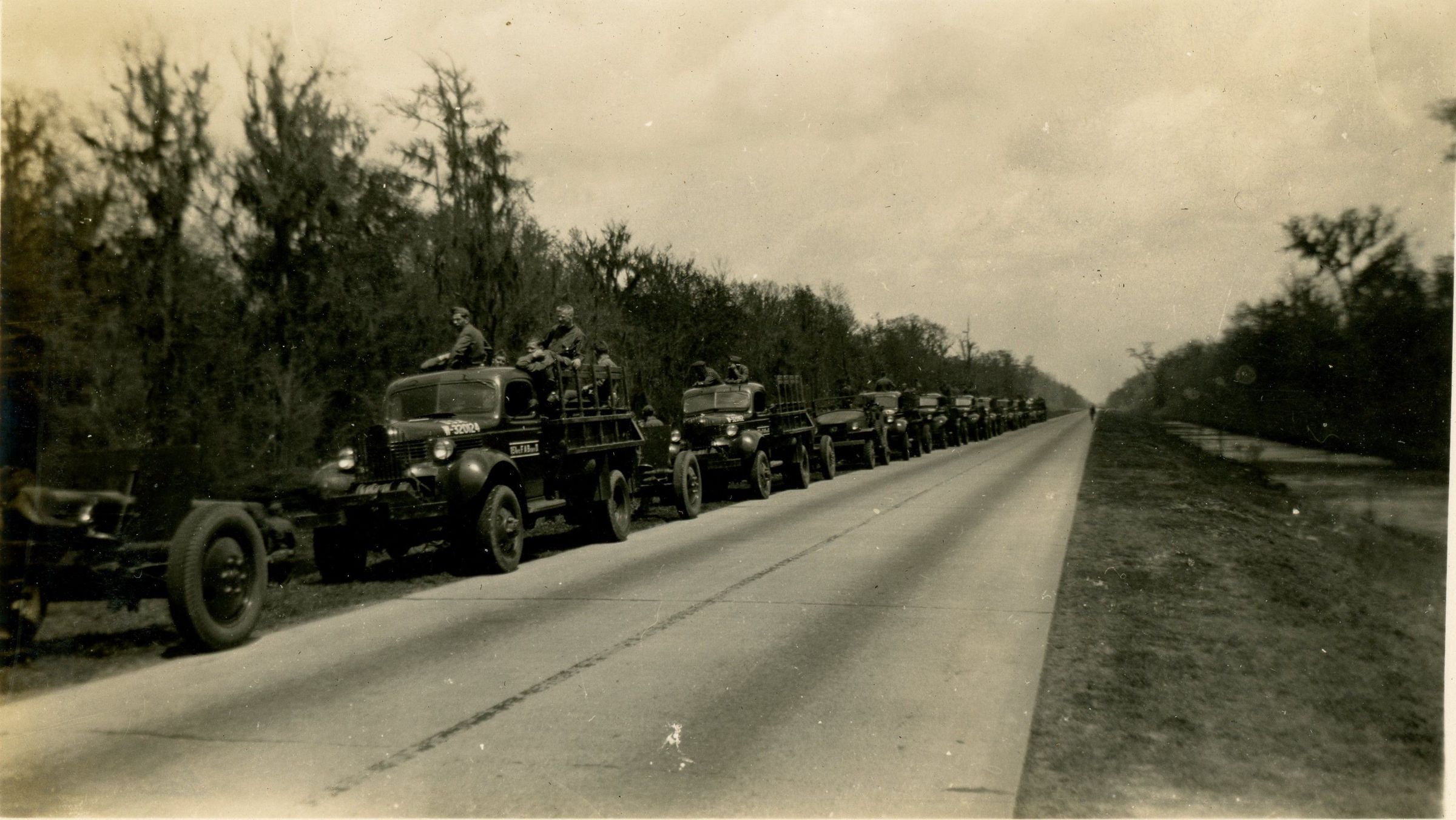 Vehicles used in and out of Camp Claiborne traveling single file.Photograph Details