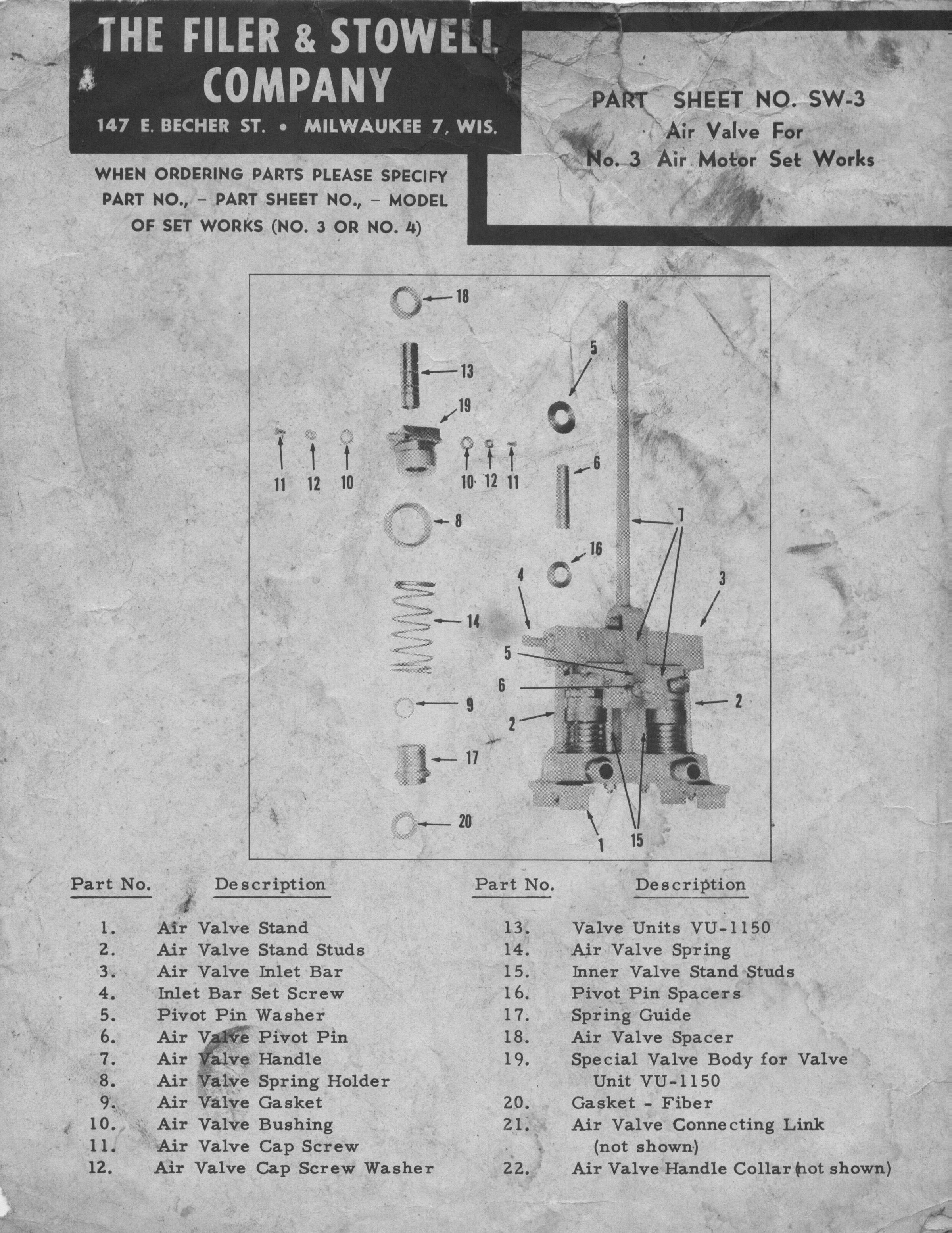 air valves for No. 3 parts; parts: air valve stand, air valve stand studs, air valve inlet star, inlet bar set screw, pivot pin washer, air valve pivot pin, air valve handle, air valve spring holder, air valve gasket, air valve bushing, air valve cap screw, air valve cap screw washer, valve units VU-1150, air valve spring, inner valve stand studs, pivot pin spacers, spring guide, air valve spacer, special valve body for valve unit VU-1150, gasket-fiber, air valve connecting link, and air valve handle collarContext